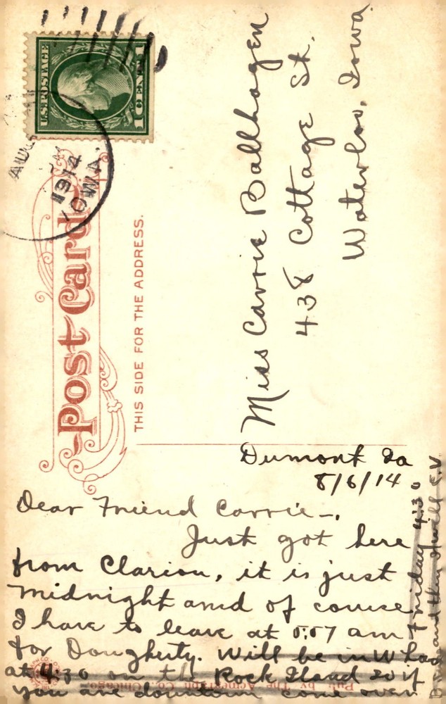 Postcard from Dumont to Carrie Ballhagen, mentioning arrival from Clarion and upcoming visit to Dougherty. Written late at night before departing.