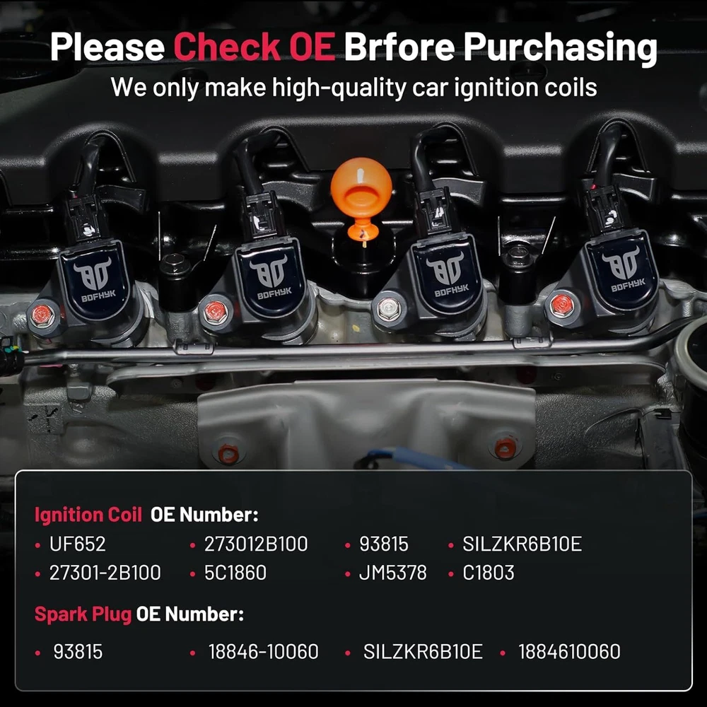 Items Description Terminal Gender:Male Terminal Type:Blade Voltage:12V Connector: 2Pins Part Number/OEM Number 27301-2B100, GN10634, UF652, C-813, 50148 C1803, 21A0111, 178-8509, E1152, 52-2198, 5C1860 Compatible Vehicle(for reference only): Hyundai 2012-2015 Accent GS 2016-2018 Accent LE 2012-2020 Accent SE 2015-2017 Accent Sport 2017 Accent Value Edition 2012-2018 Accent (submodel: GL, GLS, L) 2018-2020 Accent (submodel: Limited, SEL) 2019-2020 Accent (submodel: Essential, Preferred, Ultimate) 2012 Veloster Base 2013-2017 Veloster Base 2014-2015 Veloster RE:FLEX 2017 Veloster Value Edition 2015-2016 Veloster (submodel: SE, Tech) Kia 2012-2013,2020 Rio LX+ 2018-2020 Rio S 2012-2017 Rio SX 2012-2019 Soul Base 2014-2019 Soul LX The package includes: 4 X Ignition Coils+ 4X Spark Plug