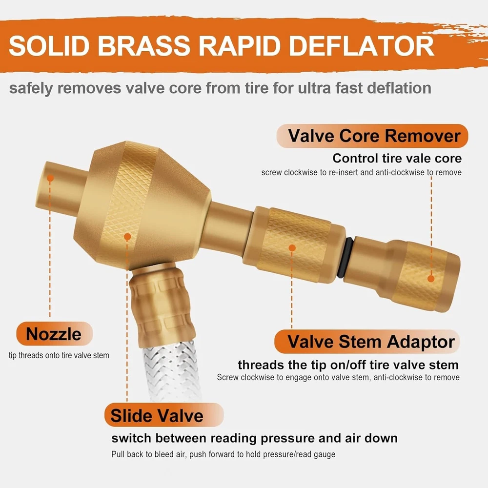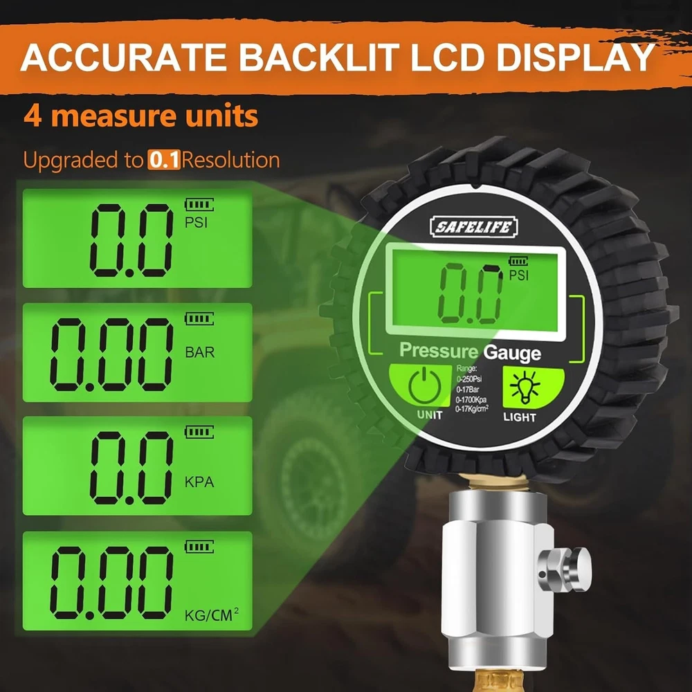 4x4 Digital Tire Deflator kit๏ผProfessional Tire Pressure Gauge 250PSI, Rapid Air Description : ๐๐๐ ๐๐๐๐ ๐ ๐๐๐ & ๐๐๐๐๐๐๐๐ : SAFELIFE heavy-duty 4x4 tire deflator is a precisely designed, all-in-one system that removes the valve core for fastest deflation and allows you to stay in control to accurately attain your desired tire pressure for certain tire traction. Simply just slide the Deflator and you could switch from Instant-Pressure-Reading and Keep-On-Deflating. ๐๐๐๐๐๐๐๐ & ๐๐๐๐๐๐๐ : The digital tire deflator features a bright LCD backlit screen for perfect visibility anytime. Displays large numbers in 4 units by PSI, KPA, Bar, and Kg/cmยฒ. Accurately measures a range from 0-250 PSI (0-17Bar; 0-1700Kpa; 0-17kg/cmยฒ). ๐๐๐๐๐๐ ๐๐ ๐๐๐๐๐๐๐ : The slide of tire deflator operates smoothly without any binding. Simply just slide the collar in to read pressure, slide the collar back out to keep deflating. ๐๐๐๐๐ ๐๐๐๐๐๐๐๐๐ & ๐๐๐๐๐๐๐ : This Air Down Tire Deflator is made of 12-inch braided steel hose, premium brass components and large hexagonal stem. This robust and durable precision tire deflator tool is also surrounded by a rubber bump guard to protect against drop damage and is easy to grip. ๐๐๐๐๐๐ ๐๐๐๐๐๐๐๐๐๐๐ : Our tire deflator is compatible with various vehicles, including motorcycles, bikes, trucks, SUVs, and off-road vehicles. It is a must-have accessory for all overland adventure and off-road trips, ensuring optimal tire pressure for improved traction and overall performance in various terrains.