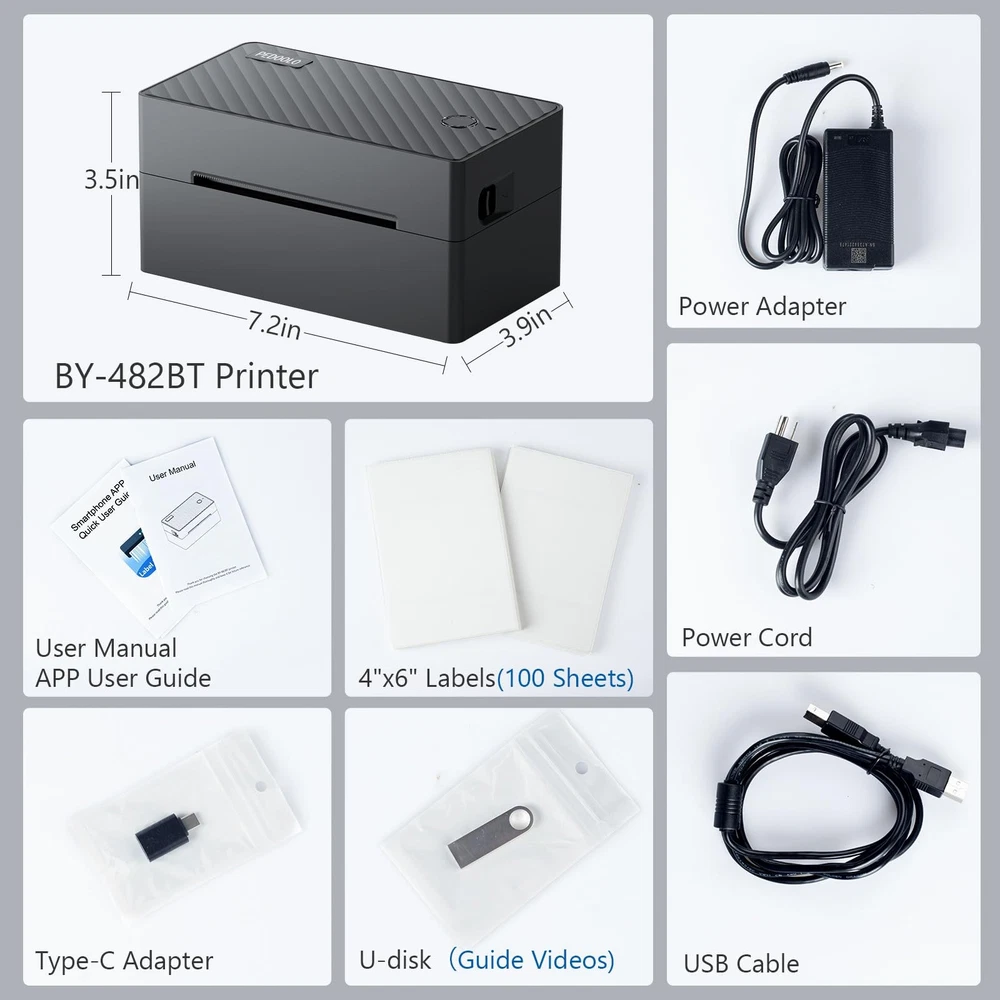 thermal label printer shipping label printer thermal label printer for shipping packages 【Wireless & Support for Multi-Systems】thermal printer prints wirelessly. For iPhone and Android, download the App “Label Expert” and connect via Bluetooth. For Windows, you can also print via Bluetooth. Windows, Mac, and Chromebook support USB connection. Chromebook users can directly print by adding the extension "Shipping Printer". (Note: Mac and Chromebook do not support Bluetooth printing.) 【Versatile Compatibility for Platforms & Labels】The shipping label printer, a great assistant for online small business, is compatible with almost all shipping and e-commerce platforms, including Amazon, eBay, UPS, FedEx, Shopify, etc. (Note: Save as PDF from platforms) Besides, the label printer supports any brand thermal labels with 1.57" to 4.1" width, allowing you to customize and print product labels, barcode labels, thanks stickers, etc. (Note: Customize labels via smartphone APP) 【High-res, High-speed and Massive-Volume】With a Japanese upgraded thermal print head, the label printer for shipping packages prints up to 150mm/s (72 sheets 4x6 labels/min) and can effortlessly print over 50 kilometers (over 500,000 shipping labels). 203 DPI makes labels come out clearly for easy reading and scanning. The shipping label printer for small business does achieve ink-free, mess-free, cost-effective, and time-saving. 【Small & Smart & Efficient】The thermal label printer features automatic calibration & positioning, intelligent paper return, and intelligent self-test, avoiding paper waste or jams. It achieves efficiency with just one click. With compact size, the bluetooth thermal label printer can be easily used at home, office, and warehouse. 【Reliable Technical Support】team is available to assist you via phone, online chat, email, remote-desktop, ensuring one-minute setup and hassle-free operation. Rest assured with our lifetime technical support and 10-year warranty. (Note: 100 sheets labels and a U-disk containing guided videos are provided in the package.)