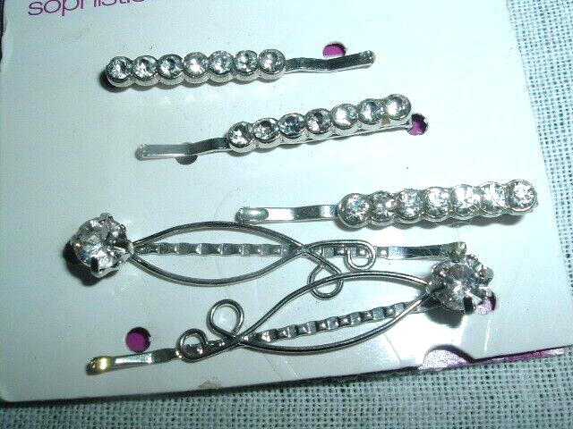A set of 5 silvertone and white rhinestone bobby pins. Still on original "Conair" card, in excellent condition. We combine ship