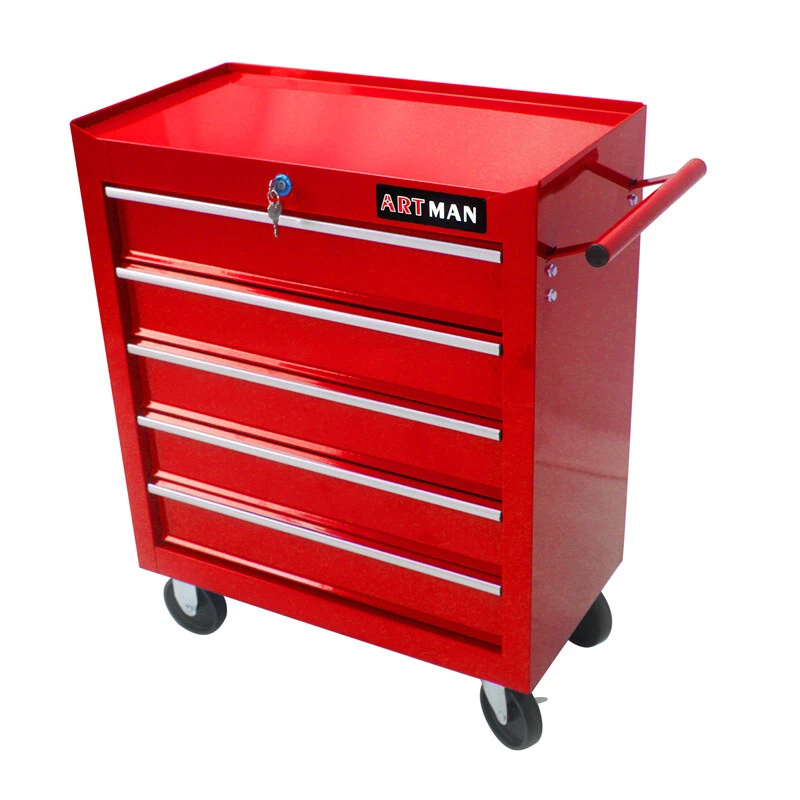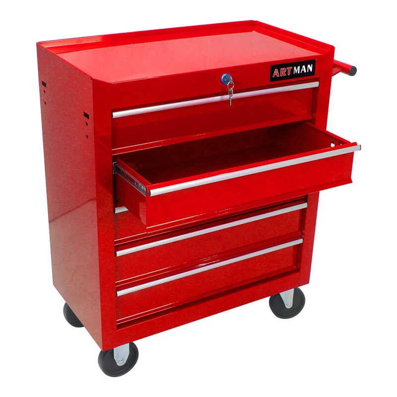 5 Drawers Rolling Tool Chest Tool Storage Cabinet Garage Cart Workshop w/ Wheels About this item : The ARTMAN tool trolley is equipped with a total of 5 drawers . The tool box is also lockable and can be used as a removable, attachable and mobile case attachment The opening and closing of the drawers of the tool cabinet is very gentle thanks to the ball-bearing drawers. The robust and powder-coated steel construction is used for high wear resistance. This assembly trolley has 4 steering wheels, 2 of which with parking brakes, so you can move the trolley freely in the garage, but also stop in one place Specification: Color: RED/BLACK/BLUE Metrial: Cold Rolled Steel Surface Finish: Powder Coating Casters: 4" Casters (2PCS with brake and 2PCS without brake) Size : L616mm(24.25inch)*W330mm(13inch)*H745mm(29.33inch) 5 drawers Dimension L511mm(20.11inch)*W305mm(12inch)*H85mm(3.3inch) Net Weight: 22KGS/48.5LBS