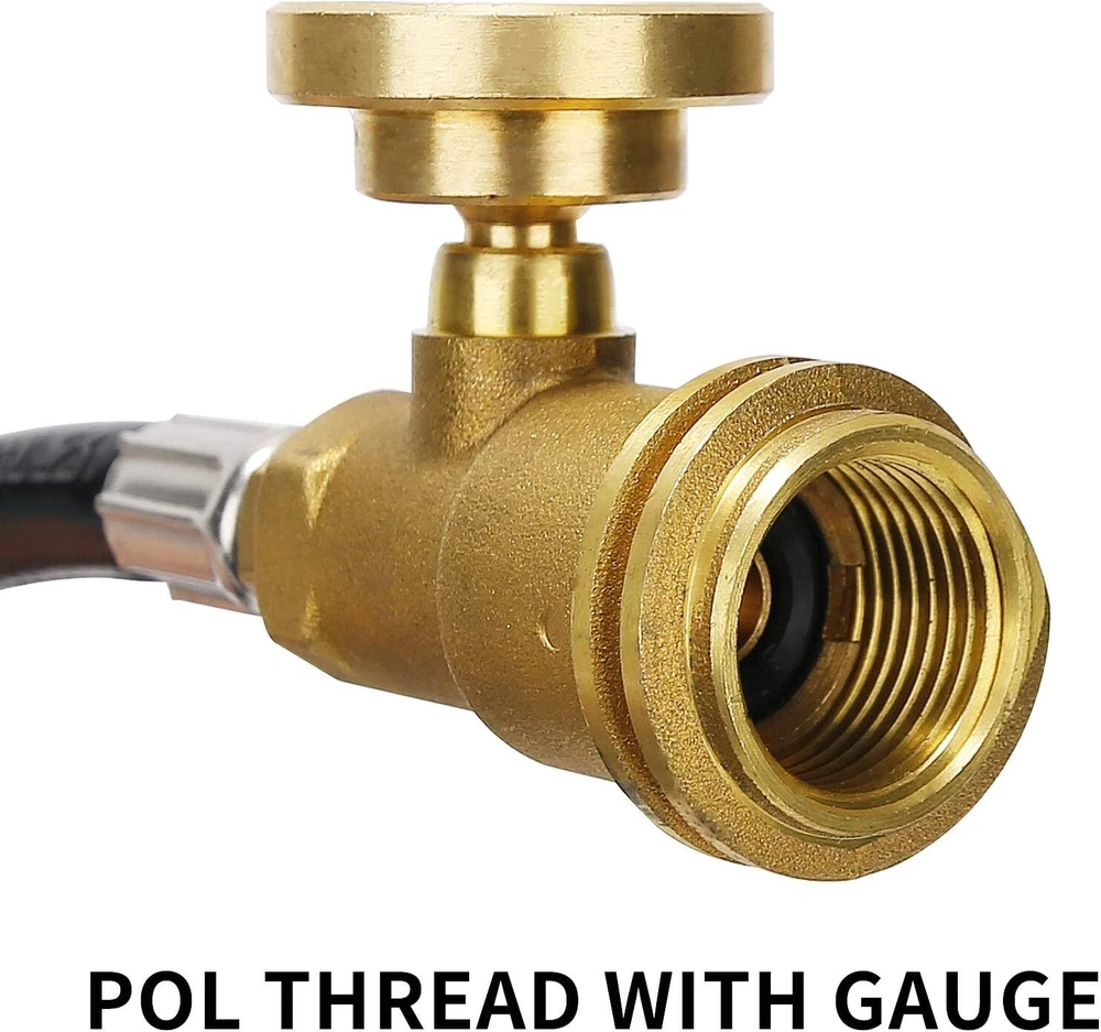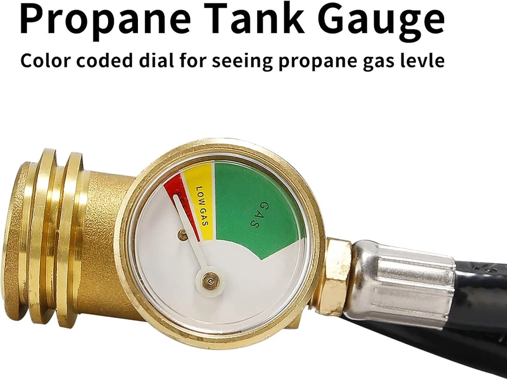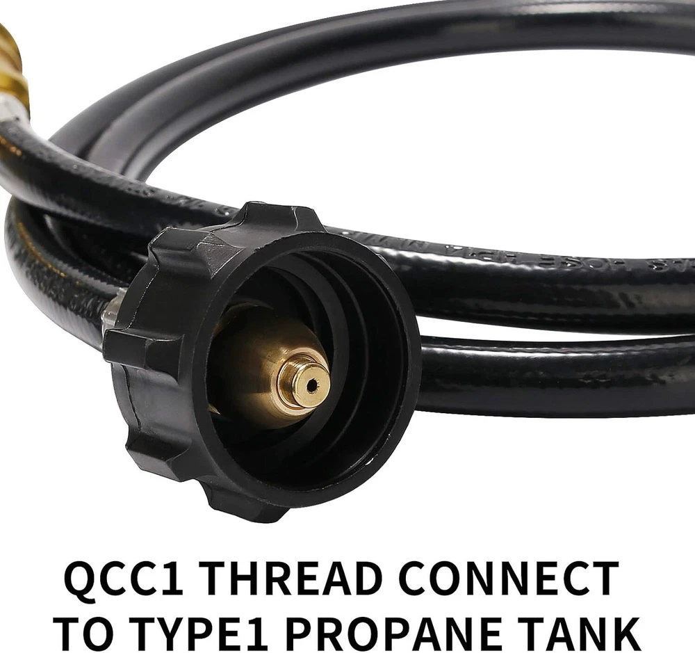 5 Feet Propane Tank Extension Hose with GaugeConverts POL LP Tank to QCC1 for. 【UNIVERSAL】Compatible with all appliances with a QCC1 / type1 connection and up to 40 lb. 【EASY TO READ】3 Color-coded dial with glow in the dark,to know how the propane level goes. 【CONNECTOR TYPE】Inlet ,QCC1/Type 1; Outlet ,POL female thread with propane gauge. 【STURDY CONSTRUCTION】Solid brass construction ,5 feet durable rubber hose. 【SAFE】Built in leak detector to restrict flow in case of hose or grill malfunction.