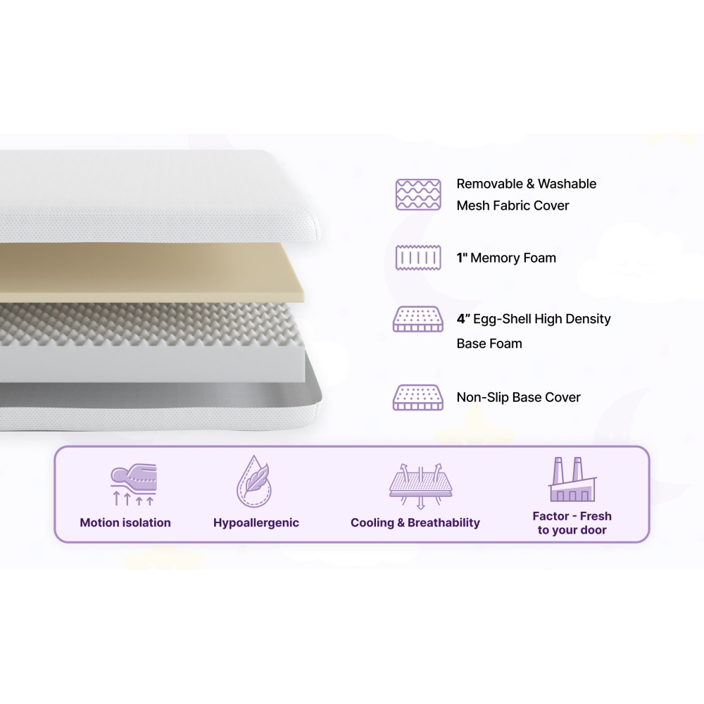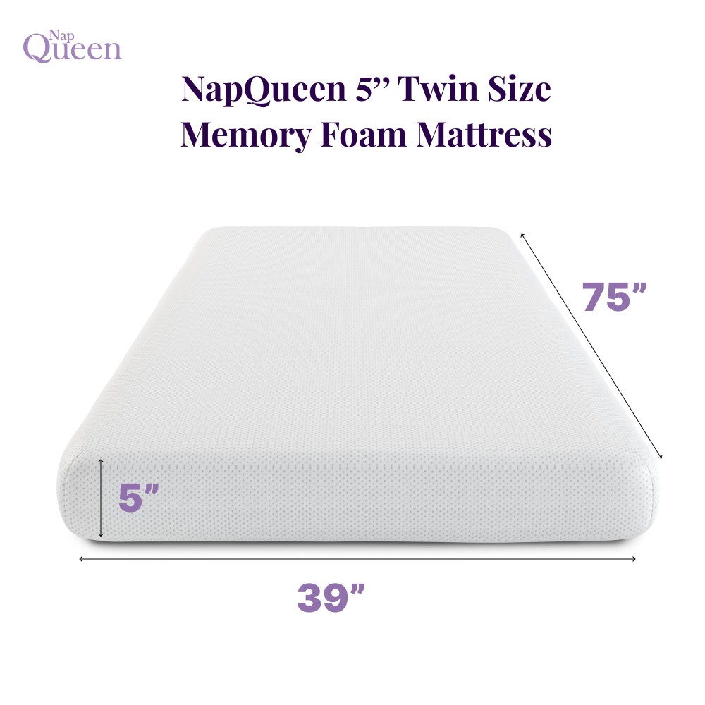 Why This Mattress Stands Out Designed for versatility and comfort, this 5-inch Twin size memory foam mattress works for kids, teens, and adults—perfect for bunk beds, trundles, guest rooms, or tight spaces where every inch counts. Key Features for Better Sleep Responsive Memory Foam Layer : Conforms to your body’s natural curves to ease pressure points, delivering personalized support for restful nights. High-Density Base Foam : Ensures long-term stability, prevents sagging, and keeps the mattress in shape through daily use. Soft Breathable Cover : Boosts airflow to keep the sleep surface cool and fresh, even on warm evenings. Low-Profile 5-Inch Design : Fits seamlessly in space-saving setups without compromising on comfort. Dimensions & Weight Assembled Size : 39 inches (length) × 75 inches (width) × 5 inches (height) – compact yet roomy for a Twin size. Product Weight : 19 pounds – lightweight for easy moving and setup. Packaging Size : 11 inches × 11 inches × 41 inches (22 pounds) – ships in a convenient box, ready to unroll and expand. Risk-Free Purchase Guarantees 1-Year Manufacturer’s Warranty : Backed by quality craftsmanship—we stand behind the durability of this mattress. 30-Day Free Return Policy : Not satisfied? Return it within 30 days for a full refund, no questions asked. Perfect For Growing kids, college students, guest bedrooms, or anyone needing a comfortable, space-efficient mattress in a clean white finish.
