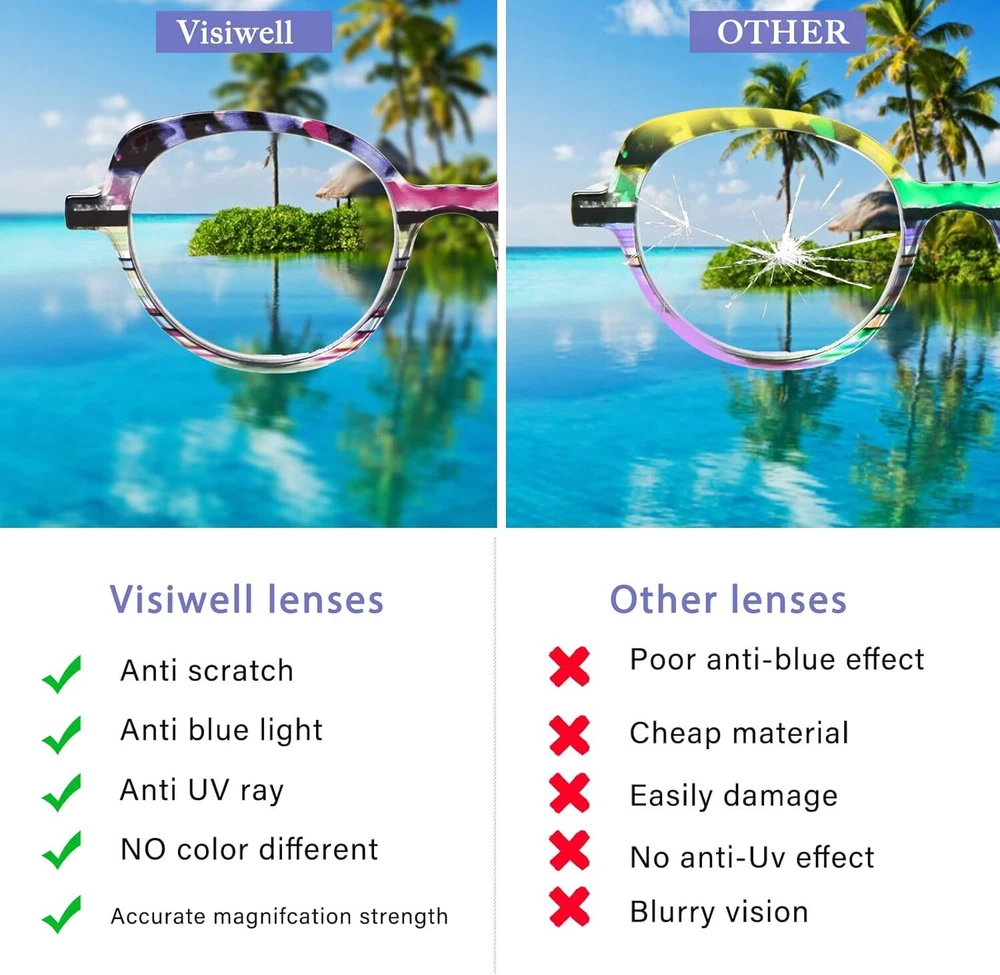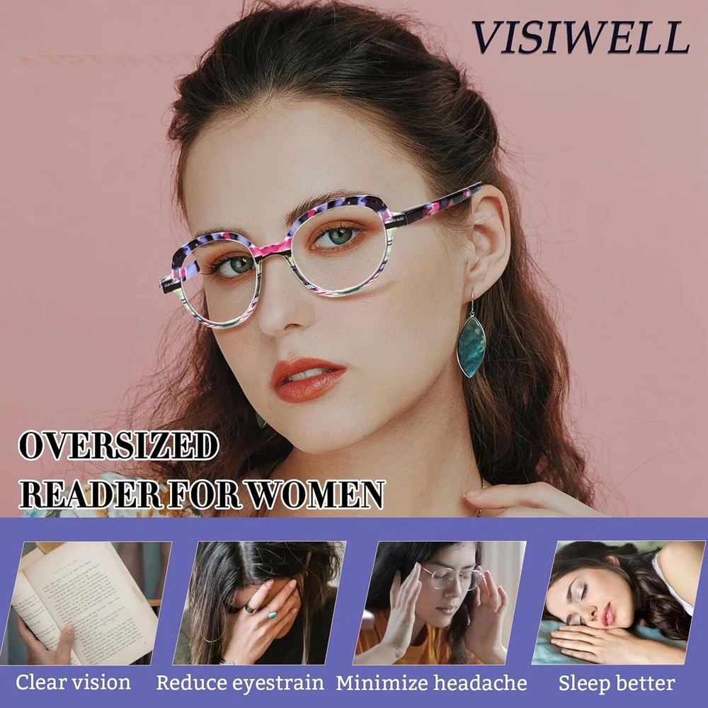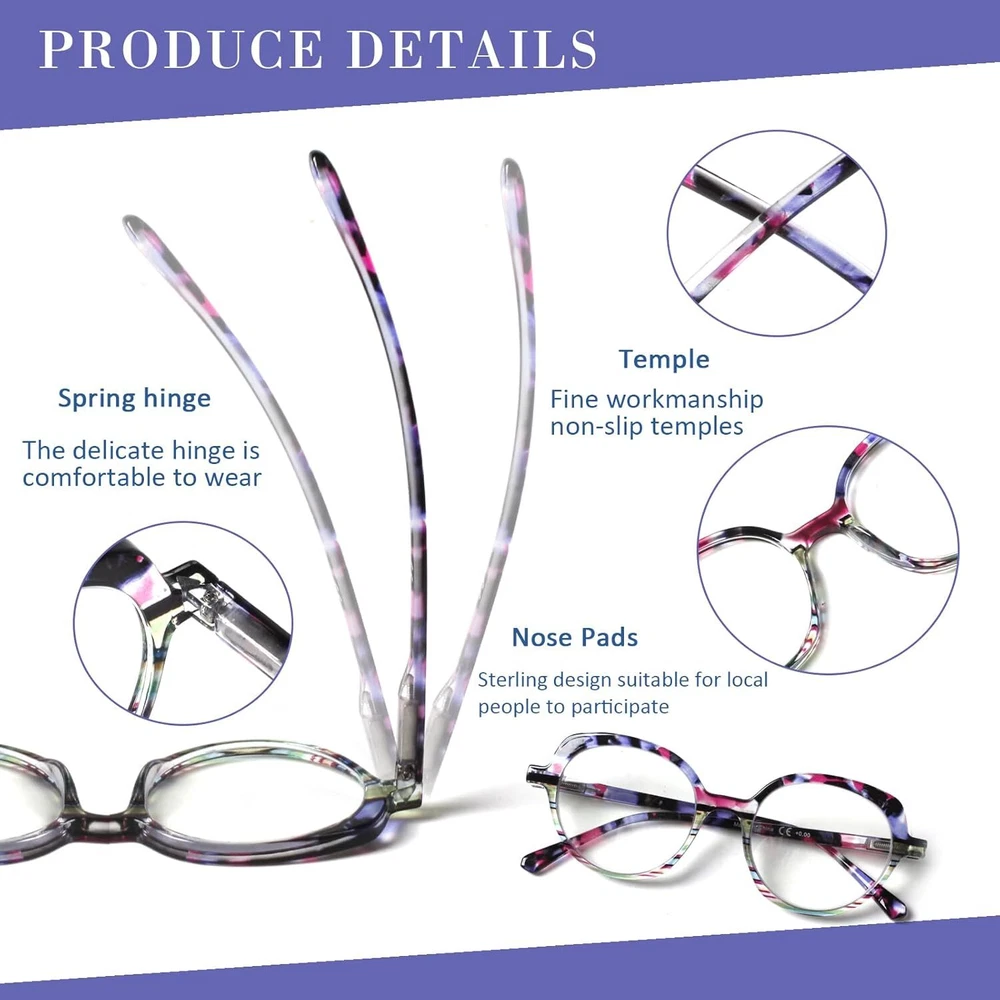 Product Description Visiwell brand mainly develops and designs all kinds of anti-blue glasses, reading glasses, sunglasses and so on.Using high-quality materials and excellent production technology, we provide customers with a variety of high-quality glasses. With a stylish cat eye design and colorful patterns, these reading glasses are suitable for women of all ages.High quality anti-blue light reading lens, effectively isolate UV and radiation, filter harmful blue light, suitable for computer, TV, mobile phone and other digital electronic products, while maintaining high-definition and clear vision, but also reduce eye fatigue.The flexibility of a high-quality spring hinge reduces potential damage to your glasses and also provides you with additional comfort during wear.Our brand is committed to bringing practical, more comfortable glasses to every customer, focusing on protecting vision health.