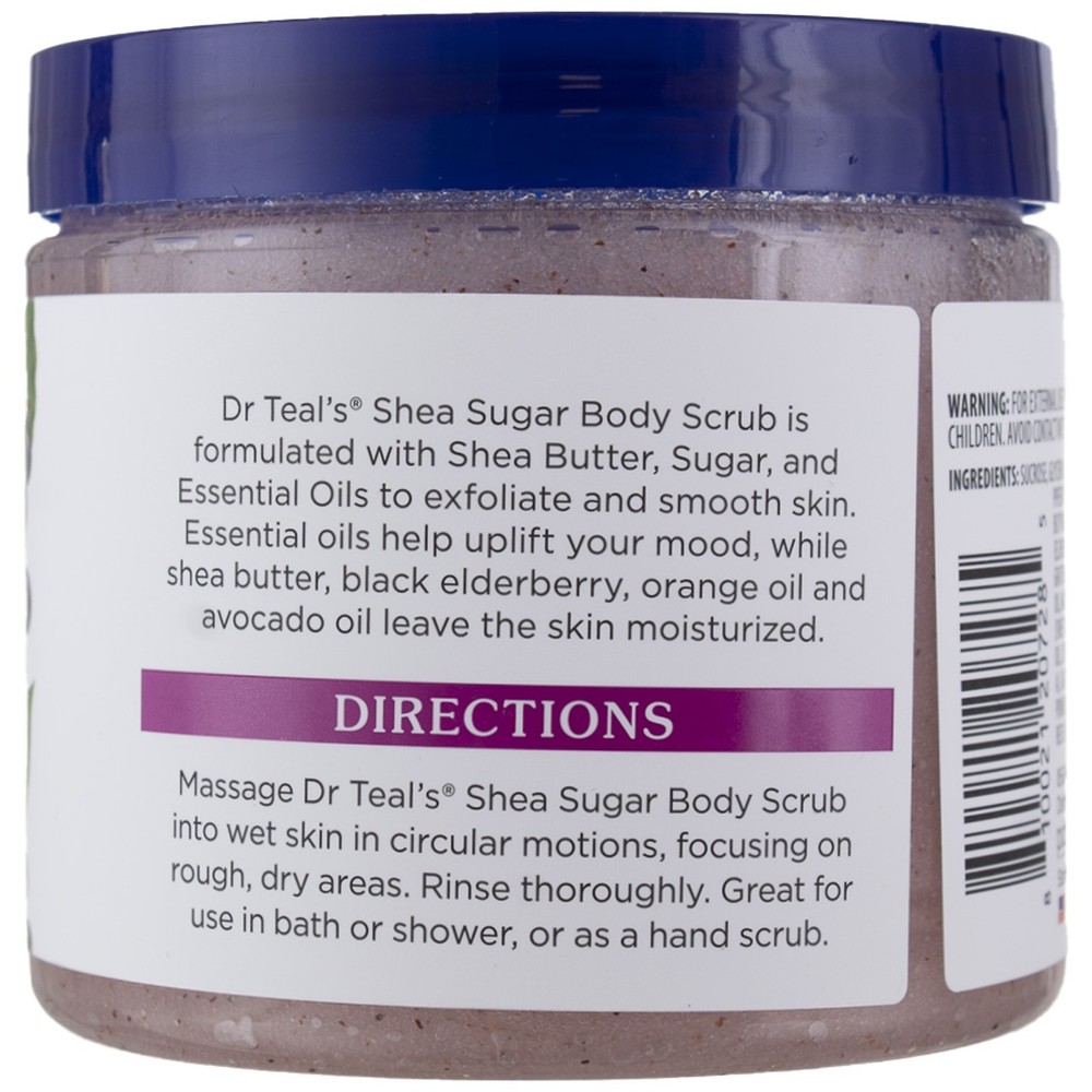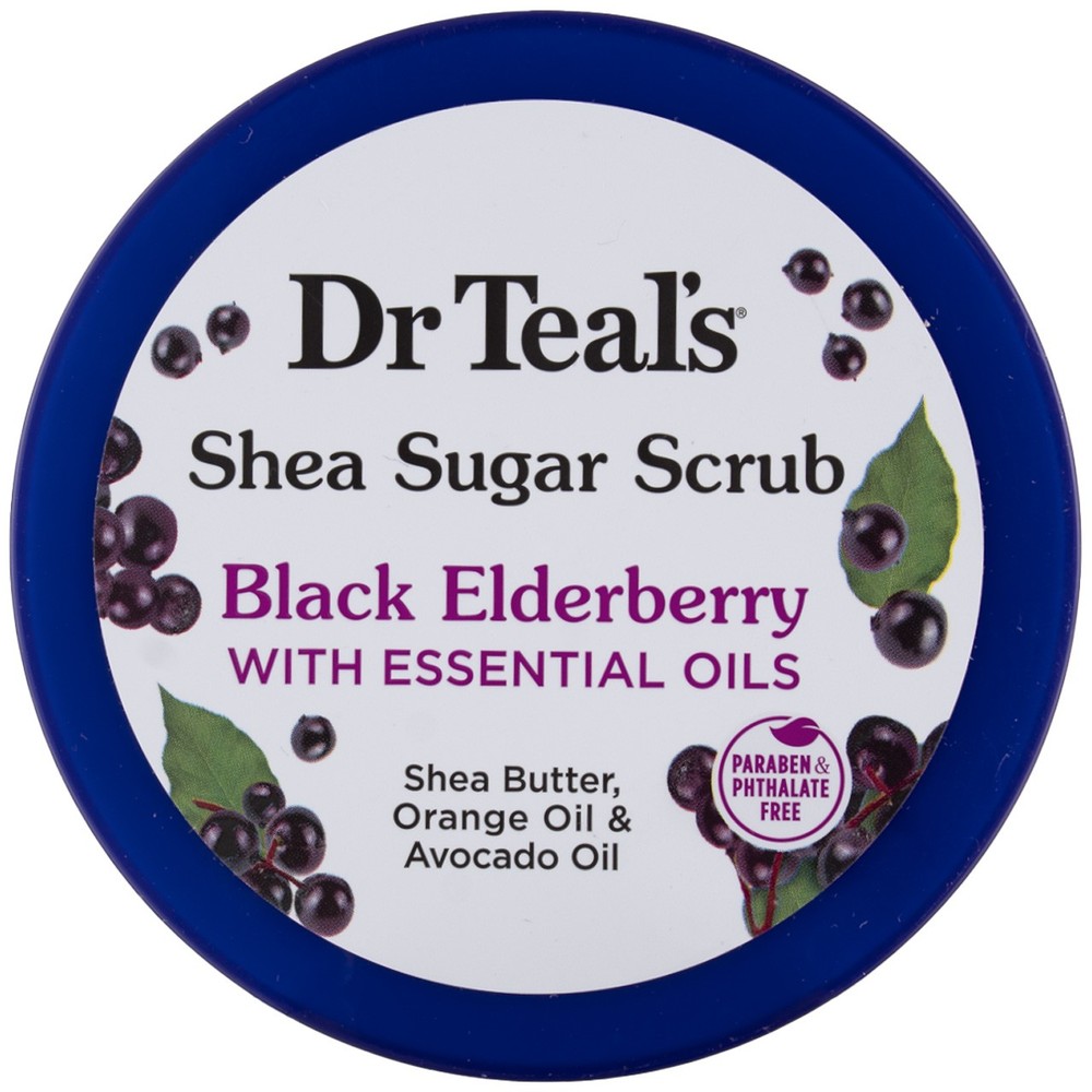 Product Description Relax your mind with new Dr. Teal's Shea Sugar Scrubs. Packed with essential oils and shea butter, they are great for exfoliating the body and keeping your skin feeling both refreshed and soft. Essential oils help uplift your mood, while shea butter, black elderberry, orange oil, and avocado oil leave the skin moisturized. Dr. Teal's Sugar Scrubs are great for use in the bath or shower or as a hand scrub Dr. Teal's Black Elderberry Shea Sugar Body Scrub - 19oz - Dr. Teal’s Shea Sugar Body Scrub is formulated with Shea Butter, Sugar, and Essential Oils to exfoliate and smooth skin - Dr. Teal's Shea Sugar Scrubs exfoliate for softer skin and help relieve dry spots - Essential oils help uplift your mood, while shea butter, black elderberry, orange oil, and avocado oil leave the skin moisturized - Dr. Teal's Sugar Scrubs are, vegan-friendly, and paraben and phthalate-Free - A product has an independent third-party certification on the pack or unqualified on-pack marketing claim relating to being cruelty-free and/or not tested on animals Ingredients Sucrose, Glycerin, Polysorbate 20, Silica, Fragrance (Parfum), Mentha Piperita (Peppermint) Oil, Pogostemon Cablin Oil (Patchouli), Butyrospermum Parkii (Shea) Butter, Sambucus Nigra (Elderberry) Seed Oil, Citrus Sinensis (Orange) Oil, Persea Gratissima (Avocado) Oil, Oenothera Biennis (Evening Primrose) Oil, Macadamia Ternifolia Seed Oil, Prunus Amygdalus Dulcis (Sweet Almond) Oil, Carthamus Tinctorius (Safflower) Seed Oil, Cocos Nucifera (Coconut) Oil, Retinyl Palmitate (Vitamin A), Ascorbic Acid (Vitamin C), Juglans Regia (Walnut) Shell Powder, Phenoxyethanol, Ethylhexylglycerin, Sorbic Acid, Red 33 (Ci 17200), Blue 1 (Ci 42090) Product Description Relax your mind with new Dr. Teal's Shea Sugar Scrubs. Packed with essential oils and shea butter, they are great for exfoliating the body and keeping your skin feeling both refreshed and soft. Essential oils help uplift your mood, while shea butter, black elderberry, orange oil, and avocado oil leave the skin moisturized. Dr. Teal's Sugar Scrubs are great for use in the bath or shower or as a hand scrub Dr. Teal's Black Elderberry Shea Sugar Body Scrub - 19oz - Dr. Teal‚Äôs Shea Sugar Body Scrub is formulated with Shea Butter, Sugar, and Essential Oils to exfoliate and smooth skin - Dr. Teal's Shea Sugar Scrubs exfoliate for softer skin and help relieve dry spots - Essential oils help uplift your mood, while shea butter, black elderberry, orange oil, and avocado oil leave the skin moisturized - Dr. Teal's Sugar Scrubs are, vegan-friendly, and paraben and phthalate-Free - A product has an independent third-party certification on the pack or unqualified on-pack marketing claim relating to being cruelty-free and/or not tested on animals Ingredients Sucrose, Glycerin, Polysorbate 20, Silica, Fragrance (Parfum), Mentha Piperita (Peppermint) Oil, Pogostemon Cablin Oil (Patchouli), Butyrospermum Parkii (Shea) Butter, Sambucus Nigra (Elderberry) Seed Oil, Citrus Sinensis (Orange) Oil, Persea Gratissima (Avocado) Oil, Oenothera Biennis (Evening Primrose) Oil, Macadamia Ternifolia Seed Oil, Prunus Amygdalus Dulcis (Sweet Almond) Oil, Carthamus Tinctorius (Safflower) Seed Oil, Cocos Nucifera (Coconut) Oil, Retinyl Palmitate (Vitamin A), Ascorbic Acid (Vitamin C), Juglans Regia (Walnut) Shell Powder, Phenoxyethanol, Ethylhexylglycerin, Sorbic Acid, Red 33 (Ci 17200), Blue 1 (Ci 42090) Suggested Use Massage Dr Teal\s Shea Sugar body scrub into wet skin in circular motions, focusing on rough, dry areas. Rinse thoroughly. Great for use in bath or shower, or as a hand scrub Warnings FOR EXTERNAL USE ONLY. FOR ADULT USE ONLY. KEEP OUT OF REACH OF CHILDREN. AVOID CONTACT WITH EYES. IF CONTACT OCCURS, FLUSH WITH WATER Disclaimer The product descriptions and instructions provided by vitabox.com are for informational purposes only and are qualified in their entirety by the information available from manufacturers of the products. You should carefully read all product packaging, and contact the manufacturer with any questions before using a product. While we endeavor to ensure that product descriptions are current, manufacturers sometimes change their products. We are not liable for inaccuracies or misstatements about products. We do not provide medical advice or recommendations. You should not use the information provided by vitabox.com for diagnosing or treating a health problem or disease. If you have or suspect that you have a medical problem, immediately contact your health care provider. Information and statements regarding dietary supplements have not been evaluated by the Food and Drug Administration or any other government agency and are not intended to diagnose, treat, cure, or prevent any disease.