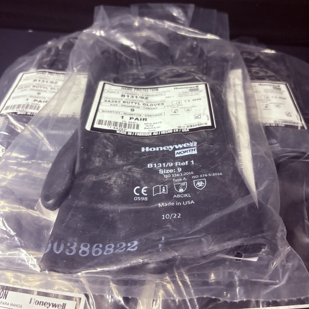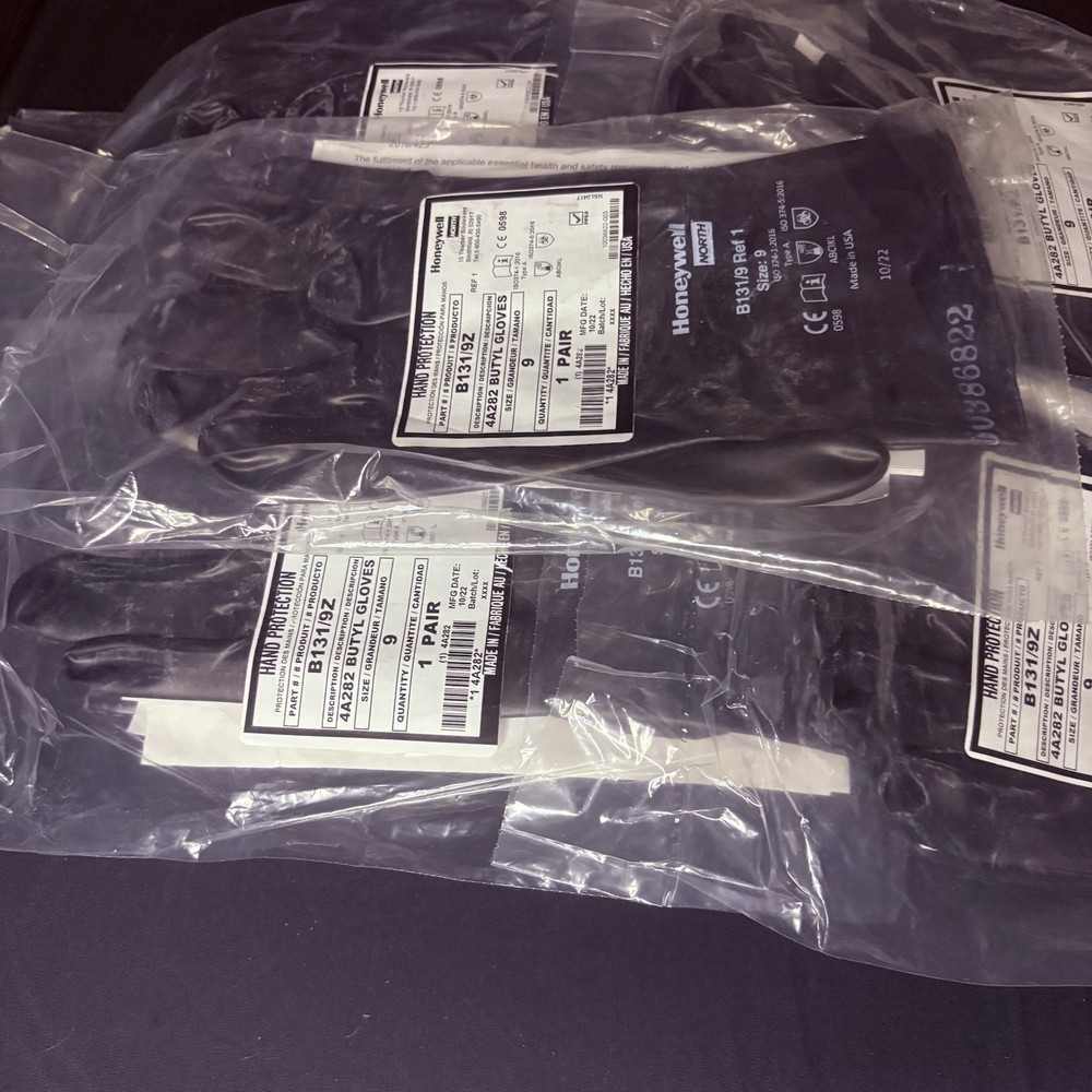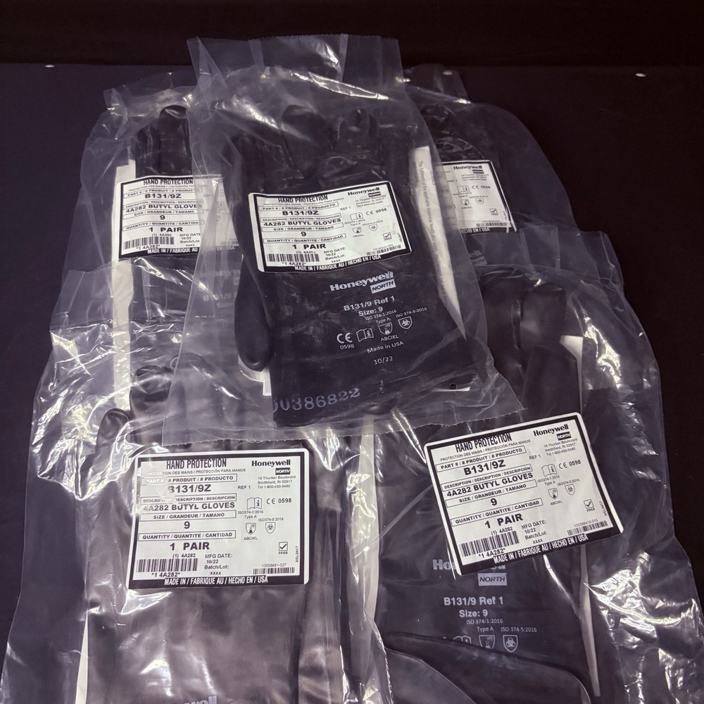 The product is a 5 pack of Honeywell Butyl Gloves by North, specifically the model B131/9. These chemical-resistant gloves are designed with a 13 mil thickness for added protection. Made in the United States, the gloves are available in size 9 and provide a reliable option for personal protective equipment in various industrial and facility maintenance settings.