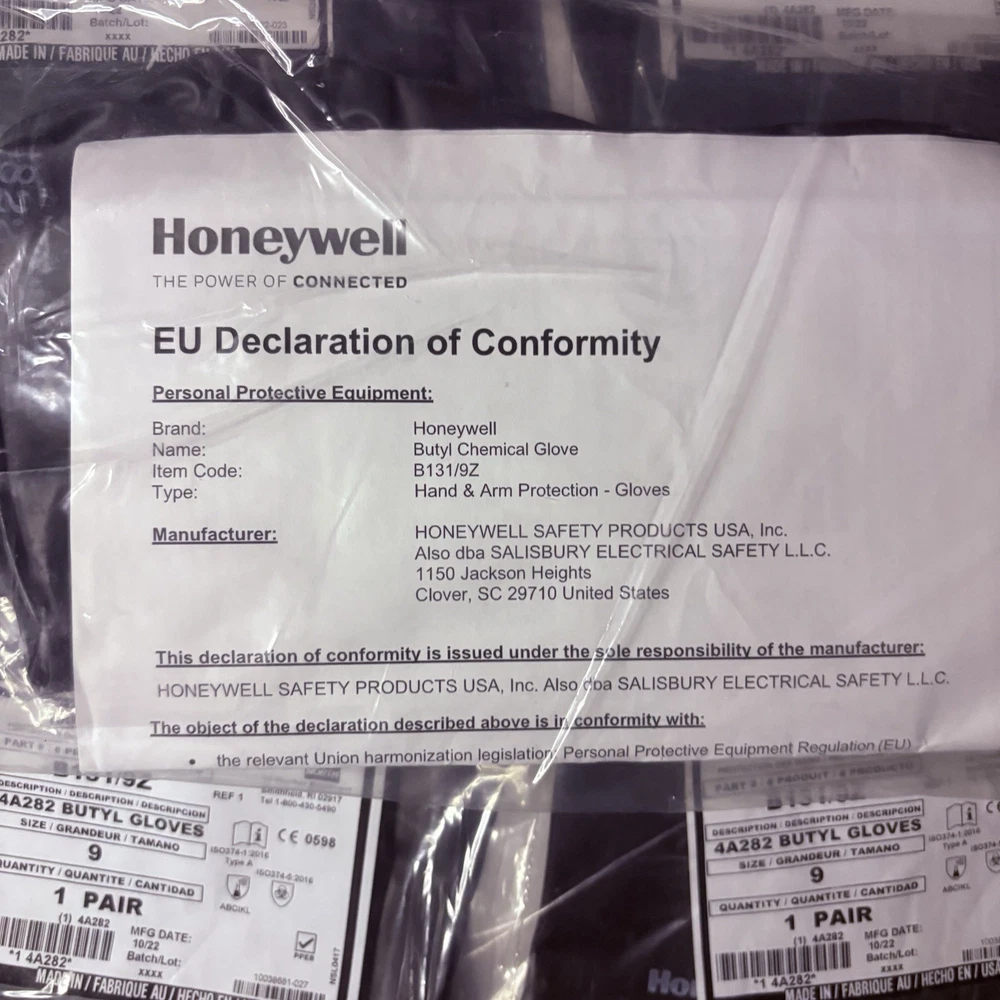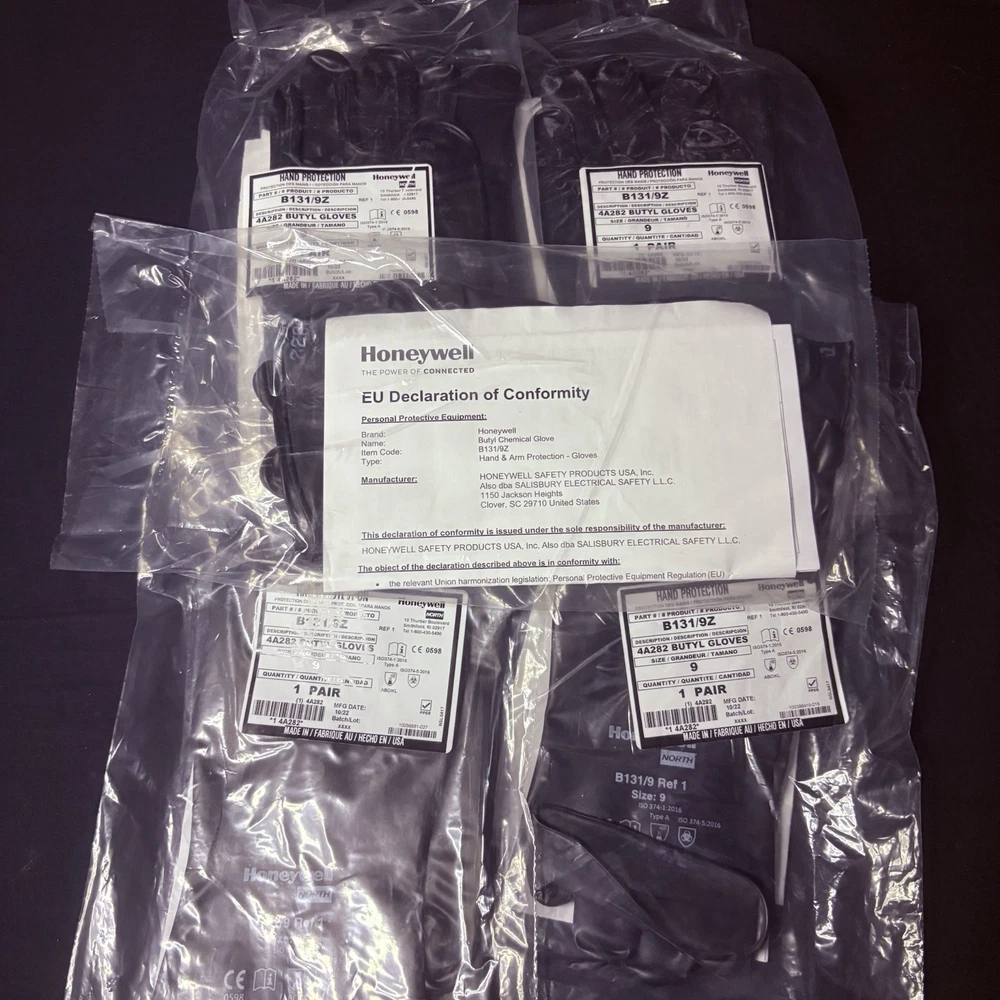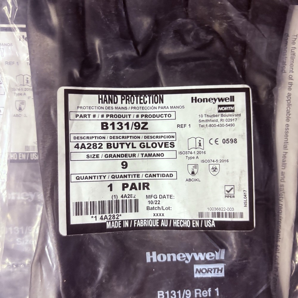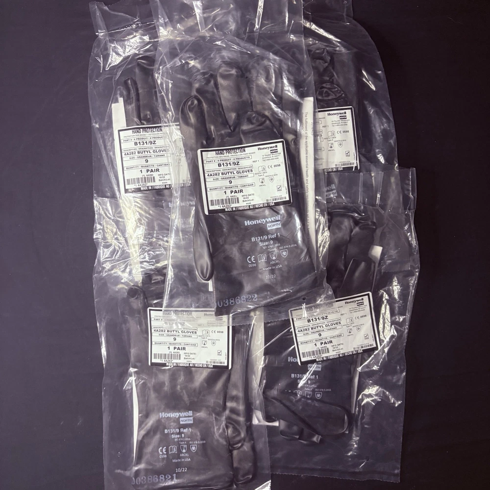 The product is a 5 pack of Honeywell Butyl Gloves by North, specifically the model B131/9. These chemical-resistant gloves are designed with a 13 mil thickness for added protection. Made in the United States, the gloves are available in size 9 and provide a reliable option for personal protective equipment in various industrial and facility maintenance settings.