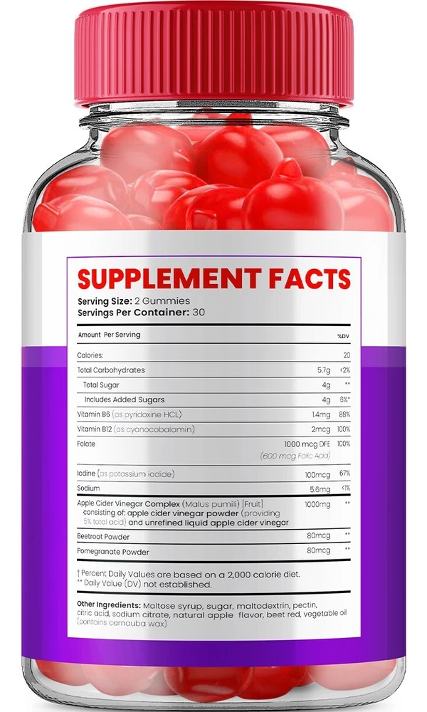 Brand: Keto Glow Features: All Natural Main Purpose: Weight Management Formulation: Gummy Active Ingredients: Vitamin B12 Department: Adult, Unisex Country of Origin: United States gtin13: 612461108661 Type of Diet: Keto UPC: 612461108661 Ingredients: Apple, Apple Cider Vinegar, Citric Acid, Iodine, Pectin, Pomegranate, Red Beet, Vitamin B12, Vitamin B6 Flavor: Apple