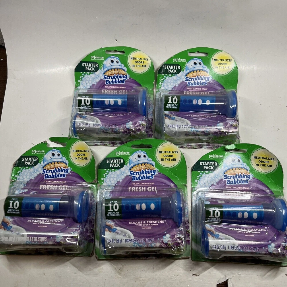 5 Pack Scrubbing Bubbles Fresh Gel Toilet Cleaning Stamp Glade Lavender Meadow Packs may have slight damage but won't effect product.