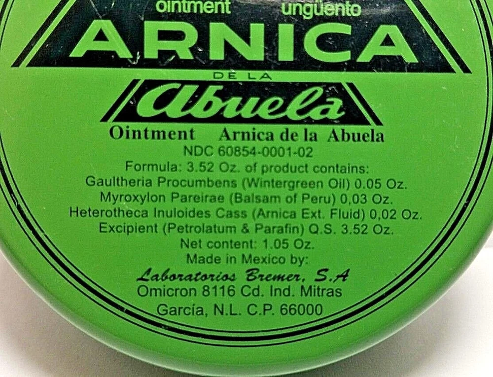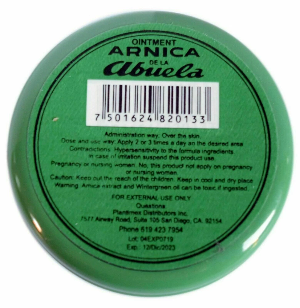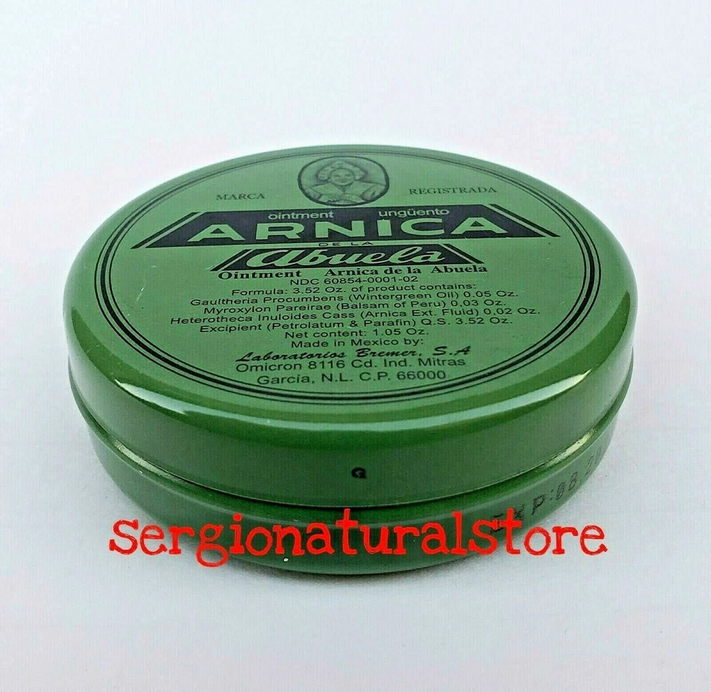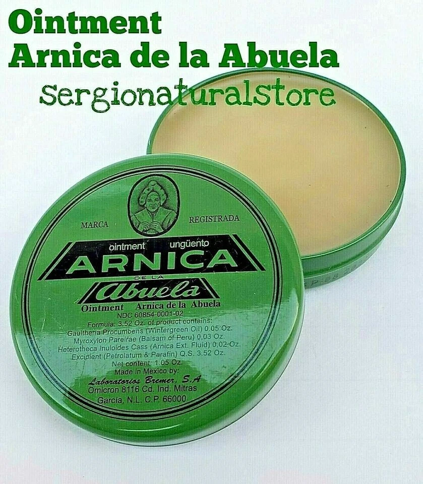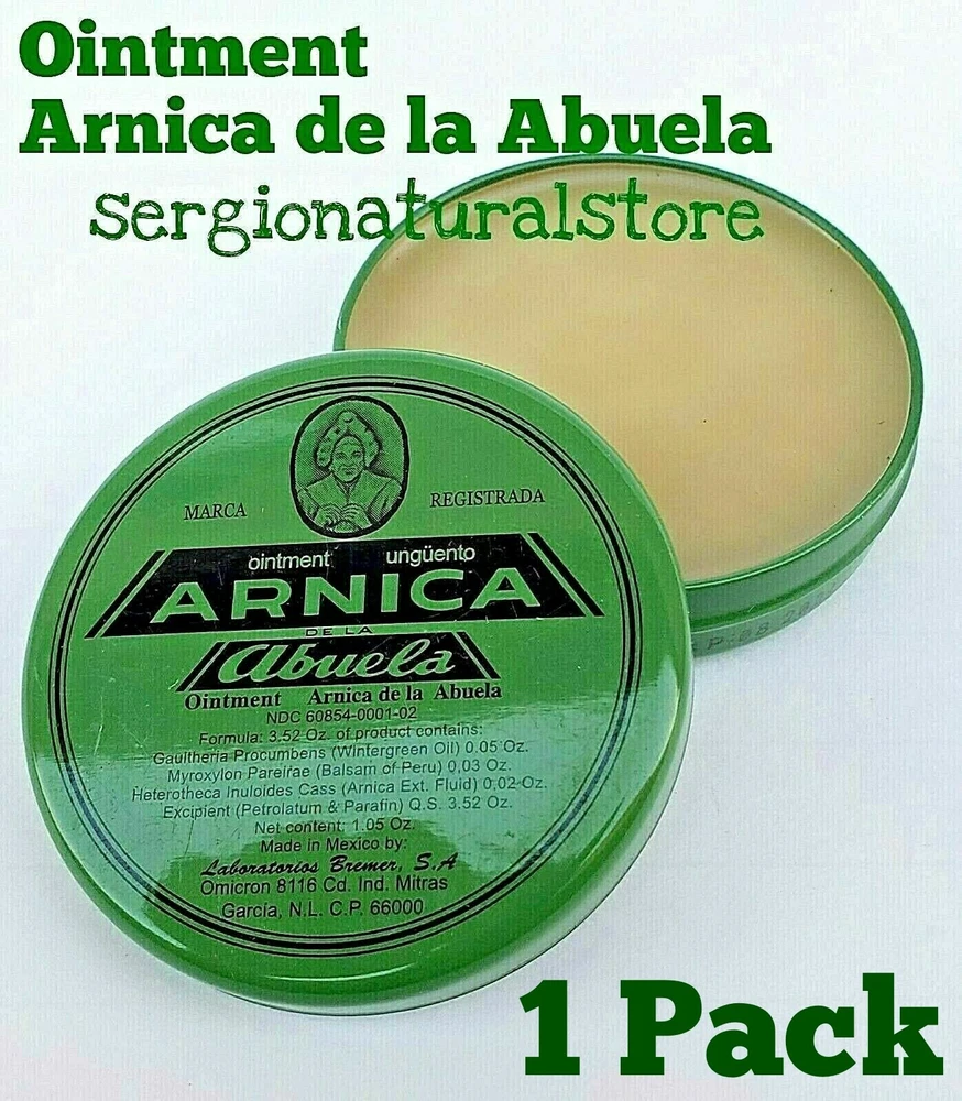 5 Packs Arnica de la Abuela Ointment 30 grs each Made in Mexico A tried and true herbal remedy used widely in Mexico and Latin America. Application: External Suggested Use: Apply to affected area two to three times a day. Disclaimer: Not for internal use. 100% Original Product Thank you for your support and preference, I invite you to see my other sales items. Buy with confidence !!You shipments is 100% Guaranteed!! 5 Packs Arnica de la Abuela Ungüento 30 grs c/u Hecho en Mexico. Un remedio herbal probado y verdadero usado ampliamente en México y América Latina. Aplicación: Externa Uso sugerido: aplicar en el área afectada dos o tres veces al día. Descargo de responsabilidad: No es para uso interno. Producto 100% Original Muchas Gracias por su apoyo y preferencia, lo invito a mirar mis otros artículos de venta. Compre con confianza !!Su envío es 100% Garantizado!!