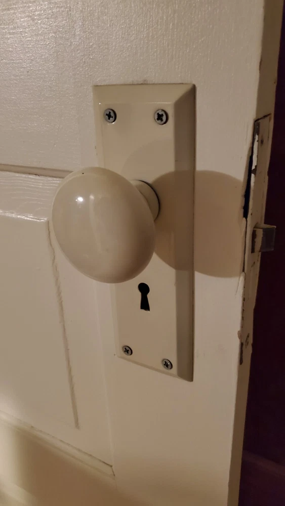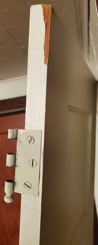 This door is a special 7 foot tall 17 7/8" wide and actual 1 Inch thick. Solid wood. FROM A home over 105 years old. This appears to be original. 5 panel and 1 of 1 if you've shopped these. With original door knobs skeleton key hole (no key). Panels measure around 9 3/4" h x 10 3/4" wide.........34" from bottom of the door to door knob center and 2 3/8" to center of knob. Originally a left hand swing but can be altered by most craftsman. Door knobs will be shipped off along with any hardware sticking out to minimize damage. Enjoythis! ......................................................................SHIPPING TIME: That day label and shipped depending on weekend or holiday hours. Could arrive in 1 week and 2 weeks latest depending on shipper. Sold asis good quality door painted white