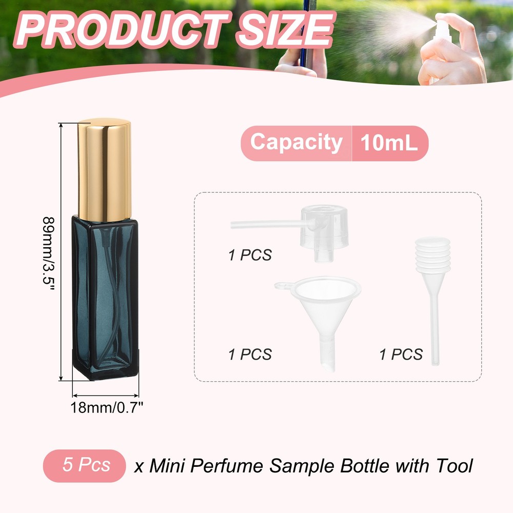 Document Description:Material: The travel bottles are made of durable and refillable Glass and PP material, which is not easily broken and deformed and can be reused after washing.Leakproof Design: The aluminized nozzle and spring button make it convenient for you to use, providing even lotion at every press. The screw cap features a screw-on design for easy pouring out and leak-proof performance.How to Refill: Twist off the cap, pour the liquid into the bottle, and close the cap, making it easy to refill the perfume bottles with your preferred fragrance. Then Press the pump to squeeze out the solution.Wide Application: The mini perfume sample bottle can be used for travel, bathroom, kitchen, and business trips. It is suitable for dispensing essential oils, body mist, perfumes, etc.SpecificationMaterial: Glass and PPColor: Clear/GoldCapacity: 3mlOverall Size: 56 x 17 mm/ 2.2 x 1 Inch(H*OD)Packing Content: 25 Pcs x Mini Perfume Sample Bottle with ToolColor: Gradient Blue/GoldCapacity: 10mlOverall Size: 88 x 18 mm/3.5 x 0.7 inches(H*OD)Packing Content: 5 Pcs x Mini Perfume Sample Bottle with Tool 5 Pcs 10ml Fine Mist Bottles Empty Mini Spray Bottles (Gradient Blue/Gold) Description: Material: The travel bottles are made of durable and refillable Glass and PP material, which is not easily broken and deformed and can be reused after washing. Leakproof Design: The aluminized nozzle and spring button make it convenient for you to use, providing even lotion at every press. The screw cap features a screw-on design for easy pouring out and leak-proof performance. How to Refill: Twist off the cap, pour the liquid into the bottle, and close the cap, making it easy to refill the perfume bottles with your preferred fragrance. Then Press the pump to squeeze out the solution. Wide Application: The mini perfume sample bottle can be used for travel, bathroom, kitchen, and business trips. It is suitable for dispensing essential oils, body mist, perfumes, etc. Specification Material: Glass and PP Color: Clear/Gold Capacity: 3ml Overall Size: 56 x 17 mm/ 2.2 x 1 Inch(H*OD) Packing Content: 25 Pcs x Mini Perfume Sample Bottle with Tool Color: Gradient Blue/Gold Capacity: 10ml Overall Size: 88 x 18 mm/3.5 x 0.7 inches(H*OD) Packing Content: 5 Pcs x Mini Perfume Sample Bottle with Tool Hot Item Payment 1.We accept eBay payment . 2.Payment must be received within 7 business days of auction closing. Shipping 1.We ship to your eBay or Paypal address. Please make sure your eBay and Paypal address is correct before you pay. 2.Items will be shipped within 1-3 business day when we received payment. 3.Delivery time depends on destination and other factors. Description Policy 5 Pcs 10ml Fine Mist Bottles Empty Mini Spray Bottles (Gradient Blue/Gold) Description: Material: The travel bottles are made of durable and refillable Glass and PP material, which is not easily broken and deformed and can be reused after washing. Leakproof Design: The aluminized nozzle and spring button make it convenient for you to use, providing even lotion at every press. The screw cap features a screw-on design for easy pouring out and leak-proof performance. How to Refill: Twist off the cap, pour the liquid into the bottle, and close the cap, making it easy to refill the perfume bottles with your preferred fragrance. Then Press the pump to squeeze out the solution. Wide Application: The mini perfume sample bottle can be used for travel, bathroom, kitchen, and business trips. It is suitable for dispensing essential oils, body mist, perfumes, etc. Specification Material: Glass and PP Color: Clear/Gold Capacity: 3ml Overall Size: 56 x 17 mm/ 2.2 x 1 Inch(H*OD) Packing Content: 25 Pcs x Mini Perfume Sample Bottle with Tool Color: Gradient Blue/Gold Capacity: 10ml Overall Size: 88 x 18 mm/3.5 x 0.7 inches(H*OD) Packing Content: 5 Pcs x Mini Perfume Sample Bottle with Tool Hot Item Payment 1.We accept eBay payment . 2.Payment must be received within 7 business days of auction closing. Shipping 1.We ship to your eBay or Paypal address. Please make sure your eBay and Paypal address is correct before you pay. 2.Items will be shipped within 1-3 business day when we received payment. 3.Delivery time depends on destination and other factors.