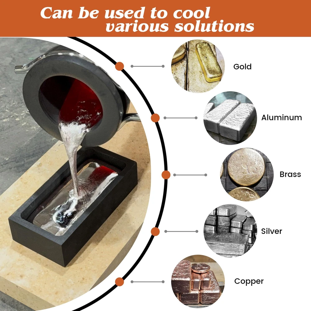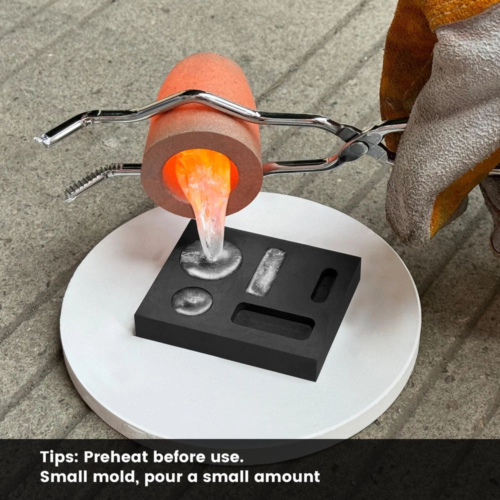 Discover the perfect combination set for all your DIY metal melting, casting, and refining needs. Our 5-in-1 Graphite Casting Ingot Mold Set includes everything you need to get started. Product Composition: 5-in-1 Graphite Casting Ingot Mold: 2.83" x 2.24" x 0.47" with 3 rectangular slots and 2 round holes; 1kg Graphite Ingot Crucible Molds: Outer - 4" x 2" x 1" (100 x 50 x 25 mm), Inner - 3.5" x 1.6" x 0.8" (90 x 40 x 20 mm); Graphite Stir Rod Sticks: 12" long, 0.47" diameter Premium Graphite: Crafted from premium graphite for enhanced durability and excellent heat resistance, ensuring long-lasting performance and superior results in metal casting Versatile Usage: Perfect for experiments and smelting of non-ferrous metals such as gold, silver, copper, aluminum, and more; Ideal for use as an ingot mold, graphite crucible melting, test analysis, and other purposes Convenient Combination Set: A comprehensive 4-piece set designed to meet all your DIY needs for melting, casting, and refining metal jewelry;The set's dimensions are perfect for small-capacity metal melting projects, offering precision and efficiency Important Reminder: Please carefully check the dimensions provided in the product details before making your purchase to prevent any inconvenience caused by ordering the incorrect size Buyer : Enjoy peace of mind with our 24-hour ;If you have any questions, please get in touch with us through buyer messages for prompt assistance