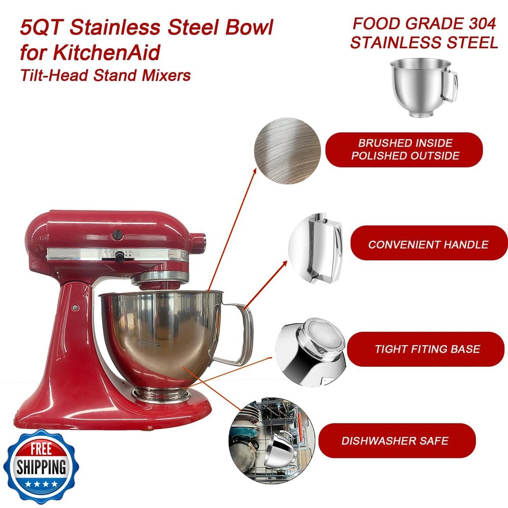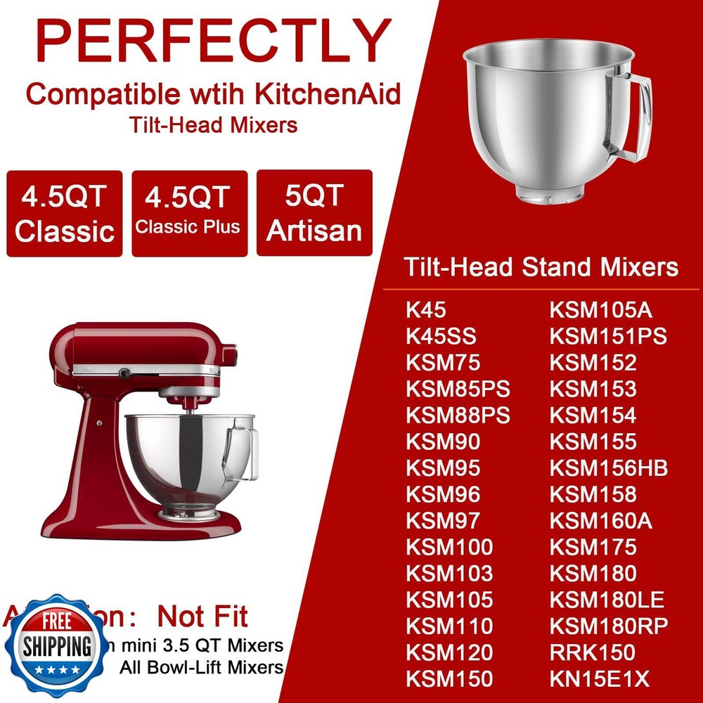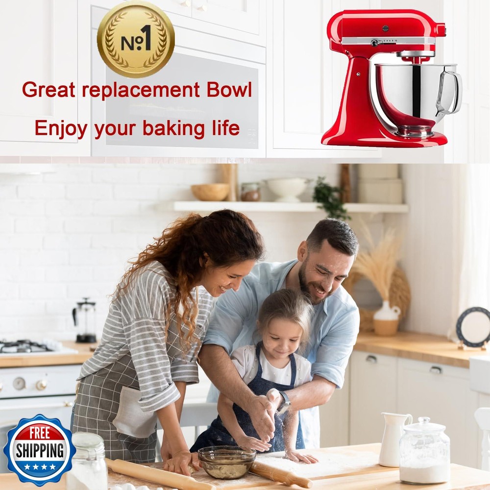 5 QT Stainless Steel Mixer Bowl Compatible with KitchenAid ArtisanandClassic Series 4.5-5QT Tilt-Head Mixers K45 KSM70 KSM150 etc. Replacment for KitchenAid Mixer Bowl(Light Weight) Features 5qt Stainless Steel Bowl: With ergonomic handle, it is easier to grip and more comfortable. Light-Weight Design, more choice for you. Perfect Fit: Our mixing bowl is designed for KitchenAid Cassic 4.5QT and Artisan 5QT series tilt-head stand mixers. Fit for K45SS, KSM75, KSM90, KSM100, KSM150, Good replacement for Kitchen aid bowl K5THSBP Food Grade 304 Stainless Steel: Our mixing bowl is made of high quality food grade 304 stainless steel, scratch resistant, rust resistant, durable and safe Easy to clean: You can simply clean them with soapy or warm water, also put them in the dishwasher. The sturdy stainless steel mixing bowls can complete a full cycle of washing. This makes cleaning almost effortless and saves you a lot of valuable time! Buy with Confidence: We promise to provide the best service to all customers, if you are not satisfied with stuff you get, contact us to return the product for replacement. Shipping Free & Fast Shipping: We offer free shipping to most of the USA with a normal delivery time of 3-7 days. However, due to the current situation, additional delivery time (up to 3 weeks) may be required for some items. Alternative Carriers: We may use alternative carriers (e.g., USPS, FedEx, UPS) to ensure your package arrives safely and on time. Due to the use of multiple carriers, we are unable to provide a tracking number automatically. Handling Time: Orders are processed and shipped within 1-2 business days of receiving cleared payment. Shipping Restrictions: Shipping to Alaska, Hawaii, Puerto Rico, Guam, and other US territories may incur shipping charges or delivery restrictions. Please contact us before ordering, or your order can be refunded/cancelled. State Restrictions: Certain items may not be shipped to California due to state regulations. Contact for Tracking Updates: If you require tracking updates or have any concerns about the delivery of your order, please feel free to contact us, and we will be happy to assist you. Return Policy 30-Day Hassle-Free Returns: If you are not completely satisfied with your purchase, you can return the item for free within 30 days of receiving it for a full refund or exchange. Easy Return Process: Contact us, and we will provide you with a prepaid return shipping label and detailed instructions. No Restocking Fee: There are no restocking fees for returns. However, the buyer is responsible for return shipping costs if the return is not due to a seller"s error. Refund Processing: Refunds will be processed within 1 business day of receiving the returned item in its original condition. Feedback Your feedback is extremely important to us. We strive to provide the best products and customer service possible. If you are satisfied with your purchase, please take a moment to leave us a positive review. If you have any concerns or issues with your order, please contact us before leaving negative feedback. We are committed to resolving any problems and ensuring your satisfaction. Contact Us If you have any questions or concerns, please feel free to reach out to our customer support team. You can contact us through the eBay messaging system. We are available Monday to Friday, 9:00 am to 5:00 pm EST, and we will do our best to respond to your inquiry within 24 hours. Thank you for supporting our small family business!