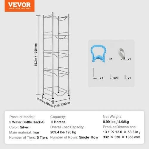 5 Tiers Water Jug Holder 5 Gallon Water Bottle Holder Single Row Water 5 Tiers Water Jug Holder, 5 Gallon Water Bottle Holder Single Row Water Bottle Rack for 5 Bottles Heavy Duty Water Jug Rack for Kitchen Office Living Room Silver Water Bottle Rack Multi-Tier Storage Easy Installation Thoughtful Details Versatile Use Variety of Sizes Primary Material: Iron Number of Rows: Single Row Capacity: 5 Bottles Number of Tiers: 5 Tiers Color: Silver Product Model: 5 Water Bottle Rack-S Product Dimensions: 13.1 × 13.0 × 53.3 in / 332 × 330 × 1355 mm Net Weight: 8.42 lbs / 3.82 kg Overall Load Capacity: 209.4 lbs / 95 kg *Photo Colors may vary on your device. With any product, the color may appear different based on device, monitor settings, configurations, browsers, the lighting/setting for the photograph, etc. Shades may slightly vary during manufacturing runs/processing. Photos are for informational purposes only and represent a basic design. Dimensions are approximated and may vary during manufacturing runs. Manufacturers may make modifications to the design of an item at any time. About Bargains Delivered Bargains Delivered gives personal attention that only a small business can offer. Wherever you prefer to shop, Bargains Delivered will be there with the widest selection possible for your convenience. See our feedback history with thousands of satisfied customers. We have been serving you since 2005, and we are committed to maintaining your trust! Returns/Refunds Our return policies are simple: most brand new items may be returned up to 30 days from receipt. See specific listing return policy to confirm if that item is marked returnable. Some items such as health and beauty are not returnable. For returnable items, customer covers shipping (initial and return) and no restocking fee applies if item is brand new. Brand new includes all packaging, tags, etc in perfect condition. Items which are not brand new may be subject to a 50% restocking fee or not accepted at all. All returns require a Return Merchandise Authorization number (RMA #).Please contact us for return RMA and return address. Please note that RMA # does not guarantee final disposition for a return and all returns are inspected before any credit would be given. Customer should use a trackable, insured return service. If item is damaged or lost in transit to us, customer would need to file a claim with their return carrier and we would not be able to process the return. Shipping fees are non-refundable, including expedited shipping, even if item is defective or arrives later than estimated. For any return requests involving variations in the color, shade, approximate dimensions, included accessories, or features listed in the description, normal return policies apply. If parts are missing or damaged, we will send replacement parts if available or it may be processed as a standard return. Shipping We ship fast, usually in 1-2 business days, with delivery expected 2-5 days later. Messages will be sent automatically with shipping updates. All items ship to the address provided in checkout. Please submit an order cancellation request if you need the item shipped to a different address. We may require Signature on any orders. Refusal of delivery, invalid address, unable to sign and receive, and any other reason beyond our cause of error will be treated as standard return, with all shipping and restocking fees deducted. Please inspect your package and merchandise as soon as possible to report any shipping damage or other concerns. Please save all packaging and materials until you are sure there is no damage and you will not be returning the item. If you need to return, we don't provide replacement packaging. For shipping damage, we can usually replace any specific part that is damaged. Let us know which parts need replacement. We do not provide any credits for work done to correct shipping damage (such as at local bike shops) or for the inconvenience of parts arriving damaged. We will work with you to correct any problems. Payment/Tax Sales Tax: Tax is charged for orders shipped to all states where such taxes are applicable. The amount of tax charged is based on current state and local tax rates. We collect Sales Tax for multiple states, and marketplaces also collect sales tax for some states. If your state requires the payment of use tax on out-of-state purchases, then that is fully the responsibility of the buyer. State and local tax rates are subject to change at any time By making a purchase from us, buyer agrees to above policies. Thank you!
