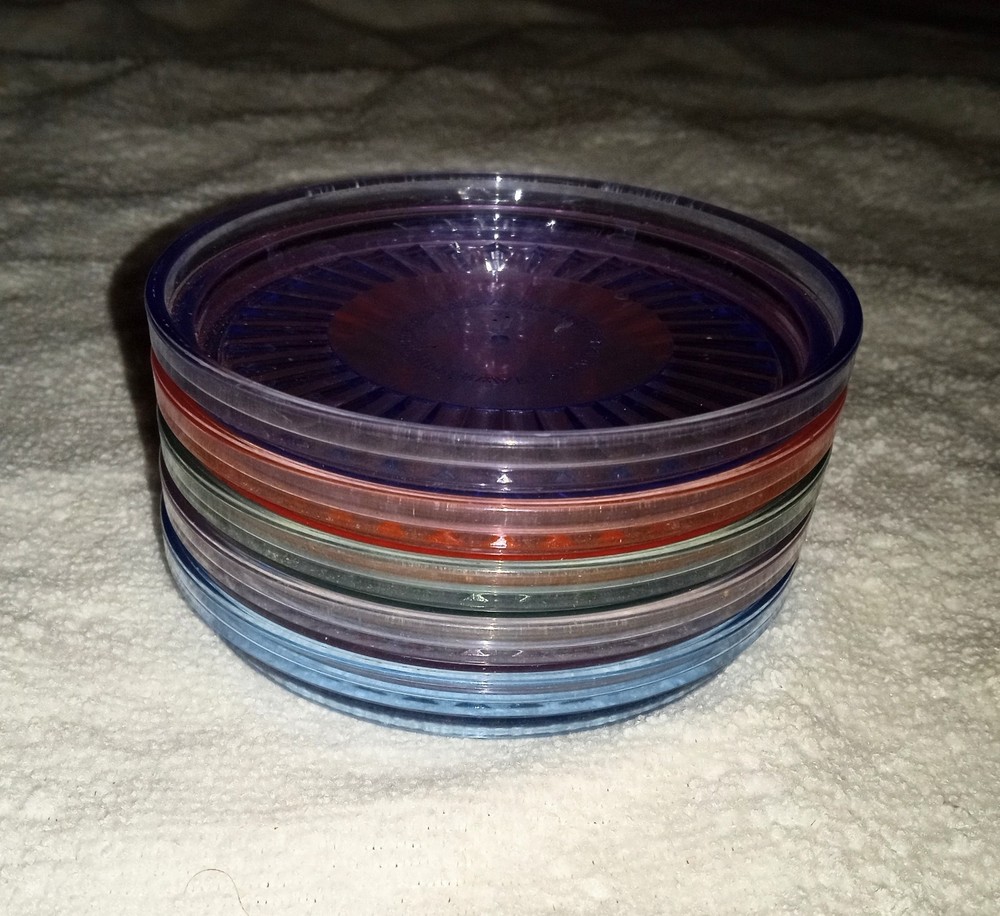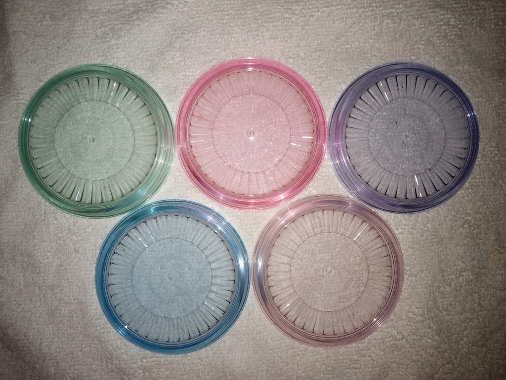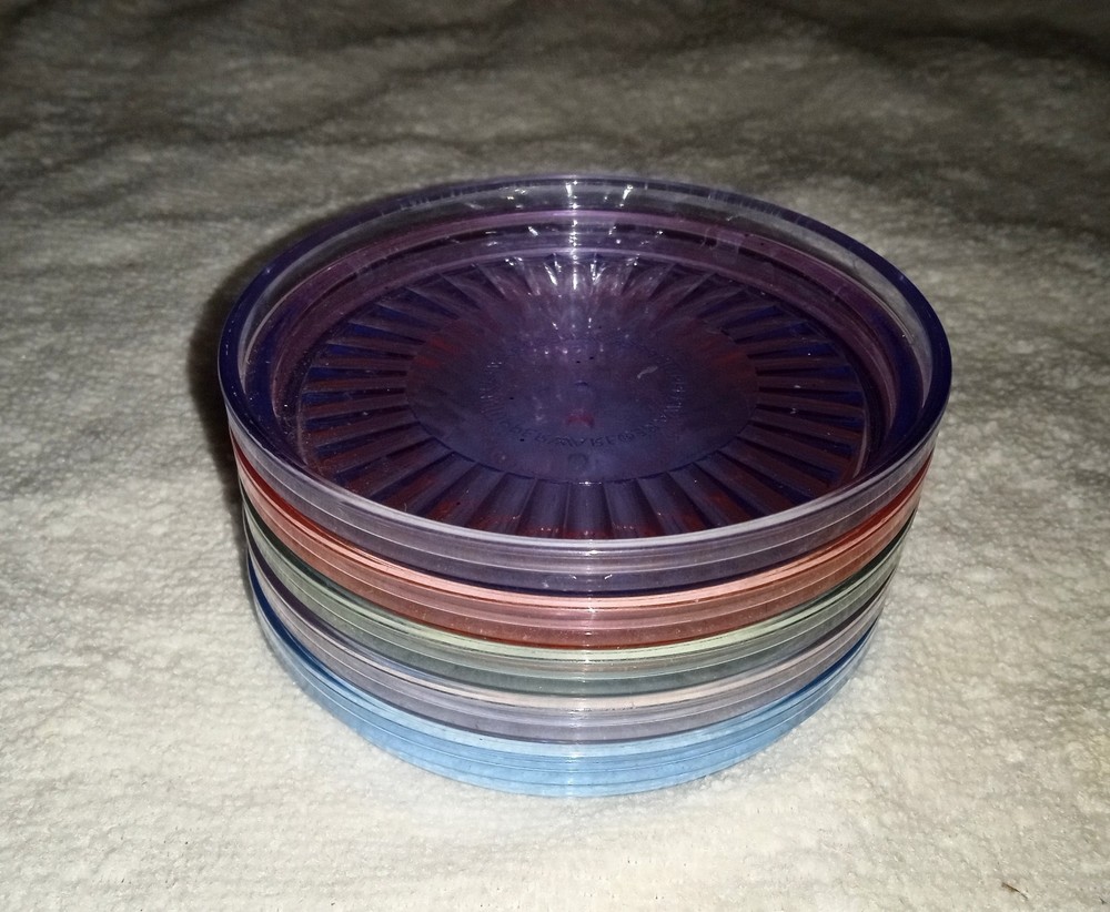 Lot of 5 Tupperware pastel colored round plastic coasters. Approx. 3.25" in diameter. Pink, blue, purple, green, and peach in color. Excellent pre-owned condition, no melts or stains.
