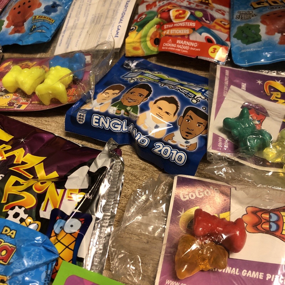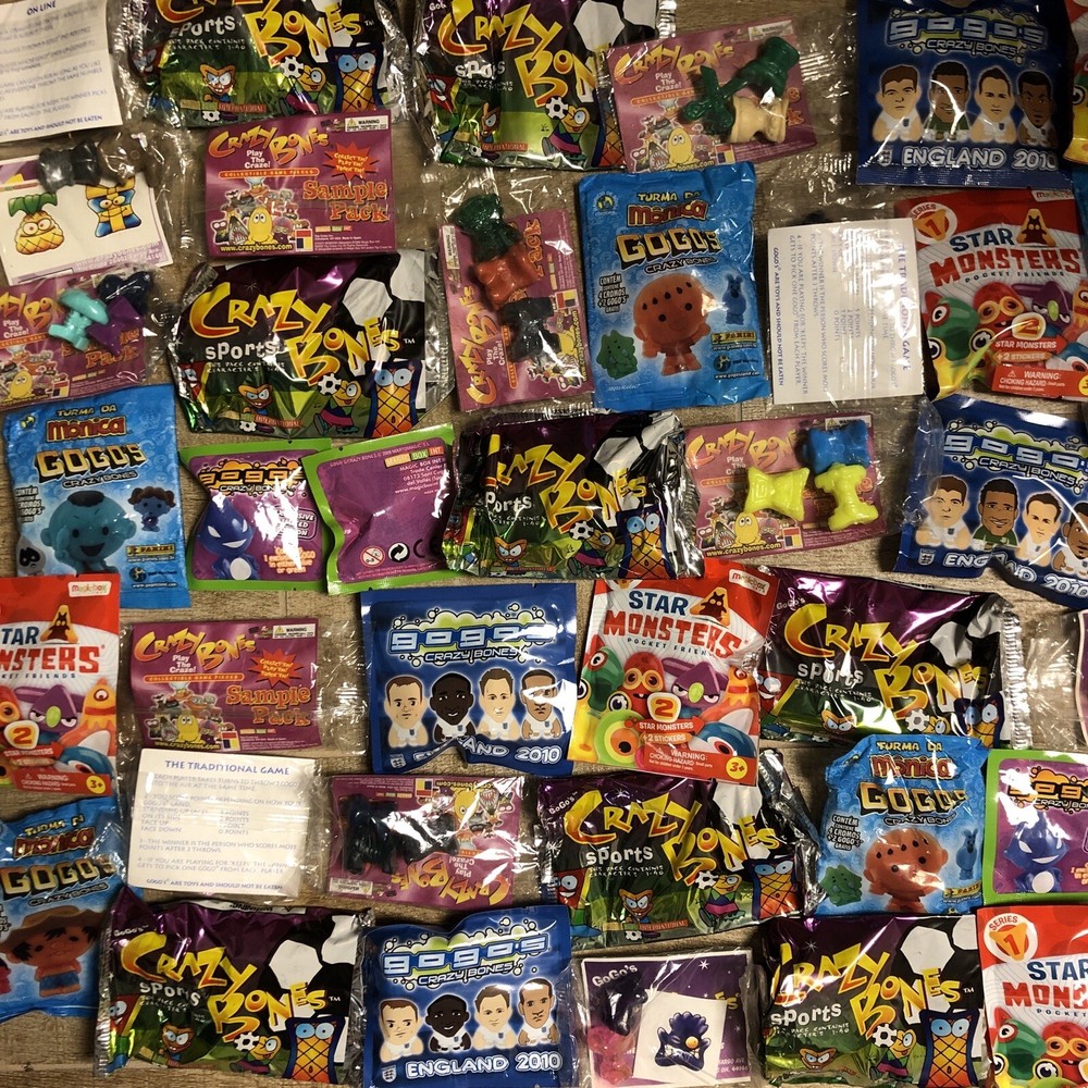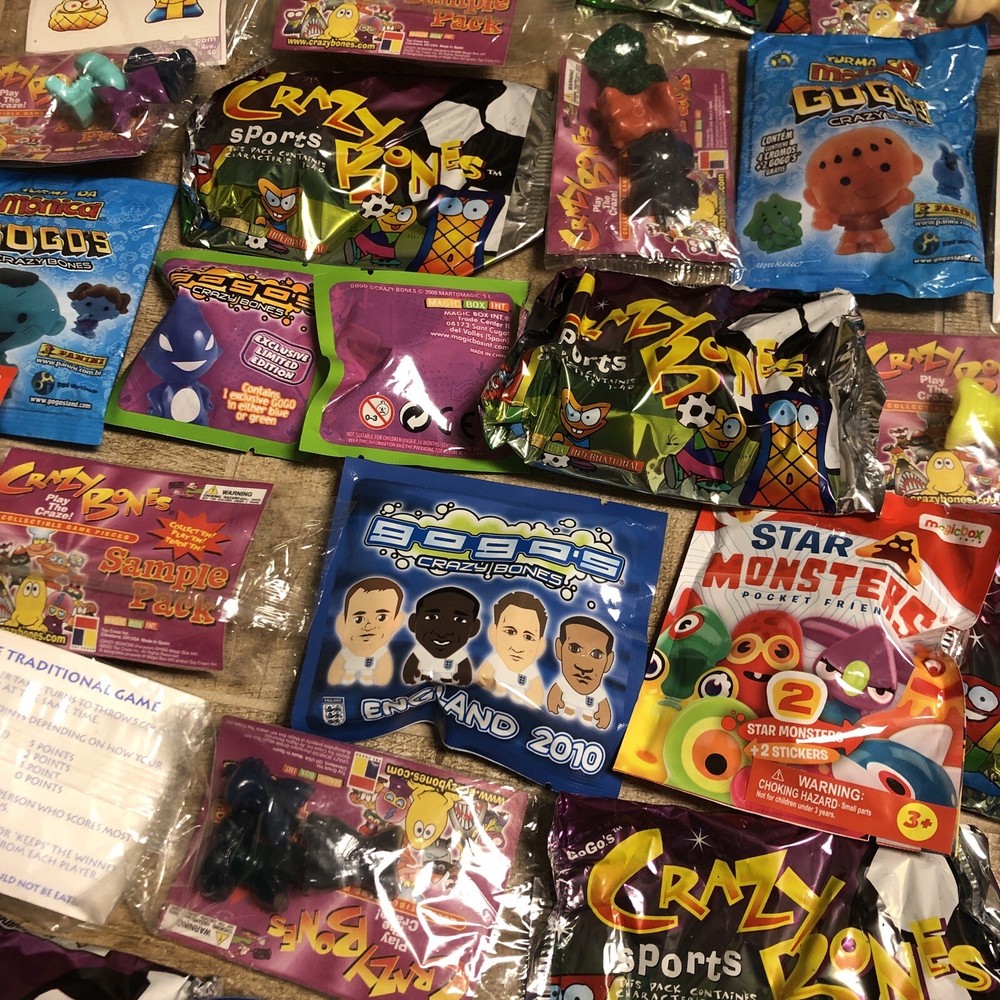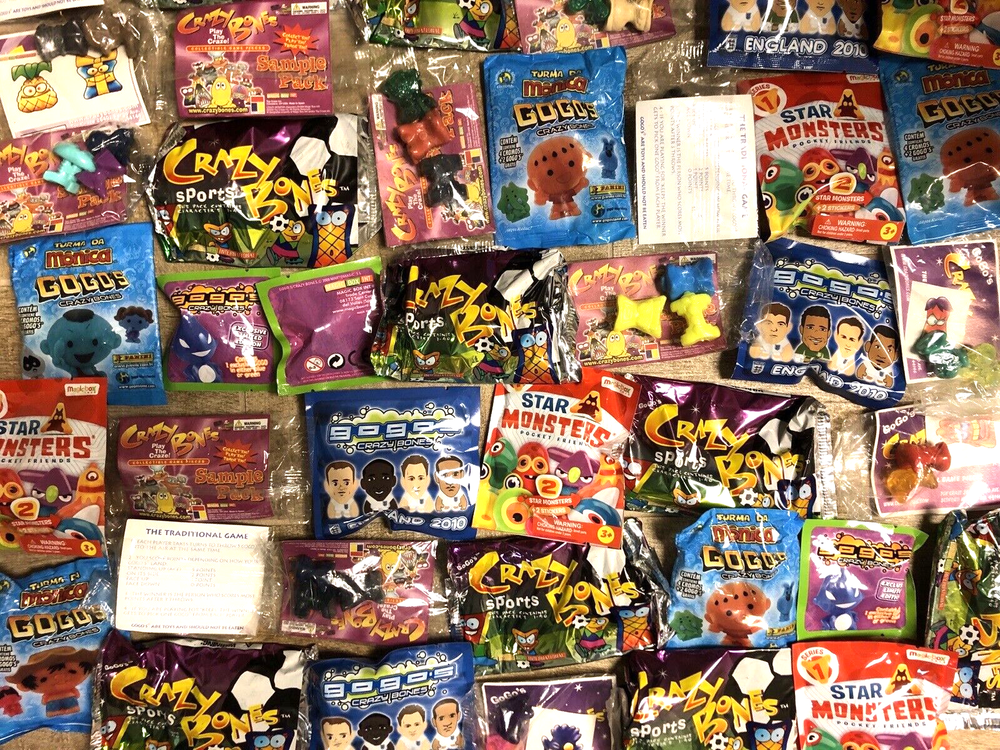 5 Random Packs of Gogos Crazy Bones Orders will include 5 total packs, which will include some combination of the following sealed packs : 1996 Gogo's Originals sample packs 1996 Gogo's Things Series Game Packs 1998 Gogo's Sports Series Packs 2000 Gogo's Crazy Bones Things Sample Packs 2009 UK Exclusive Gogo's, The Daily Mirror Newspaper, Limited Edition Packs 2010 Gogo's UK Exclusive England National Football team Packs 2011 Turma da Mônica Gogo's Star Monsters Series 1 (Similar to Gogos, also made by Magic Box International) Comes well packed