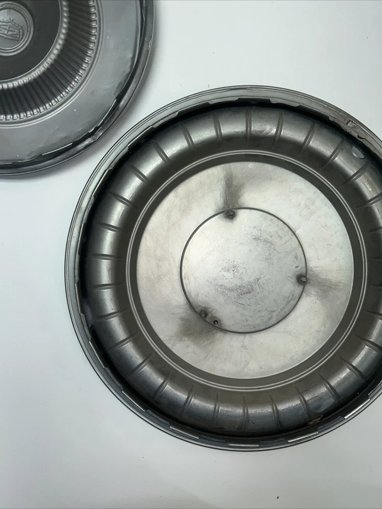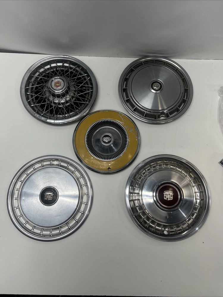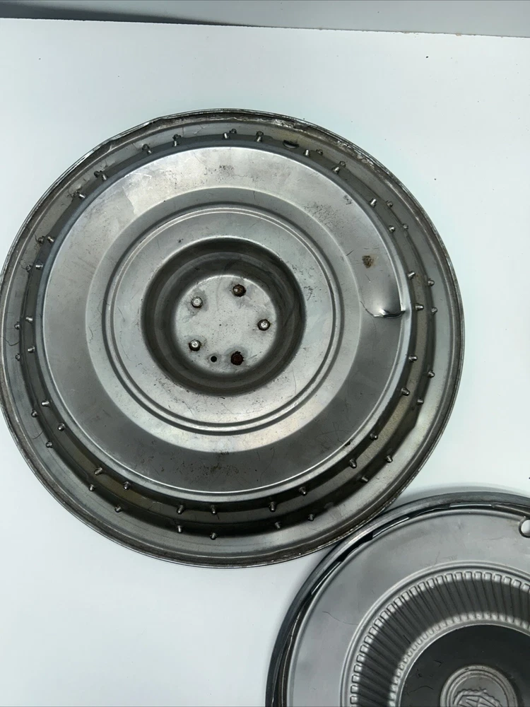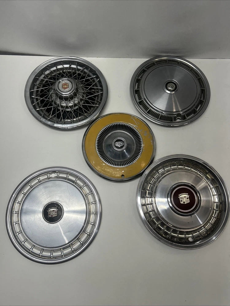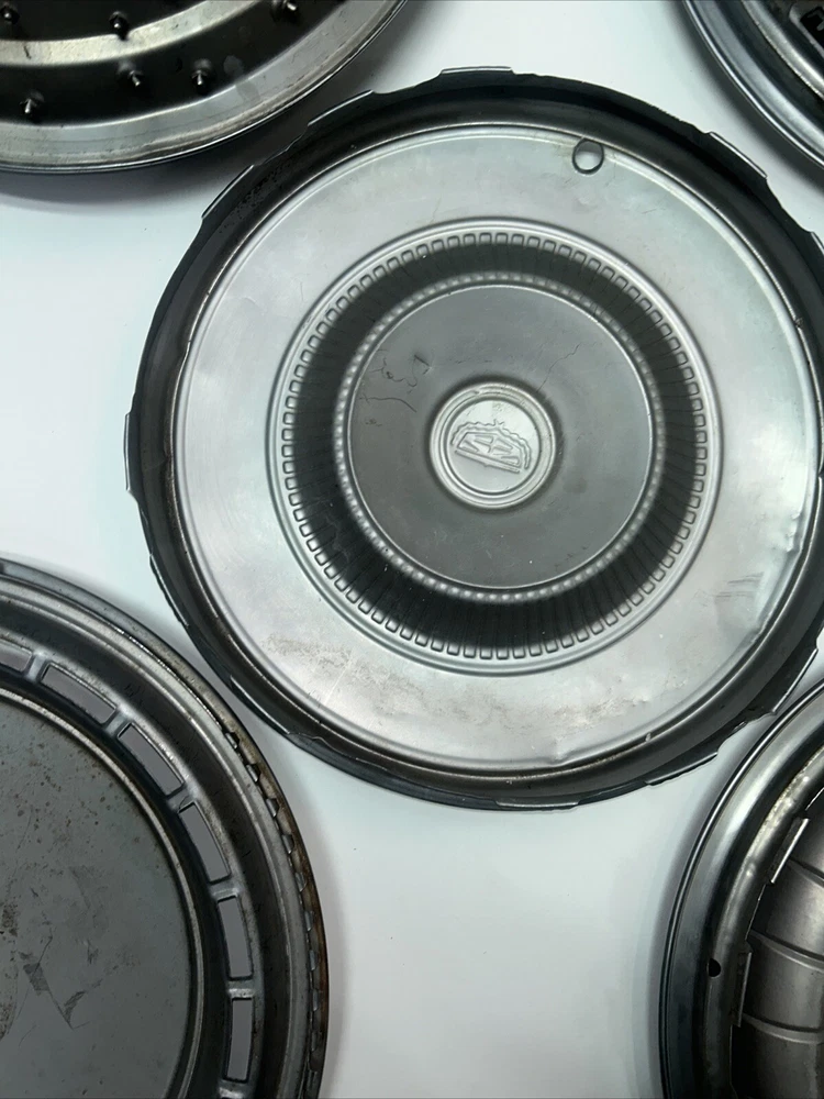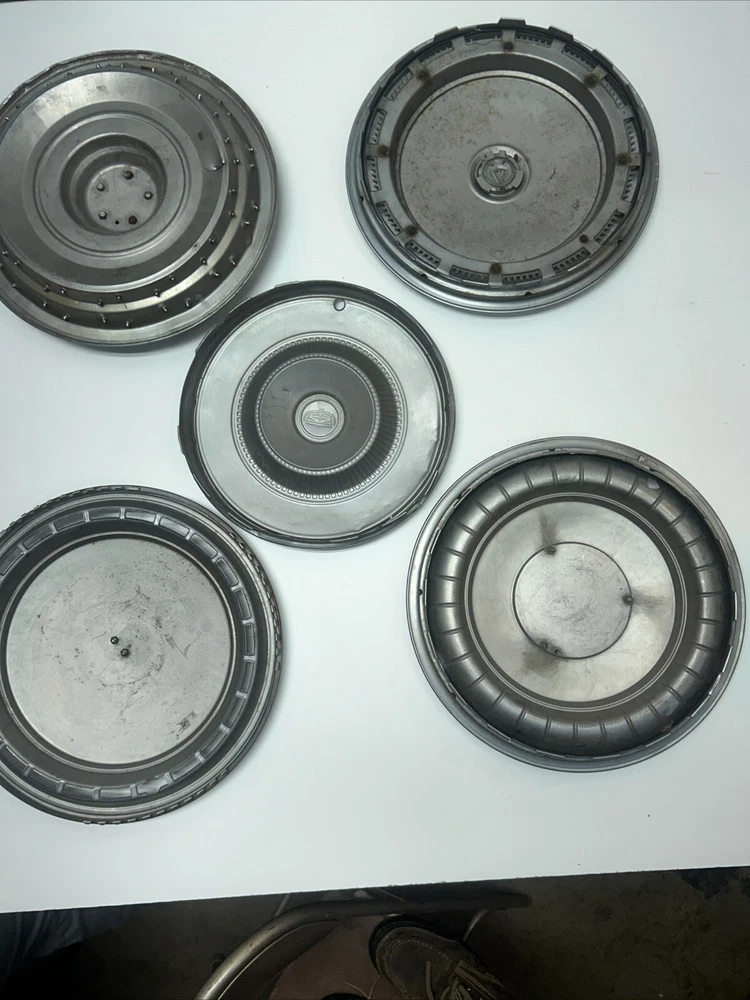 For sale we have a lot of 5 Vintage US Made Chrome Steel Hubcaps Wheel Covers Ford Cadillac Firebird all in okay condition more for wall hangers or man cave items