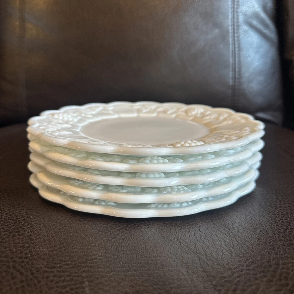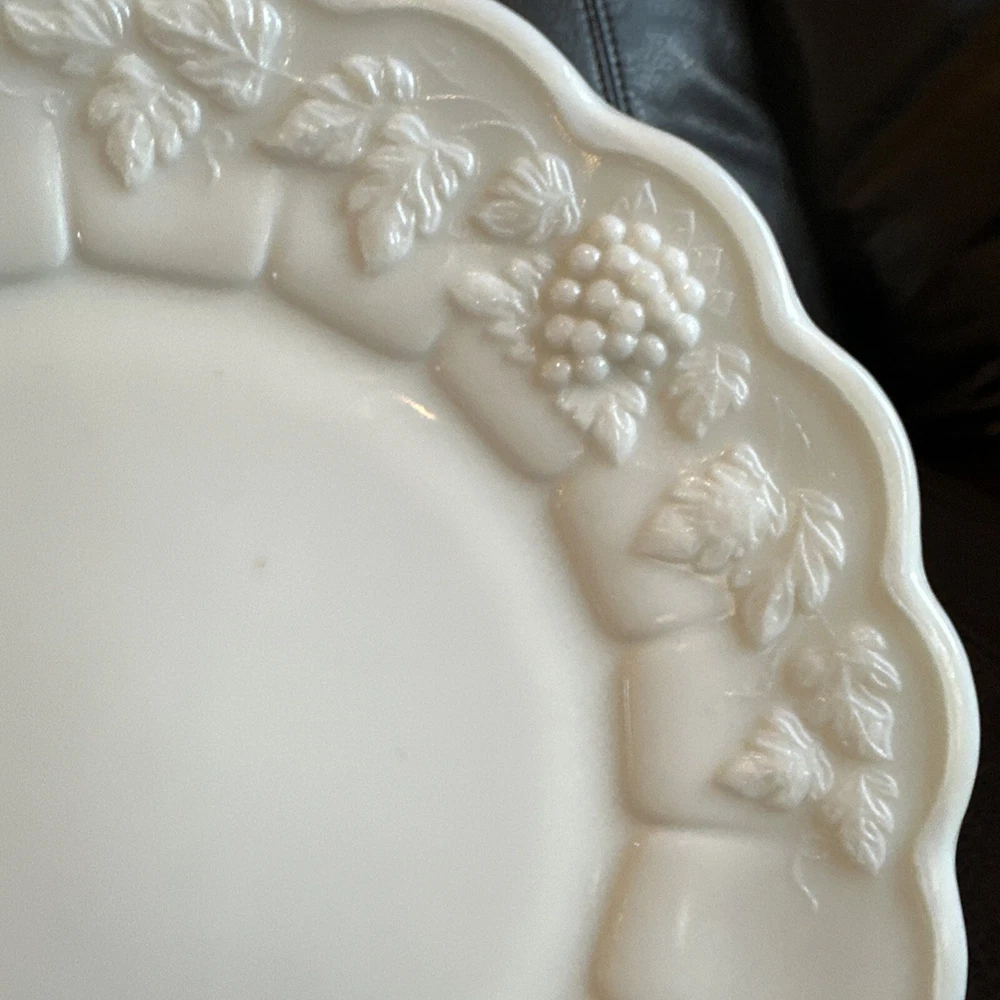 This beautiful Westmoreland milk glass plate is a vintage piece from the mid-20th century. The 6 1/4 inch round plate features an embossed and scalloped edge design with a decorative paneled grape pattern. The white plate is perfect for any occasion, whether it's a love and romance dinner, a bridal shower, or a holiday gathering. The plate is an original and authentic piece, made in the United States with a pressed glass production style. It's recommended to hand wash only for care instructions. The plate is a great addition to any eclectic style decor and is perfect for serving bread, butter, dessert, or any other dish. Get this unique piece now and add a touch of old-world charm to your home.