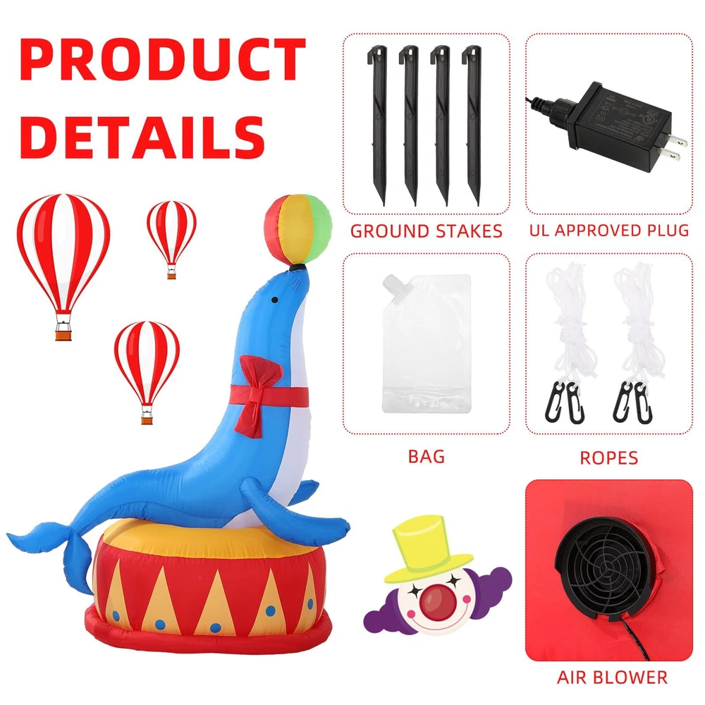 Product Description: Our 5 ft LED inflatable seal is an extraordinary addition to your party decorations. Crafted for both indoor and outdoor setups, it's ideal for any occasion, be it a circus carnival, birthday party, or a summer pool gathering. Features: Versatile Party Decor: this inflatable seal makes a delicate addition to all sorts of gatherings. Ideal for circus carnivals, pool parties, birthday celebrations, backyard summer parties, and more. LED Lighting: integrated with LED lights, this outdoor decoration captivates everyone's attention, creating a lively atmosphere regardless of day or night. Easy To Use: the inflatable seal effortlessly inflates and deflates, making it convenient to set up and store. Your party can be ready in no time with our efficient decor. Quality Material: constructed with quality material, it is designed to withstand the harshest outdoor conditions. Ensuring sustainability and long term use, it's a valuable addition to your decoration. Size: with its 5ft size, it is large enough to be noticeable but not overwhelming. It's ideal for both spacious backyards and compact indoor settings. Notes: Manual measurement, please allow slight errors on size. The color may exist a slight difference due to different screen displays. Inflatable Seal Design: 5 ft circus carnival theme inflatable seal animal with LED lights; The unique design and large size of the inflatable seal is great for adding a more festive atmosphere to your holidays and attracting your kids' or guests Indoor and Outdoor Inflatable Decoration: the blower in inflatable seal animal yard decoration has been designed to provide a strong airflow that can inflate the product within a minute while maintaining a steady airflow, ensuring your inflatable carnival decoration looks its best throughout the whole festive season Durable Material: well sewn outdoor blow up decoration is made of quality polyester that is lightweight and durable, windproof, fade resistant and waterproof with an IP44 rating; As an inflatable lawn decoration, it comes with a powerful built in fan and plug to ensure you have a wonderful birthday party or pool party experience LED Lights: bright LED lights make the inflatable seal animal decoration more attractive; Inflatable decorations with stunning LED lights will surely light up your yard or garden; It's ideal for the circus, carnival, birthday party, summer pool party, sea animal themed party, baby shower, and also for home decorations, toys, pool decorations, and gifts Safety and Stability: we provide 6 sturdy ground stakes, 4 tie down ropes, and a plug for quick and easy setup; The bottom zipper opening provides extra space for adding some weight; Further, a water bag is included, which can be filled with water and placed inside for added weight, ensuring the inflatable decoration's safety and stability during windy conditions; Please zip up the bottom opening during inflation and open it when deflating