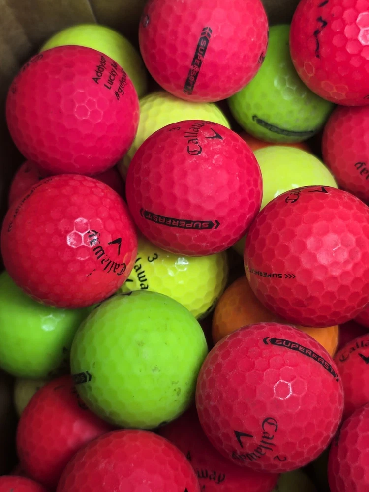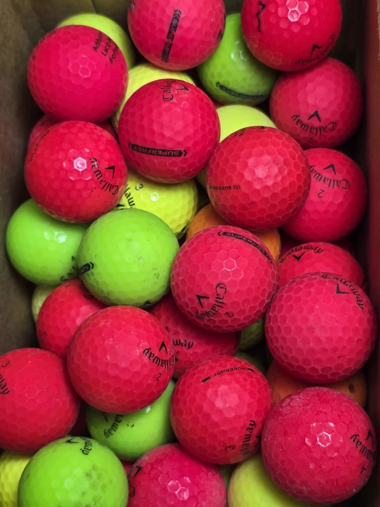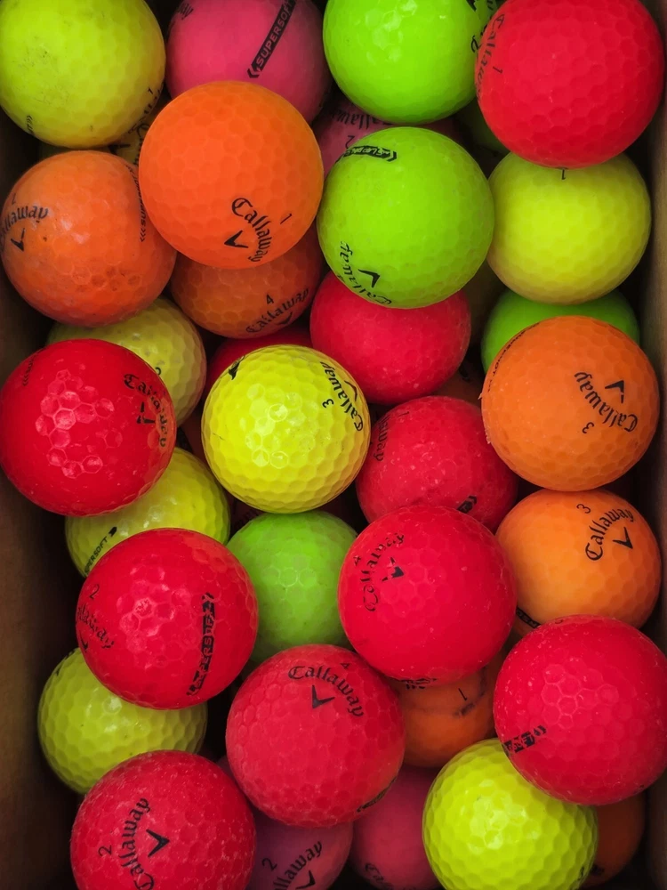 Enhance your golf game with this set of 50 Callaway Supersoft MATTE golf balls. These balls are perfect for a match and come in an assortment of colors including pink, green, yellow, orange, and red. The 3-piece construction and medium compression rating make them ideal for both short and long game. These golf balls are in excellent shape and are near mint, with a letter grade of AAA. They are made of high-quality Ionomer material and are suitable for any golf enthusiast. Whether you are a beginner or a pro, these balls provide great value and control. The set weighs 2 pounds and is perfect for an event like the Arnold Palmer Cup.