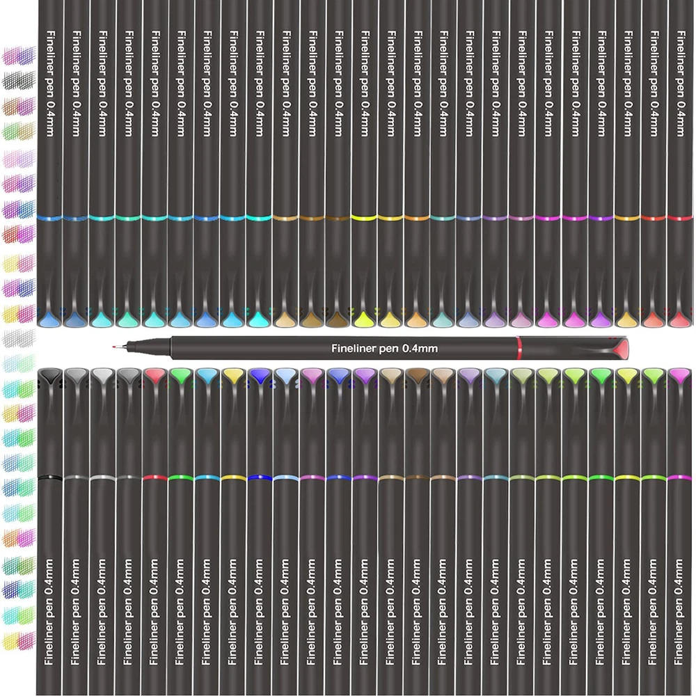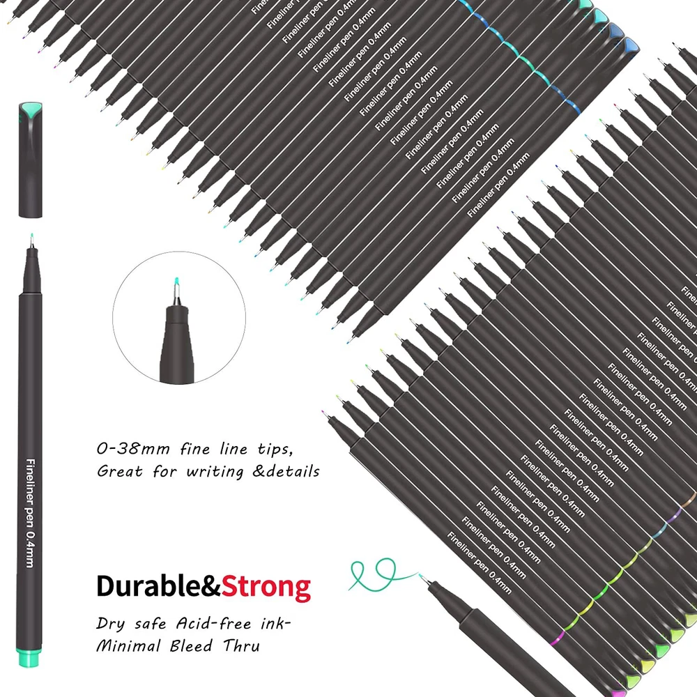 About US: is focusing on research optimal writing experience, offering writing instruments with superior functionality and affordability,Lets you express yourself with true style and color. The fine liner marker pen set provides bold and expressive lines and is great for journaling, note taking, adult coloring, sketch design etc. SUPER EXTRA FINE POINT PEN Appox. 0.4 mm Extra fine point, perfect for drawing lines & details, painting, writing, sketch, marker, signing, illustration, included artists fine-ink drawings and coloring small intricate pattern . QUALITY WRITING INSTRUMENT Water-based ink, No Duplicate,No Smudge,dry quickly, acid-free /non-ink,smooth writing,perfect for drawing lines & details, journal and so on. SMOOTH COLORED PEN Colorful fine line marker pens with Metal fine tipped and outstanding super smooth performance in all areas of journals, planner, drawing lines & details, writing, sketching, art coloring, note taking, calendar, art projects, comfortable to write SMOOTH COLORED PEN: Fine line markers pens with Metal fine tipped and outstanding super smooth performance in all areas of journaling, planner, drawing lines & details, writing, sketching, adult coloring book, art projects, comfortable to write. The tip is very firm, do not worry about slip tip. HIGH QUALITY: 0.40mm Fine Tip Marker pens High quality pigment colors ink, Safe non-and odorless, water-based, acid-free, no smudges, Fast drying, minimal bleed thru. Great choice colorful Journal Planner Pens & Fine Point Markers for Adults and . MORE COLORS: A wide variety of 50 eye-catching coloring pens no repetition, bright and beautiful. Satisfy your needs for artistic creation, so that you can give full play to your creation after work and study.Lets you express yourself with true style and color. MULTIPLE USAGES: Fineliner Pens are perfect for drawing lines & details, sketching, writing, signing, journaling, calendar, agenda, notebook, planner, mind mapping, doodling, comic, animation,adult coloring books, art supplies, school supplies and all other arts and crafts projects! WELL PACKAGE --- Our fine line pens come in a nice plastic storage case which can be easily placed in backpacks. They would be perfect as Journal Pens, Planner Pens, Journaling Pens. And premium gift set for the family, friends, Co-workers, classmate. Premium gift set for the family, friends, co-workers, Birthday, Christmas.