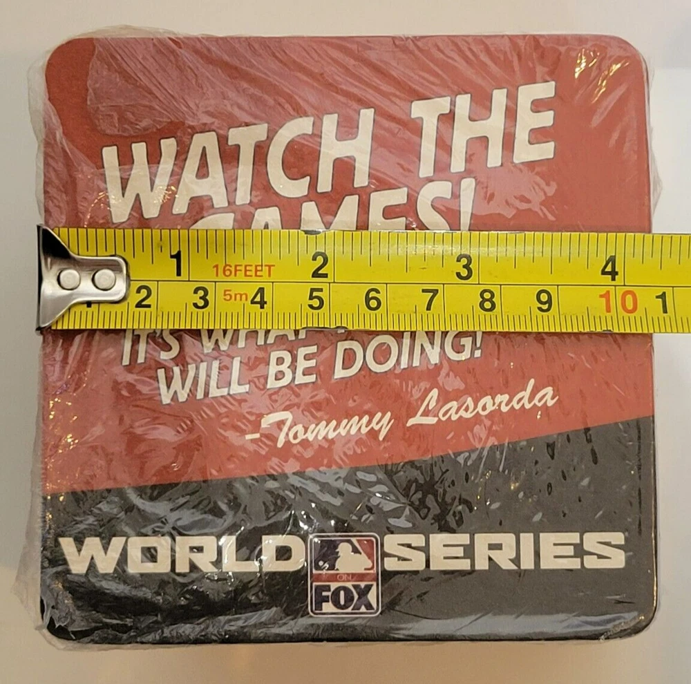 Type: Coaster Occasion: All Occasions Character: Tommy Lasorda Model: Fox World Series Number of Items in Set: 50 Shape: Square gtin13: NA Color: Multicolor Item Width: 4 1/4 in UPC: NA Style: MLB Baseball Material: Cardboard Pattern: Baseball World Series Brand: Unbranded Theme: Baseball Item Length: 4 1/4 in