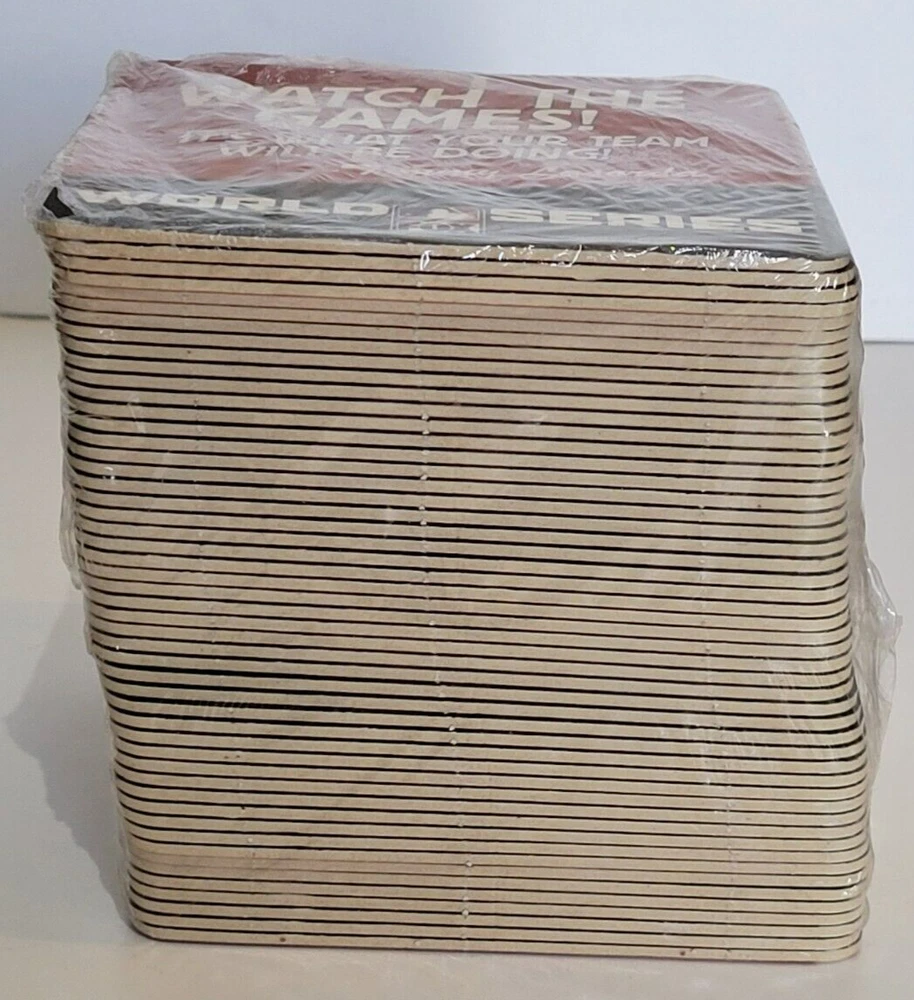 50 Fox World Series Cardboard Coasters NEW Tommy Lasorda Baseball MLB. There are some tears in the plastic (see pics). Coasters measure approximately 4 1/4" x 4 1/4". Double sided. Pack contains 50 coasters. Please see all photos for further condition details as they are also part of the description. Sold as is.