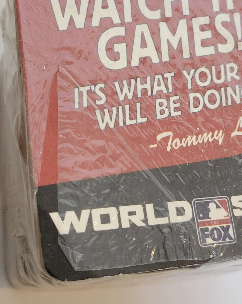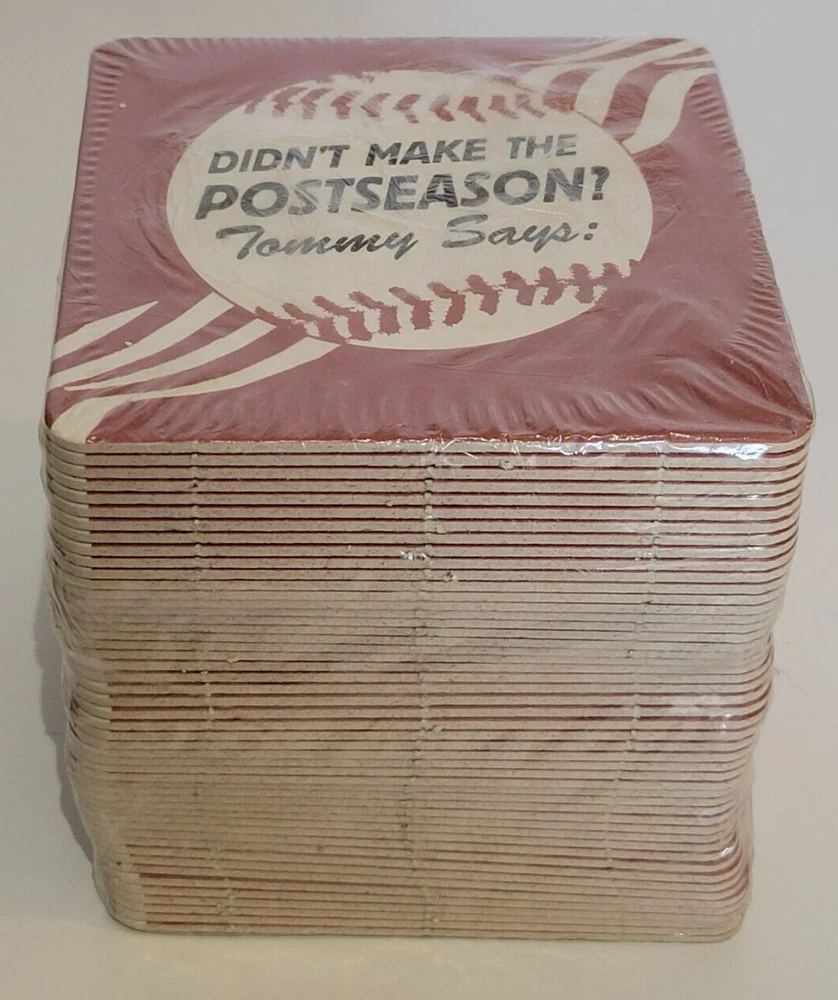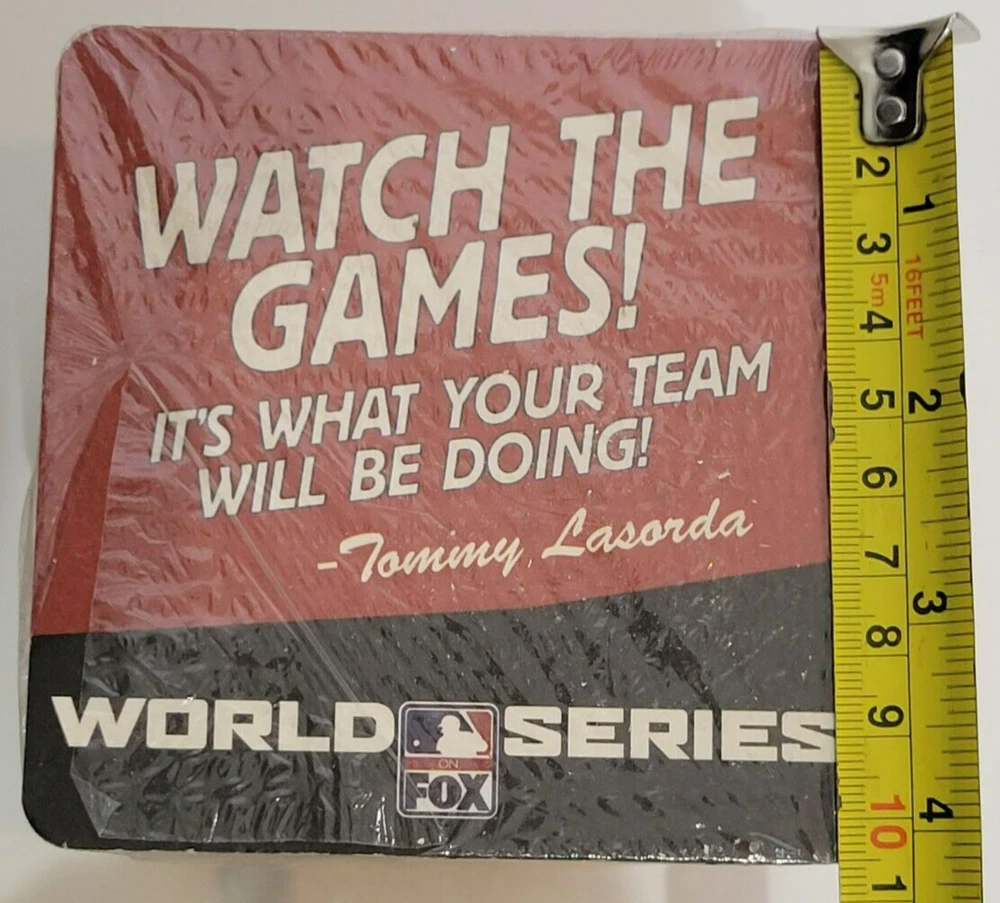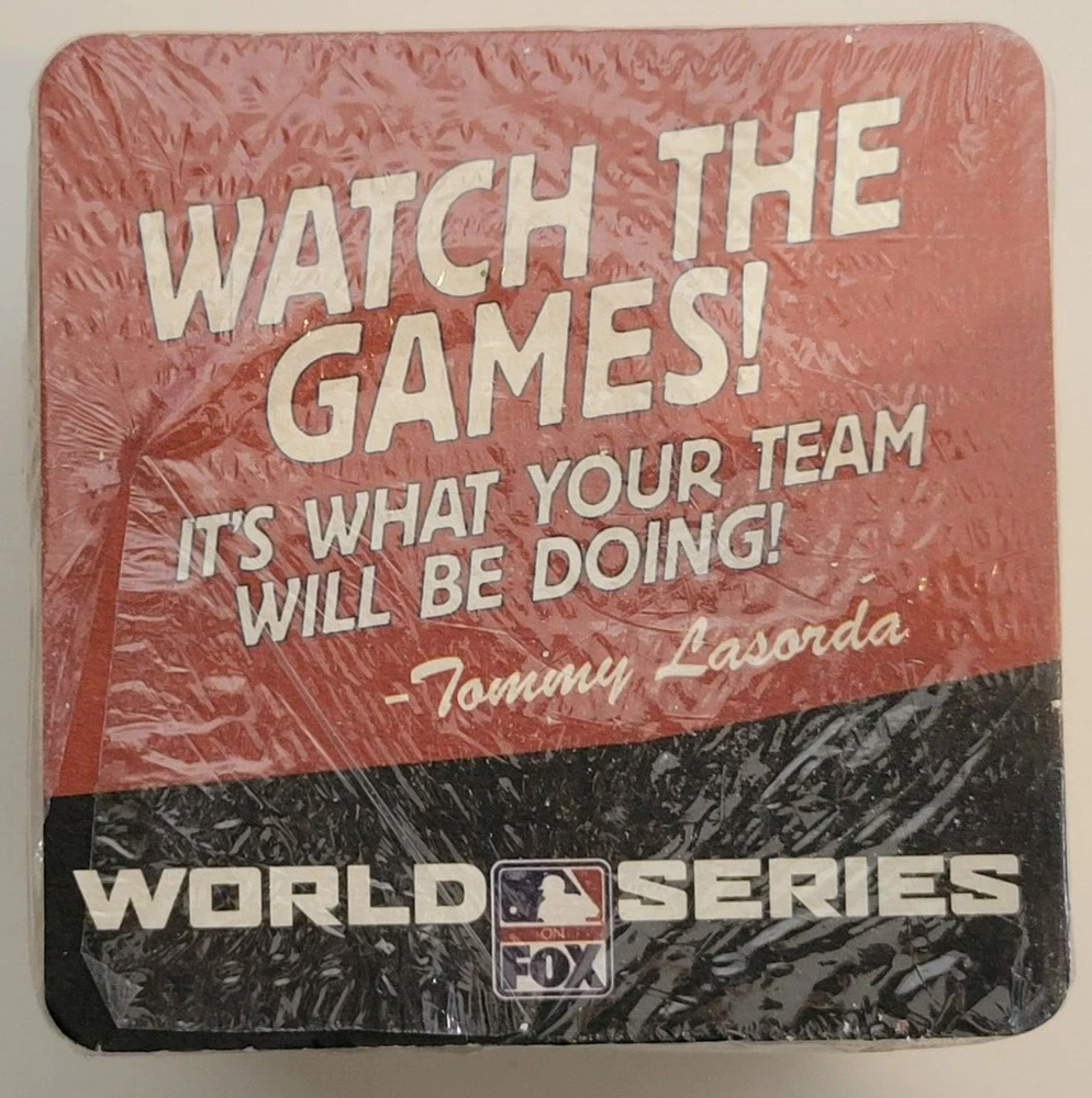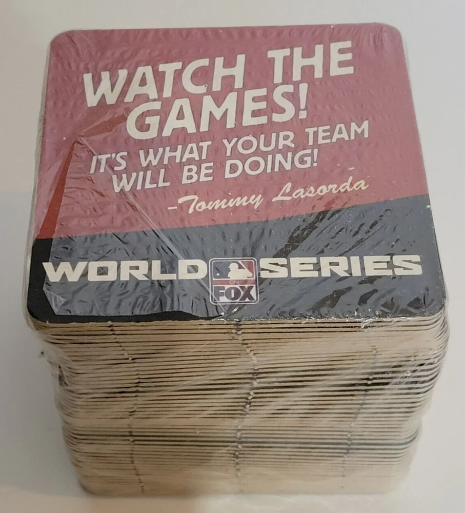 50 Fox World Series Cardboard Coasters NEW Tommy Lasorda Baseball MLB. There are some tears in the plastic (see pics). Coasters measure approximately 4 1/4" x 4 1/4". Double sided. Pack contains 50 coasters. Please see all photos for further condition details as they are also part of the description. Sold as is.