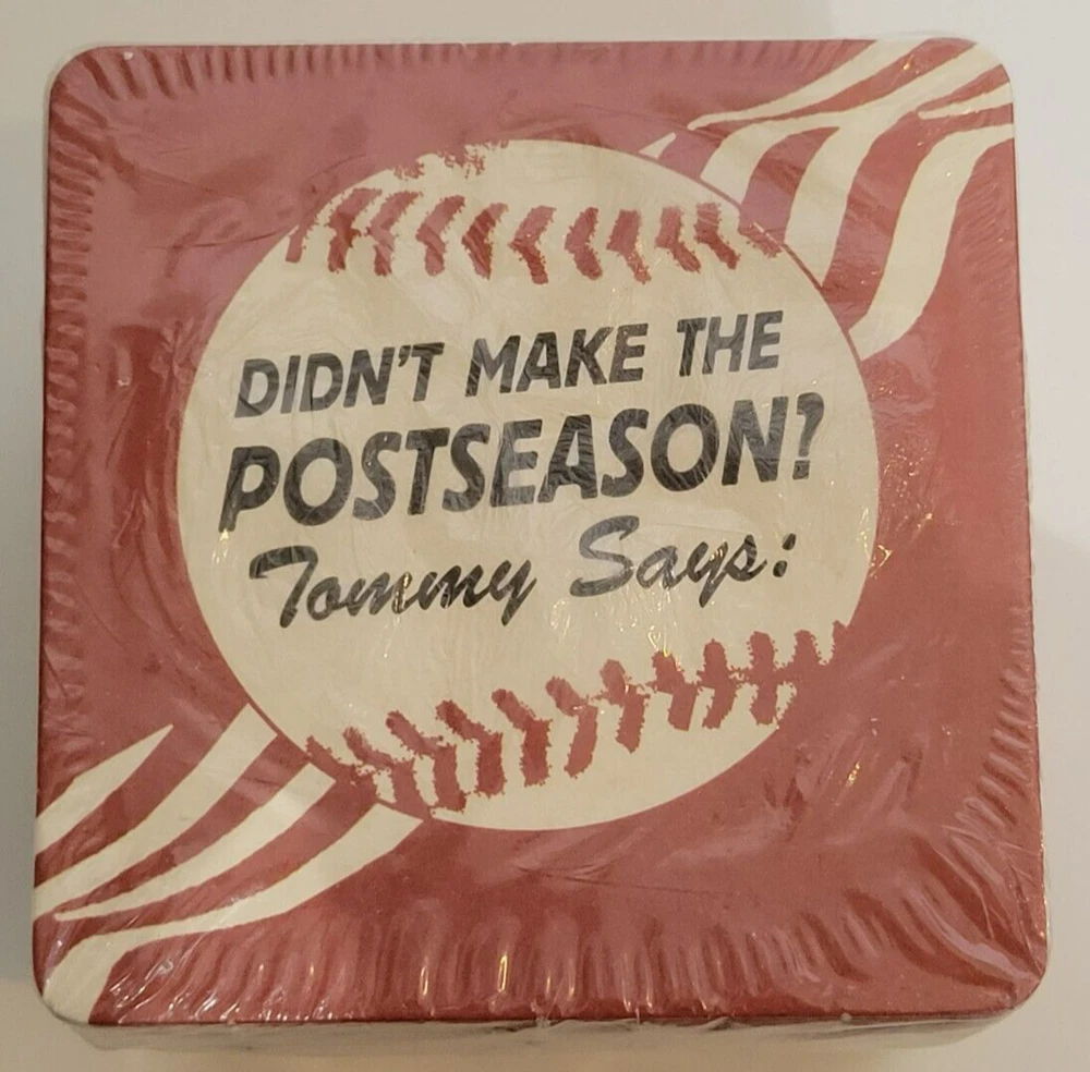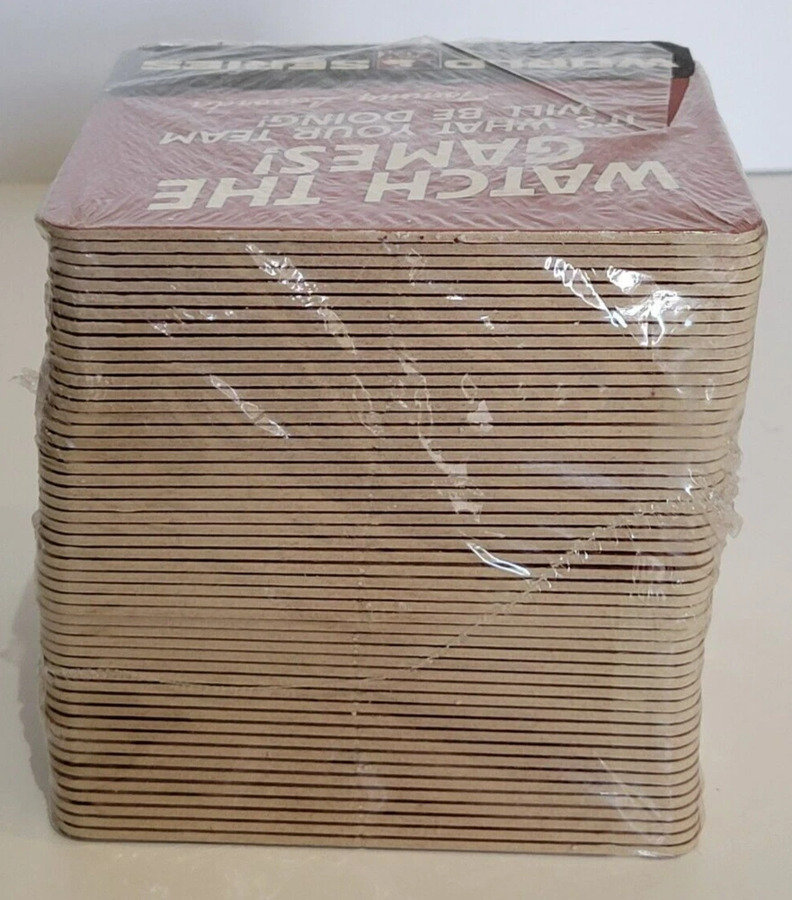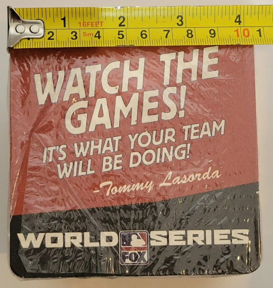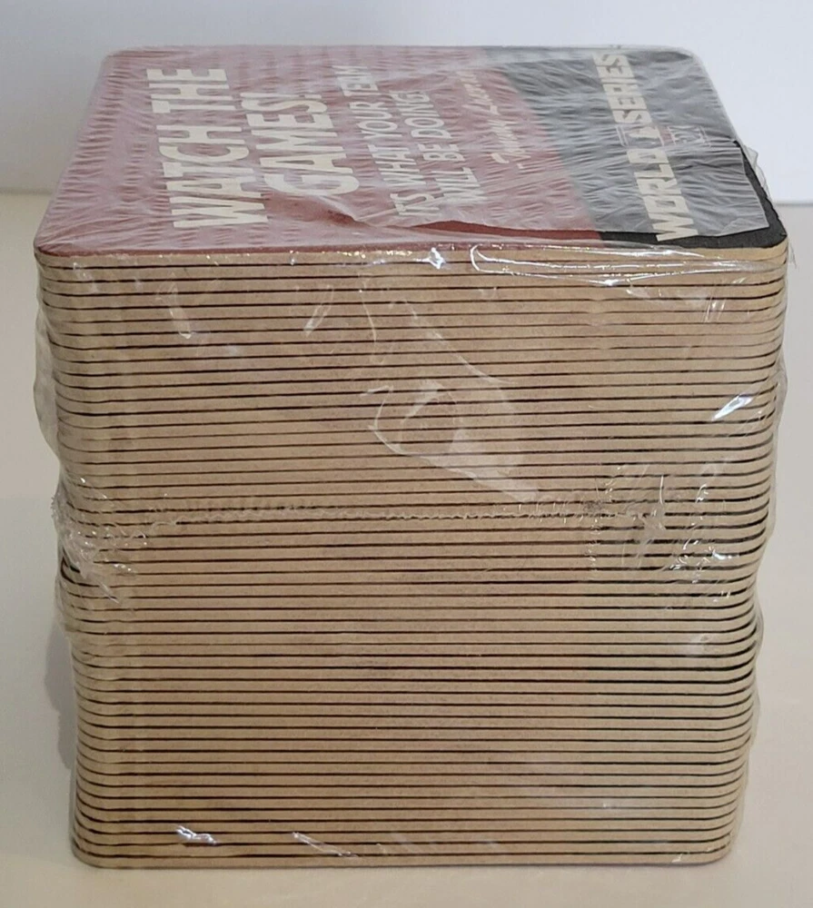 50 Fox World Series Cardboard Coasters NEW Tommy Lasorda Baseball MLB. There are some tears in the plastic (see pics). Coasters measure approximately 4 1/4" x 4 1/4". Double sided. Pack contains 50 coasters. Please see all photos for further condition details as they are also part of the description. Sold as is.