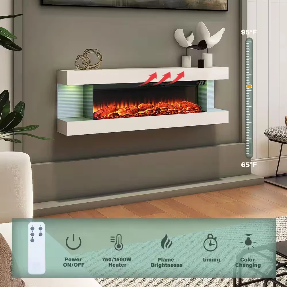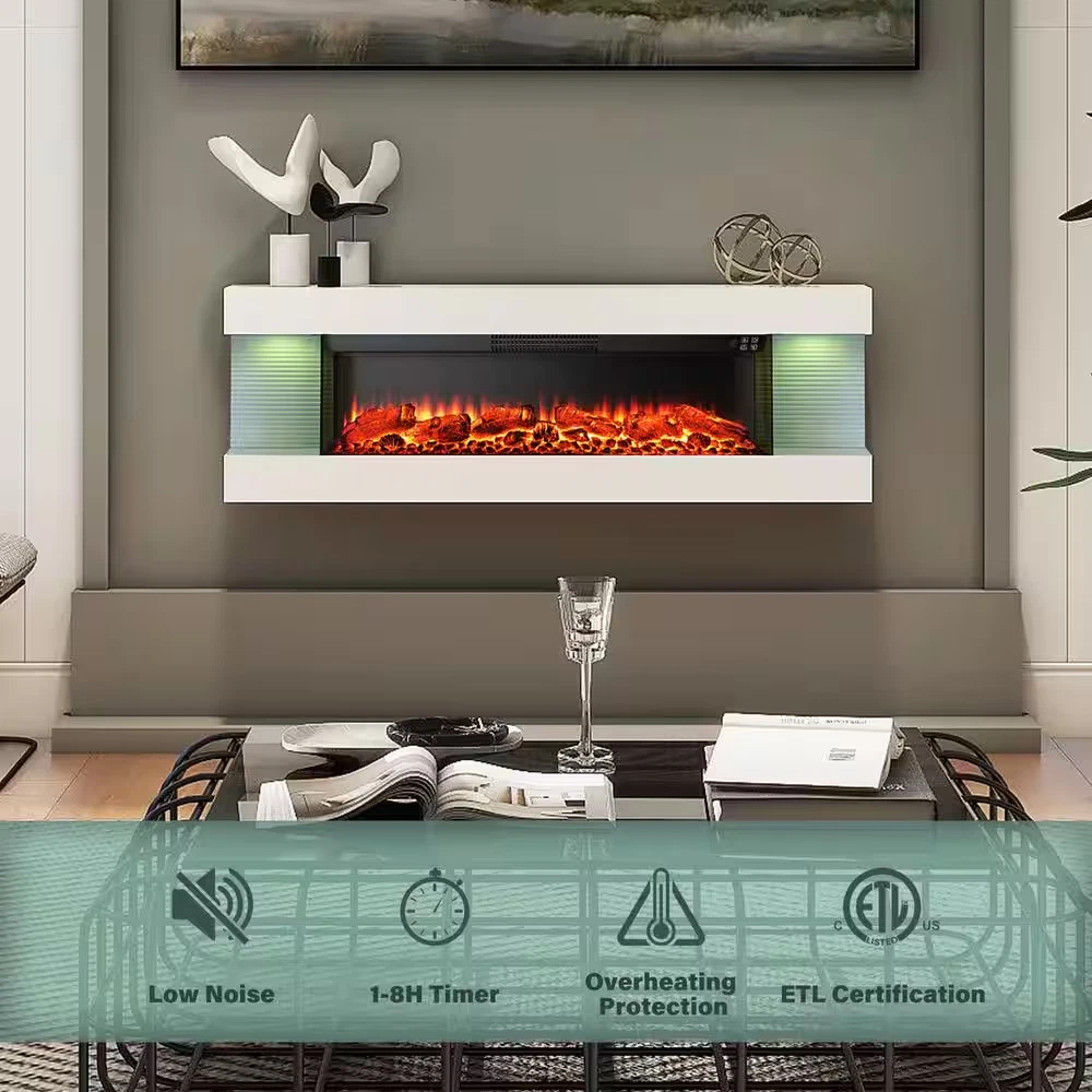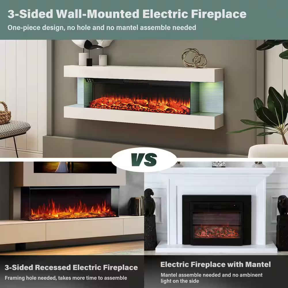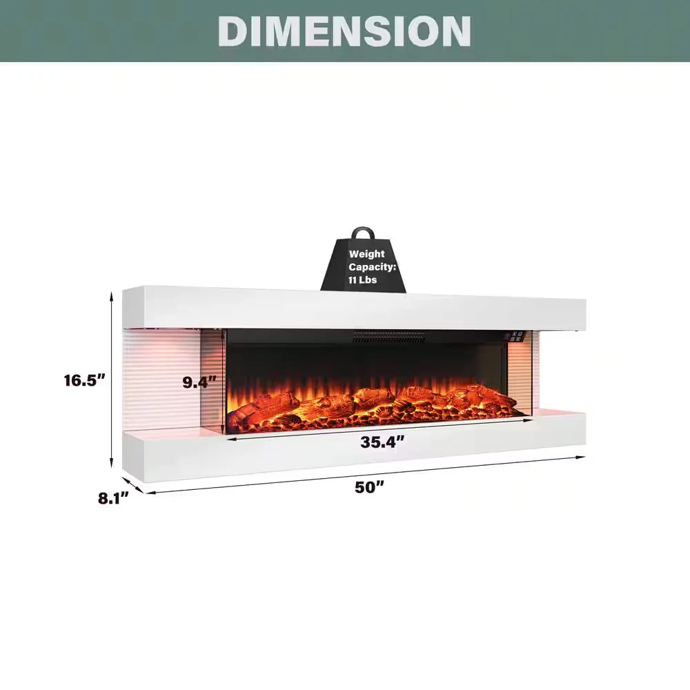 Fast Shipping On All Items 30 Days Money Guarantee Customer Support Excellent Service 100% Satisfaction Satisfaction Guaranteed 50 In. 3-Sided Wall Mounted Electric Fireplace with Remote Control in White Specification Amperage (A) 12.5 A Area Heated (sq ft) 400 sq ft Assembly Required Yes Color Family White Color/Finish White-3 Sided Exterior Material Metal,Plastic Features Adjustable Flame Colors,Timer Heat Output (BTU/hour) 5000 Included No Additional Items Included Mount Type Wall Mount Pack Size 1 Power Connection Plug-In Product Weight (lb) 50.7 lb Returnable 90-Day Surround Material Metal Voltage (V) 120 V Wattage (W) 1500 W Certifications and Listings ETL Certified Manufacturer Warranty 90 Days Assembled Depth (in) 8.1 in Assembled Height (in) 16.5 in Assembled Width (in) 50 in Firebox Depth (in) 7.9 Firebox Height (in) 9.4 Firebox Width (in) 35.4 50.0 inches x 8.1 inches x 16.5 inches. Weight: 50.7 lb Item Description 12 dazzling flame colors and 8 multi-color side LED lights design Overheat protection keeps your family safe 2-level (750W/1500W) heating warms rooms fast Tired of browsing the same bulky electric fireplaces with complicated mantel assemblies? Revolutionize your space with our all-in-one, integrated 3-sided fireplace. This is not just another heater, it's a statement piece of modern design, engineered for the discerning homeowner who values both style and simplicity. About us We offer the best prices around on high quality products. Our E-store includes media such as books, movies, music and games while offering electronics, toys, sporting apparel, clothing, tools, general home, garden items and more. Shipping We are always working hard to ensure your package arrives as soon as possible. Please understand that some factors like weather, high postal traffic, and the performance of shipping companies are outside of our control. We offer free shipping to the lower 48 states and ship within 2-3 business days of payment, usually sooner. We do not accept P.O. Boxes. Please provide a physical address. For shipping outside of the continental USA, we only use eBay's Global Shipping Program.The item is shipped to KY and then sent to the rest of the world. International customers are responsible for all duties and taxes. Continue to check out to calculate costs for shipping the item to your country. Messages regarding eBay's Global Shipping Program MUST be directed at eBay EXCLUSIVELY. Returns We offer a 30-Day Return Policy on items in which you are not completely satisfied with. You have the option of a full-refund or an exchange of the item. No returns are available on items shipped outside of the USA Satisfaction We try over very best to make sure every customer is completely satisfied. If there's a problem, message us! We're happy to help. Payment Options Shop With Confidence