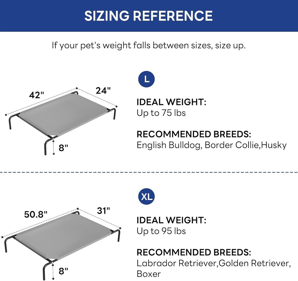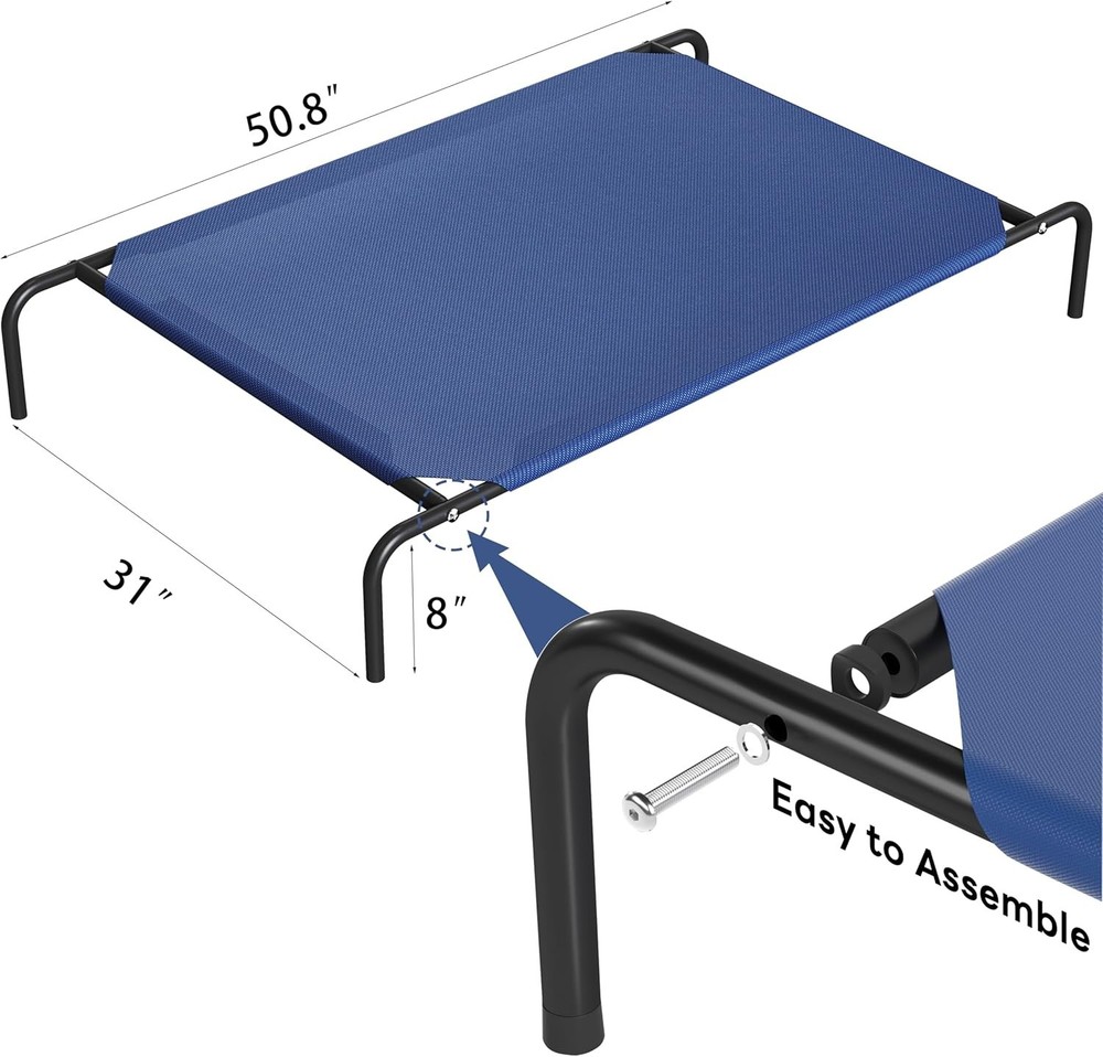 50" Elevated Dog Bed – Raised Cooling Cot for Large Dogs, Outdoor Pet Hammock Description : 【Product Dimensions】This raised dog bed measures 50.8" L x 31.5" W x 8" H (elevated sleeping area: 43.3" x 31") .Supports dogs up to 95 lbs 【Sturdy and Stable】These dog cots beds for large dogs are made of heavy-duty, rust-proof steel tubes and non-slip rubber feet—supports energetic dogs without wobbling, even during playtime 【Easy-Clean Teslin Mesh】Breathable, quick-dry fabric resists odors and water stains. Simply rinse with a hose, wipe clean, or machine wash,and the outdoor dog bed also dries quickly 【Quick Assembly】No tools needed—follow attached instructions for easy setup/disassembly. Lightweight yet sturdy for moving between home, patio, or camping 【Multiple Uses】Weather resistant, the 8" raised breathable mesh cot works great indoors and outside. Elevation keeps pets cool in summer and insulated from cold floors in winter