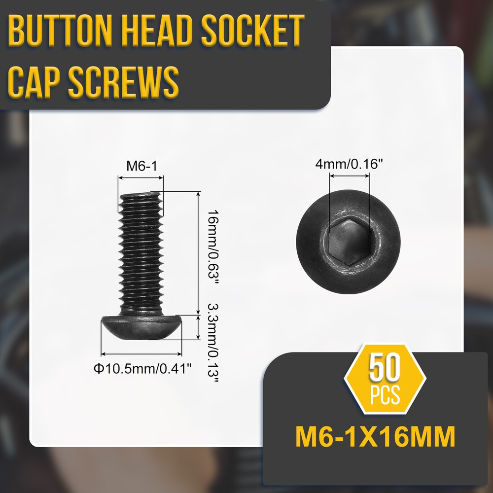 Document Product Details:Color: BlackMaterial: Carbon SteelFinish: Black OxideThread Type: Coarse ThreadThread Dia.: M6Thread Pitch: 1mm/0.04"Thread Length: 16mm/0.63"Head Dia.: 10.5mm/0.41"Head Thickness: 3.3mm/0.13"Hexagon Width: 4mm/0.16"Package Content: 50pcs x Button Head Hex Socket ScrewsMaterial - Constructed with carbon steel material with black oxide treatment, the hex socket cap screw is of stronger durability, has a bright appearance, is not easier to deform or corrode, and has a long service life than other surface finishes.Feature - The button socket head cap screw is designed with an inner hex drive style and pan head, providing a higher torque and clamping force, as well as offering a wider bearing surface and high tensile strength. Application - Good replacement parts and construction fasteners for cars, bicycles, communication equipment, and ship assembly.Installation - To access this hex drive screw, you will need to use a hex wrench to tighten or loosen it. The socket button head design enhances torque capabilities, allowing for greater clamping force. For optimal results, it is recommended to use a retaining washer to lock the hex drive in place securely. M6-1x16mm Button Head Socket Cap Screws 50Pack Carbon Steel Black Product Details: Color: Black Material: Carbon Steel Finish: Black Oxide Thread Type: Coarse Thread Thread Dia.: M6 Thread Pitch: 1mm/0.04" Thread Length: 16mm/0.63" Head Dia.: 10.5mm/0.41" Head Thickness: 3.3mm/0.13" Hexagon Width: 4mm/0.16" Package Content: 50pcs x Button Head Hex Socket Screws Material - Constructed with carbon steel material with black oxide treatment, the hex socket cap screw is of stronger durability, has a bright appearance, is not easier to deform or corrode, and has a long service life than other surface finishes. Feature - The button socket head cap screw is designed with an inner hex drive style and pan head, providing a higher torque and clamping force, as well as offering a wider bearing surface and high tensile strength. Application - Good replacement parts and construction fasteners for cars, bicycles, communication equipment, and ship assembly. Installation - To access this hex drive screw, you will need to use a hex wrench to tighten or loosen it. The socket button head design enhances torque capabilities, allowing for greater clamping force. For optimal results, it is recommended to use a retaining washer to lock the hex drive in place securely. Hot Item Payment 1.We accept eBay payment . 2.Payment must be received within 7 business days of auction closing. Shipping 1.We ship to your eBay or Paypal address. Please make sure your eBay and Paypal address is correct before you pay. 2.Items will be shipped within 1-3 business day when we received payment. 3.Delivery time depends on destination and other factors. Description Policy M6-1x16mm Button Head Socket Cap Screws 50Pack Carbon Steel Black Product Details: Color: Black Material: Carbon Steel Finish: Black Oxide Thread Type: Coarse Thread Thread Dia.: M6 Thread Pitch: 1mm/0.04" Thread Length: 16mm/0.63" Head Dia.: 10.5mm/0.41" Head Thickness: 3.3mm/0.13" Hexagon Width: 4mm/0.16" Package Content: 50pcs x Button Head Hex Socket Screws Material - Constructed with carbon steel material with black oxide treatment, the hex socket cap screw is of stronger durability, has a bright appearance, is not easier to deform or corrode, and has a long service life than other surface finishes. Feature - The button socket head cap screw is designed with an inner hex drive style and pan head, providing a higher torque and clamping force, as well as offering a wider bearing surface and high tensile strength. Application - Good replacement parts and construction fasteners for cars, bicycles, communication equipment, and ship assembly. Installation - To access this hex drive screw, you will need to use a hex wrench to tighten or loosen it. The socket button head design enhances torque capabilities, allowing for greater clamping force. For optimal results, it is recommended to use a retaining washer to lock the hex drive in place securely. Hot Item Payment 1.We accept eBay payment . 2.Payment must be received within 7 business days of auction closing. Shipping 1.We ship to your eBay or Paypal address. Please make sure your eBay and Paypal address is correct before you pay. 2.Items will be shipped within 1-3 business day when we received payment. 3.Delivery time depends on destination and other factors.