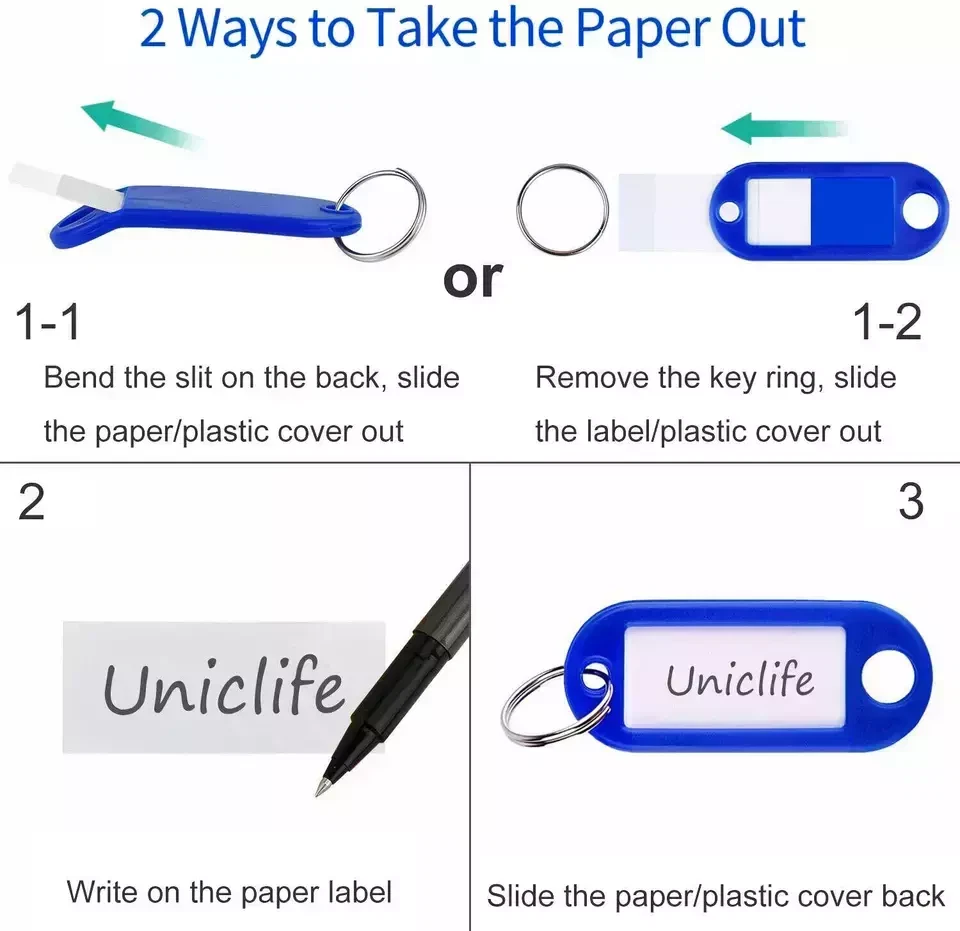 Description: The label can be slid out and replaced / edited quickly and easily Label is protected by a clear plastic cover. Complete with split ring attachment Ideal tags for work keys, house keys, car keys, etc Great for luggage, backpacks, gym bags and more Material: Plastic Size: approx 5*2cm(2.1X0.8 in) The insert paper size: approx 3*1.5cm (1.25X0.6 in)