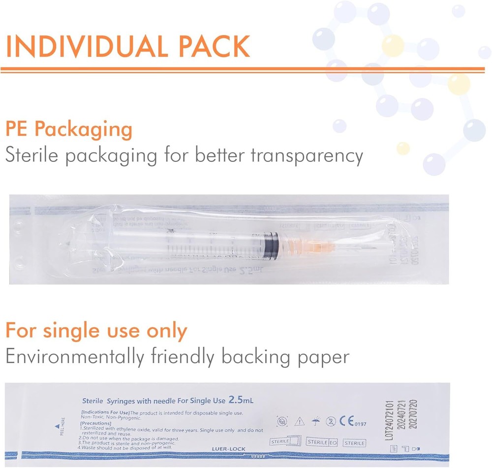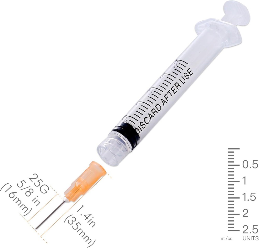 Free eBay listing template designed by dewiso.com 50 Pack 2.5ml Syringe with Needle 25G 5/8 Inch, Disposable Luer Lock Syringes, Individual Sterilized Wrapped FREE AND FAST SHIPPING! About this item 50 Pack Sryinge with Needle: Includes 50 individually packaged 2.5ml Luer Lock syringes, each featuring a 25 gauge 5/8 inch needle, all sealed for maximum sterility. Clear Measurement Markings: Easy-to-read, precise measurements on the syringe ensure accurate dosing every time. Luer Lock Design: Secure Luer Lock connection prevents the needle from detaching during use. Smooth and Easy Handling: The smooth plunger and leak-proof design allow for effortless, one-handed operation. Note: Not for professional medical use. Ideal for pets (dogs, cats), industrial applications, scientific labs, liquid dispensing, and home use. Product We offer a 30-Day Return Policy on items which you are not completely satisfied with. You have the option for a full-refund or an exchange of the item. No returns are available on items shipped outside of the US . Shipping We offer Free Shipping to the US and ship within 2 business days of payment, usually sooner. We use UPS express shipping. That's why your products are usually delivered within 3 days . Contact We try our very best to make sure every customer is completely satisfied. If there's a problem , message us! We're happy to help. 24/7 live chat available.