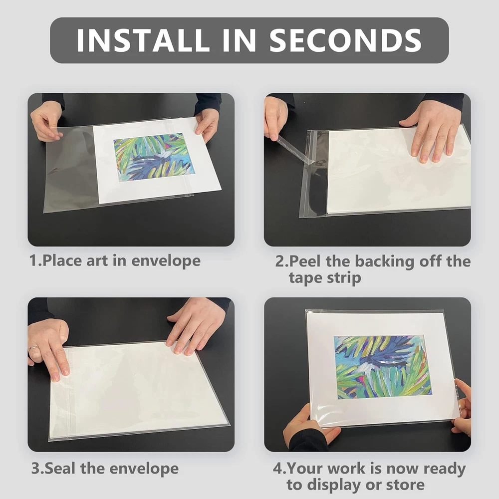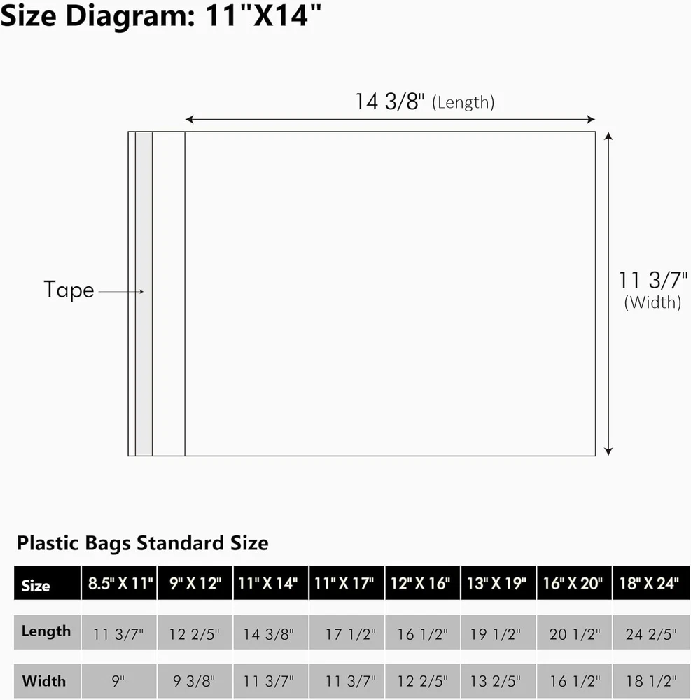 50 Pack Acid-Free Crystal Clear Sleeves Storage Bags for 11x14 50 Product Details Product Dimensions: 14 x 11 x 1 inches Item Weight: 15.8 ounces Manufacturer: Somime Country of Origin: China What You Can Get: The package contains 50pcs crystal clear bags which can satisfy your daily needs. A flat and smooth surface is easy to remove marks or strokes with just a paper towel. Sealed plastic bags allow for reuse, better than permanent glue which is the ultimate protection and cannot be opened again without tearing the bag. Transparent Bags: Somime plastic sleeves measure 11 3/7" W x 14 3/8" L. It is crystal clear to see the items, fitting for photograph packaging. You can combine them with picture mats and backing boards to create a better display effect. What's more, we have various sizes available, convenient to choose your desired one. Durable Material: Somime art print sleeves are made of thickened material and are 1.59 mil (single side) thick. Sturdy bags can provide optimum protection and durability, keeping the items inside for a longer time. (Not suitable for storing pointed things that will break the plastic bags) Extensive Use: Art print sleeves can be used for posters, cards, documents, paper, clothes, and numerous articles that need to be preserved, an essential tool for family life. Sleek and adhesive bags with no exhaust holes maintain the beauty of your artwork, but make everything well-protected without twist ties.