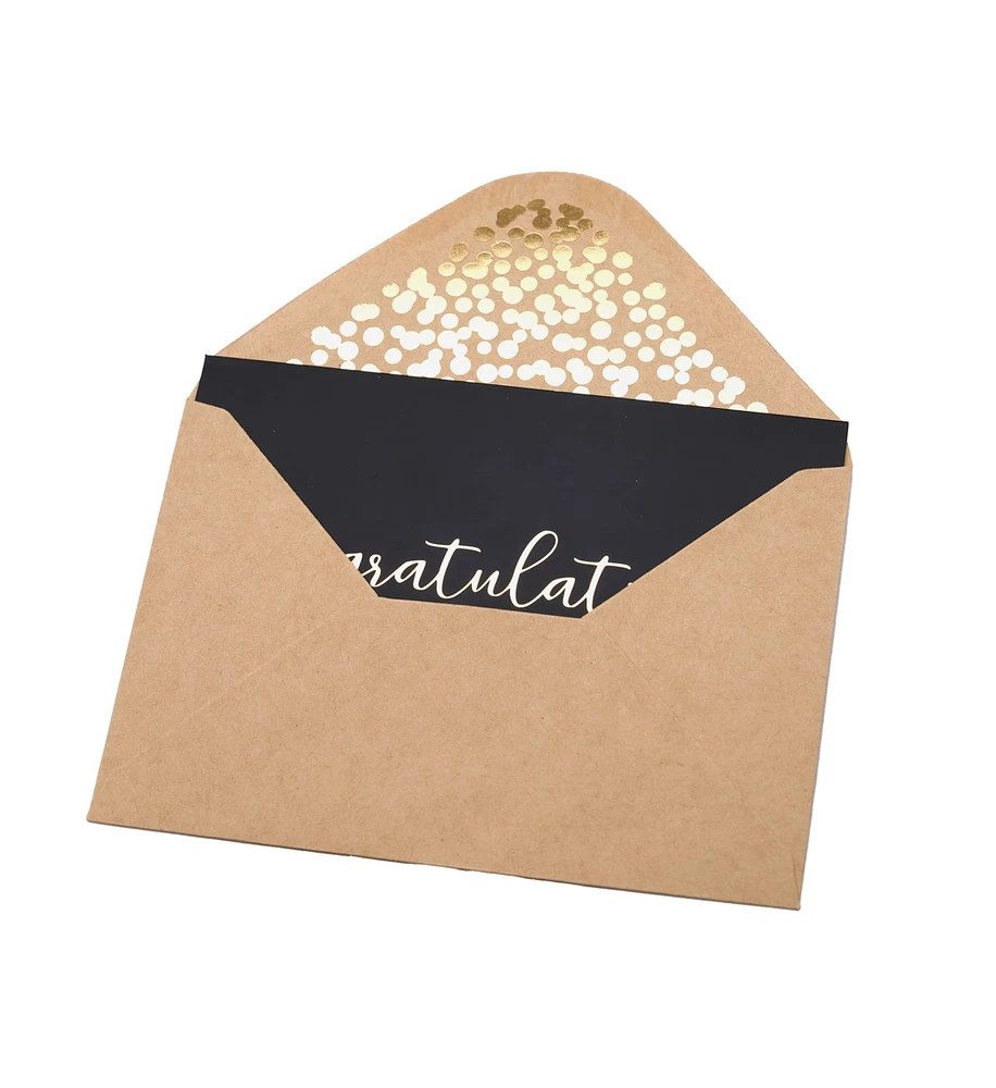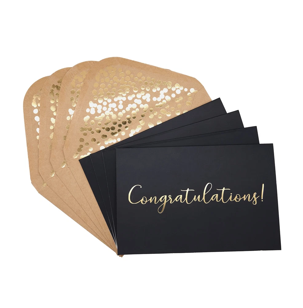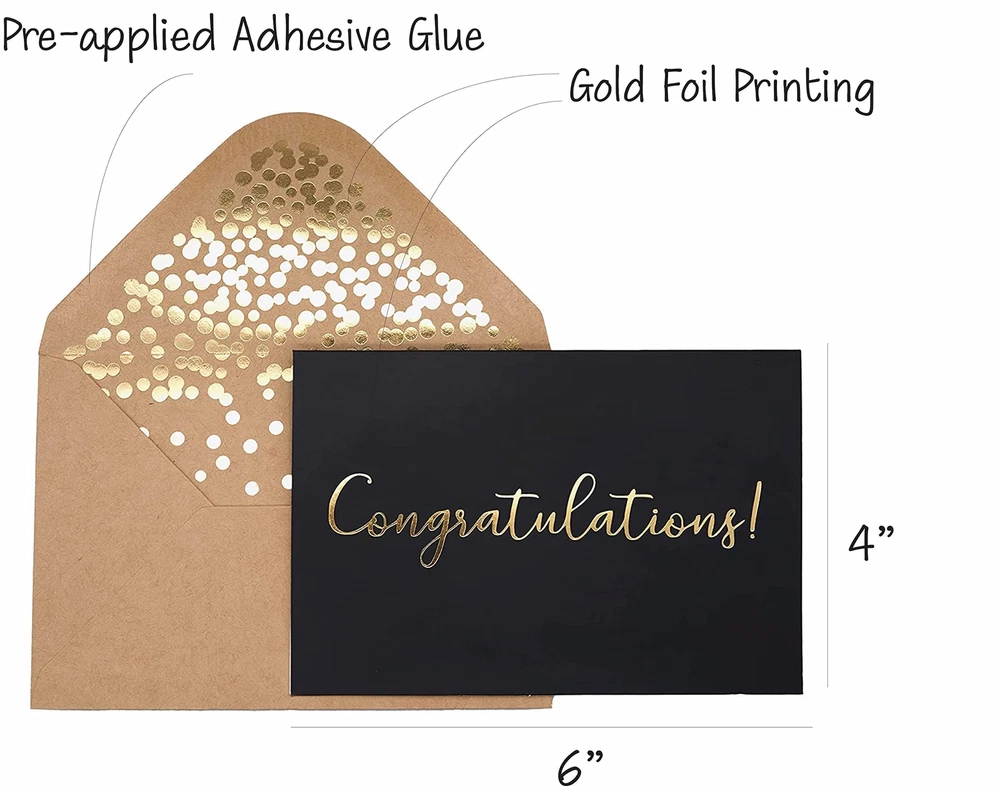 ELEGANT & STYLISH- Each card embossed with word '’Congratulations’’ in Gold Foil Letters, with smooth matte finish creates an elegant and stylish look. Perfect for someone's special big day! PREMIUM QUALITY- Each card is made with high-quality 250 gsm paper card for extra durability. Each card embossed in Gold Foil Letters. Each Kraft Envelope Emboss in Gold Foil designs. USE FOR MANY OCCATIONS- Our simple and elegant one of a kind congratulation cards comes with blank on inside, Plenty of room to write your thoughts and messages. Suitable for Wedding, Graduation, Bridal Shower, Anniversary, engagement, newborn and many more. VALUE PACK BUNDLE AND DIMENSION- Package comes with 50 cards and 52 Kraft Envelopes. Each card measures 4 x 5.75 inches. 100% COMPLETE SATISFACTION- If for ANY reason you not satisfied with our '’Elegant Congratulations Card'' purchase, Partay Shenanigans guarantees 100% easy hassle free return within 30 days after purchase for FULL REFUND or exchange with no questions asked! ELEGANT & STYLISH - Each card embossed with word '’Congratulations’’ in Gold Foil Letters, with smooth matte finish creates an elegant and stylish look. Perfect for someone's special big day! PREMIUM QUALITY - Each card is made with high-quality 250 gsm paper card for extra durability. Each card embossed in Gold Foil Letters. Each Kraft envelopes inner flap Emboss in Gold Foil designs USE FOR MANY OCCASIONS - Our simple and elegant one of a kind congratulation cards comes with blank on inside, plenty of room to write your thoughts and messages. Suitable for Wedding, Graduation, Bridal Shower, Anniversary, Engagement, Newborn and many more VALUE PACK BUNDLE AND DIMENSION - Package comes with 50 cards and 52 Kraft Envelopes. Each card measures 4" x 6" inches, Envelope measures 4.2” x 6.2'' inches. Card color: BLACK