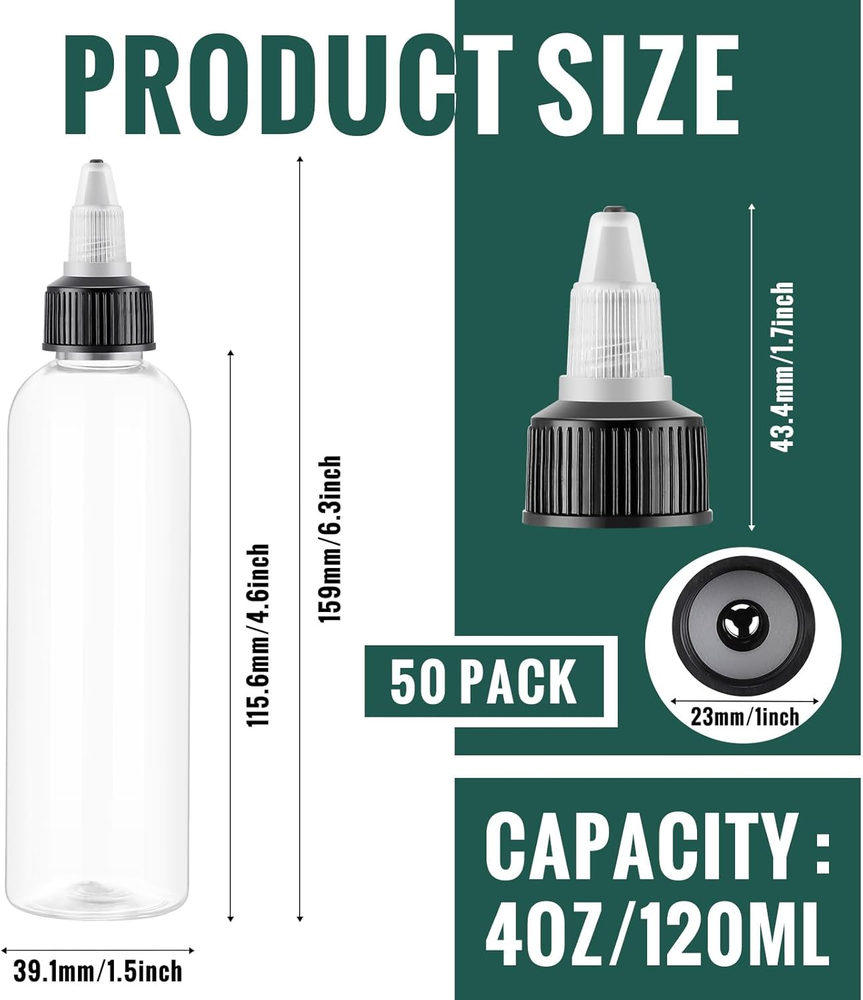 Rich Package: you will be provided with 50 pieces of 4 oz/ 120 ml condiment squeeze bottles in a package, adequate quantity can fully meet your daily needs, also you can share with intimate mates and family members PET Material: made of low density PET plastic material, 4 oz plastic bottles are sturdy yet squeezable, feature good flexibility and high temperature resistance, which will not deform in most solvents, and can be widely applied to tattoo, industrial, scientific laboratory Twist Cap Spout Design: empty squeeze bottle is designed with a twist cap spout, twist the upper cap and the dropper can be well controlled, thus convenient for you to apply a small amount of product to the targeted area, such as applying for cakes, candies, cookies etc., effectively controlling flow, avoiding spills due to over squeezing, and performing well in anti leaking Easy to Use: adopting clear color, plastic squeeze bottles for liquids are easy for you to see the level of contents in the bottle, keeping your items organized and reminding you to replenish the bottle solution in time Wide Application: twist top applicator bottle is indispensable for storing and dispensing a wide variety of liquids and thinners, including oils, solvents, also ideal for white and yellow glues for crafting and woodworking, even to store inks, paints Product description Made of low-density PET plastic material, strong and easy to extrude, good flexibility and high temperature resistance. Screw lid has good sealing, leak-proof performance, suitable for most liquid. Designed with a screw lid nozzle, screwing the top lid gives you good control of the dropper, making it easy for you to apply a small amount of product to the target area.
