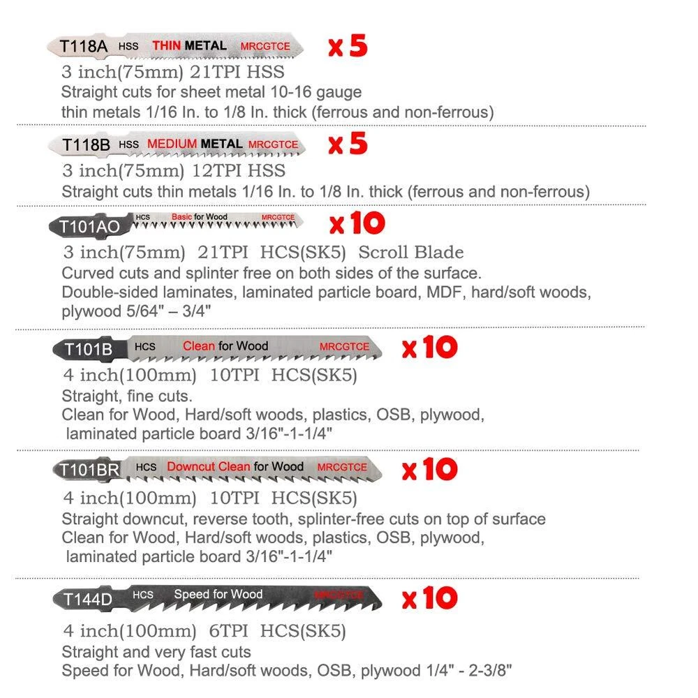 50 Piece Contractor Jigsaw Blades Set with Storage Case, Assorted T-Shank Jig Saw Blades for Wood, Plastic and Metal Cutting(T118A,T118B,T101AO,T101B,T101BR,T144D) 50 Piece Assorted T-Shank Jig saw Blades for Wood, Plastic and Metal Cutting Specific ●5 x T118A Jigsaw Blade, 3 inch(75mm) 21TPI Basic for Metal, straight cuts sheet metal 10-16 gauge, thin metals 1/16" - 1/8" (ferrous and non-ferrous). ●5 x T118B Jigsaw Blade, 3 inch(75mm) 12TPI Basic for Metal, straight cuts medium-thin metals 1/8" - 1/4" (ferrous and non-ferrous). ●10 x T101AO Jigsaw Scroll Blade, 3 inch(75mm) 21TPI Curved cuts and splinter free on both sides of the surface Clean for wood, double-sided laminates, laminated particle board, MDF, hard/soft woods, plywood 5/64" – 3/4" ●10 x T101B Jigsaw Blade, 4 inch(100mm) 10TPI Straight, fine cuts. Clean for wood, hard/soft woods, plastics, OSB, plywood, laminated particle board 3/16"-1-1/4" ●10 x T101BR DOWNCUT Jigsaw Blade, 4 inch(100mm) 10TPI Reverse tooth, splinter-free cuts on top of surface Clean for wood, hard/soft woods, plastics, OSB, plywood, laminated particle board 3/16"-1-1/4" ●10 x T1444 Jigsaw Blade, 4 inch(100mm) 6TPI Straight and very fast cuts. Speed for wood, hard/soft woods, OSB, plywood 1/4" - 2-3/8" Set includes a durable storage case to keep blades organized for easy access. SUPERIOR VALUE: Why pay $5-$10 per blade? Our saw blades match & exceed name-brand quality at a fraction of the price. 50 Piece Contractor Jigsaw Blades Set. Meet your everyday needs. INCLUDING:5 pcs T118A(3",21TPI) for THIN METAL cutting, 5 pcs T118B(3",12TPI) for MEDIUM METAL cutting, 10 pcs T101AO(3",21TPI) SCROLL BLADE CLEAN for wood, 10pcs T101B(4",10TPI) CLEAN for wood, 10 pcs T101BR(4",10TPI) DOWNCUT CLEAN for wood, 10 pcs T144D(4",6TPI) SPEED for wood. TOUGHER THAN MOST: HCS-Made with SK5 high-carbon steel(50 times better than CRV) for maximum life in wood material for straight , clean and speed cuts. HSS-Made with genuine HIGHT SPEED STEEL. High Quality manufacturing to provide superior wear tolerance and life.Proper lubricant is recommended when cutting metal FIT MOST MAJOR BRAND JIG SAW: Jig Saw blade T-Shank fits most major brands jig saws. T-shank design fits BOSCH and DEWALT jig saws. CONVENIENCE: Set includes a durable storage case to keep blades organized for easy access. Shipping from the USA All of our products are shipped from the USA, ensuring quick delivery to your destination. Payment We offer the following payment methods: PayPal, credit card, bank transfer, and eBay's secure payment system. Free Shipping & Free Returns Shipping within the USA is FREE. Additionally, any return is absolutely free for you. Risk-Free Purchase You have the option to return an item within 30 days without any justification. We cover the return shipping costs! Fast Shipping We ship immediately upon receipt of payment. Generally, the package is delivered within 2-3 days in the USA. If it takes longer, we will contact you. Quality and Costs Made in Europe, USA, China No customs fees or additional charges Total satisfaction guarantee Invoice with declared VAT available upon request in .pdf format Feedback Your feedback is very important to us. After you pay for your purchase, you will automatically receive positive feedback from us.