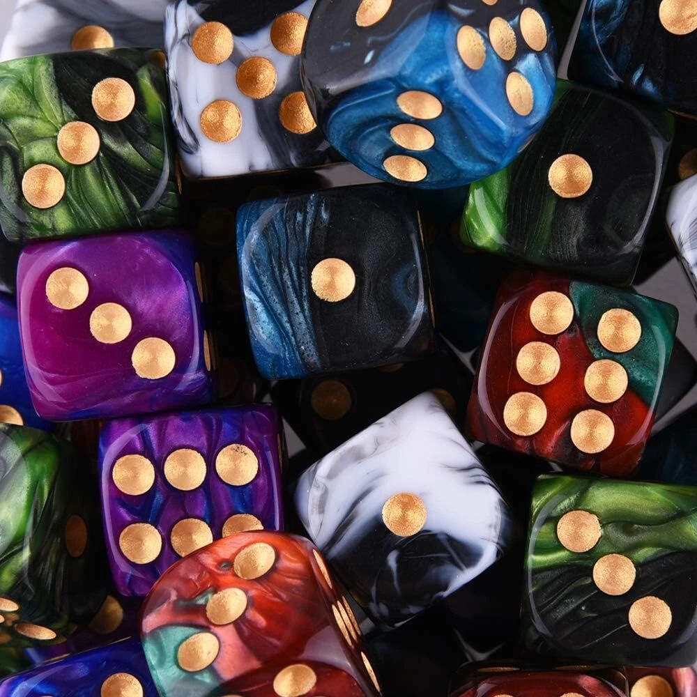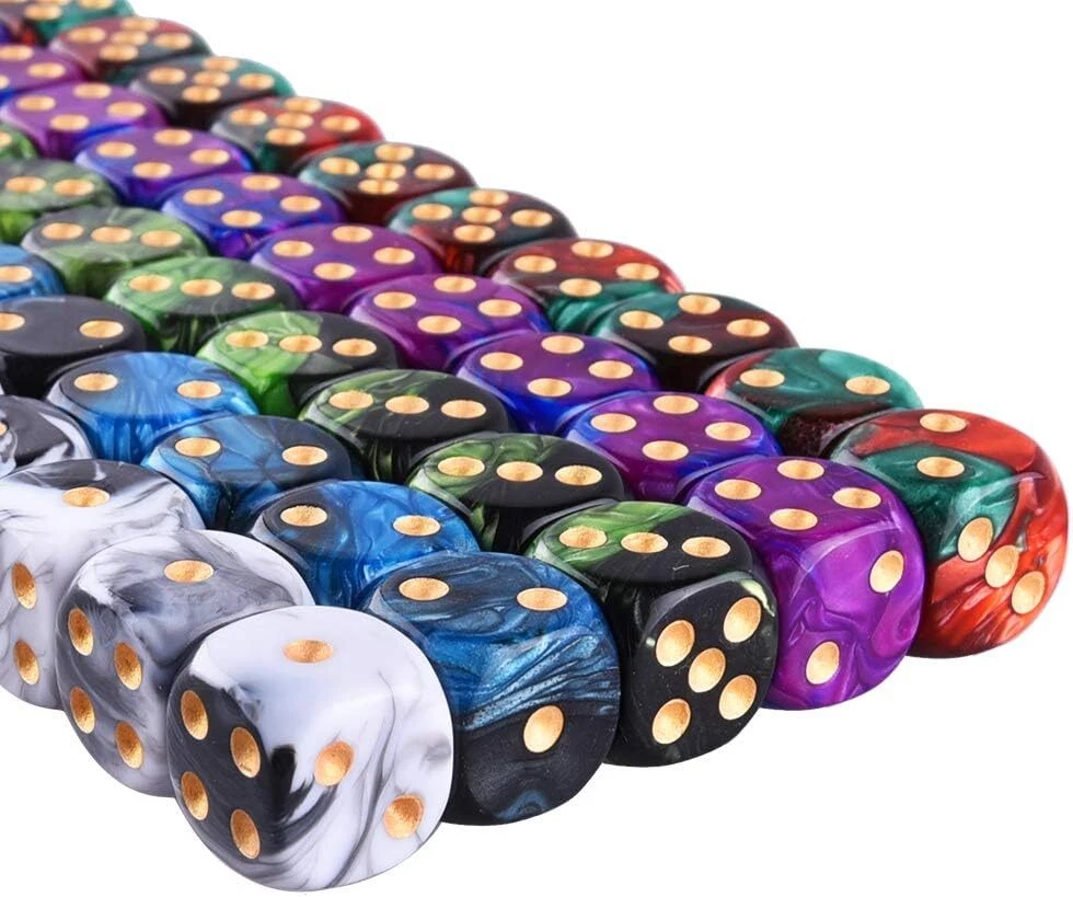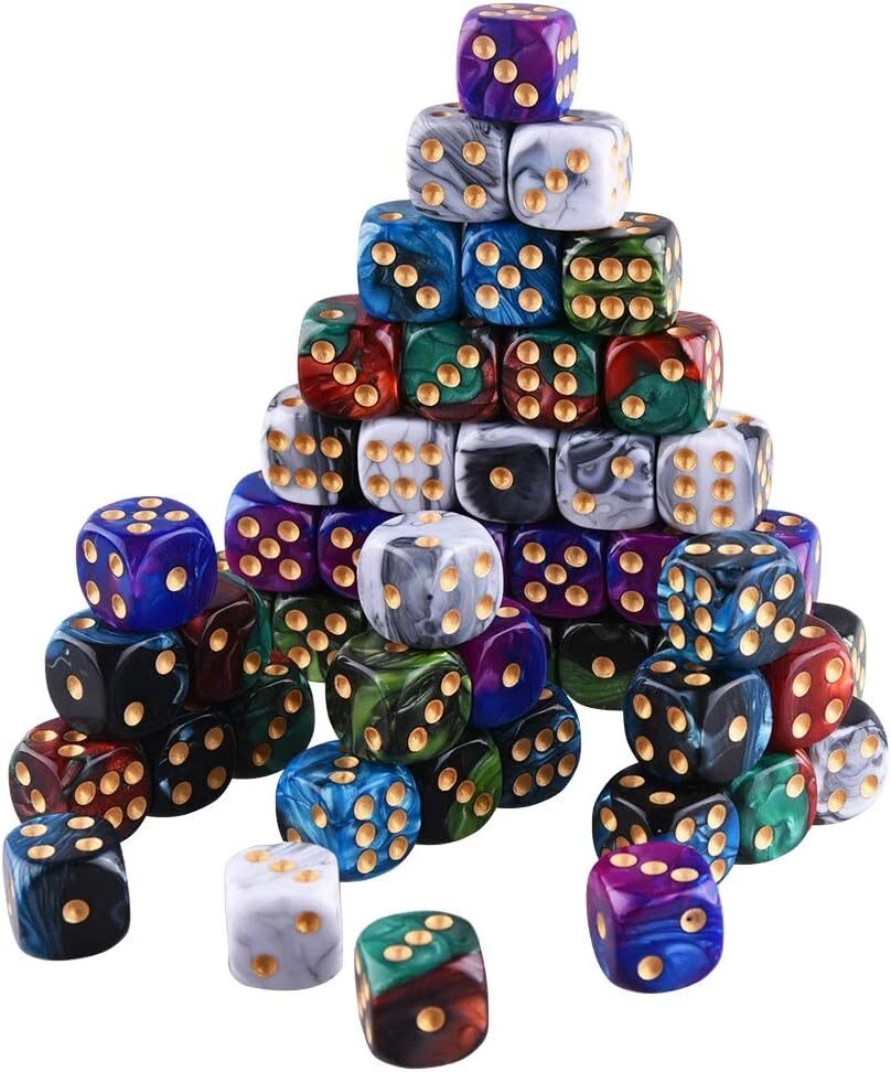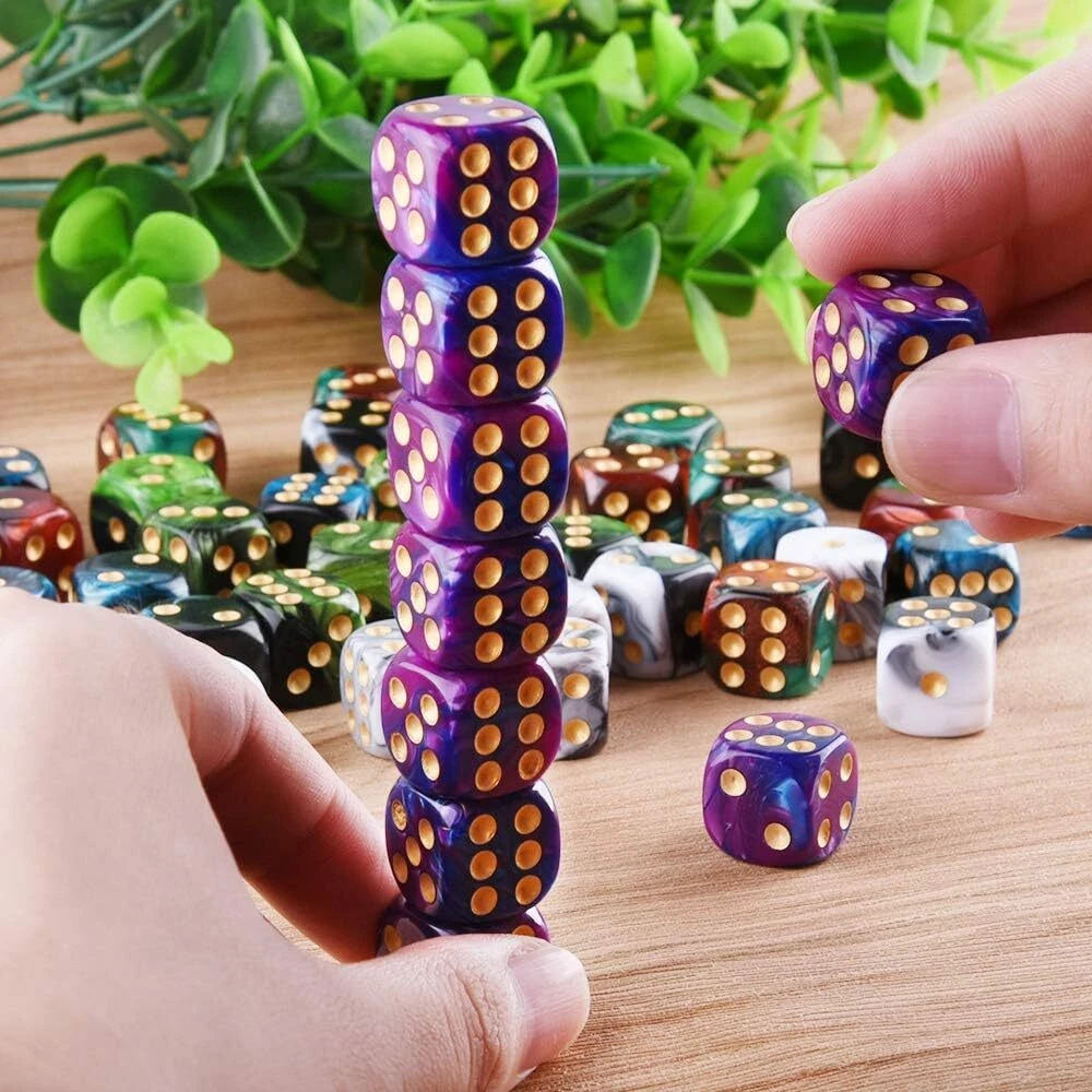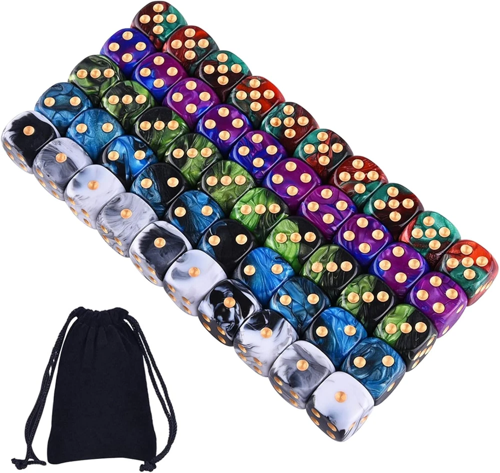 Package includes 50 pieces 6 sided dice, 5 two tone colors, 10 pieces for each color Two tone dice colors: Black& White, Blue& Purple, Black& Blue, Black& Green, Red& Green; pip color: gold Size: standard 16mm (5/8 inches) game dice, round corner, made from Eco-Friendly acrylic material Durable dice set for playing games, like Tenzi, Liar's Dice, Yahtzee, Farkle, Bunco, Casino and Teach Math, come with a velvet drawstring dice bag, free and portable Warm note: this item is not intended for use by children 12 and under. Product Description