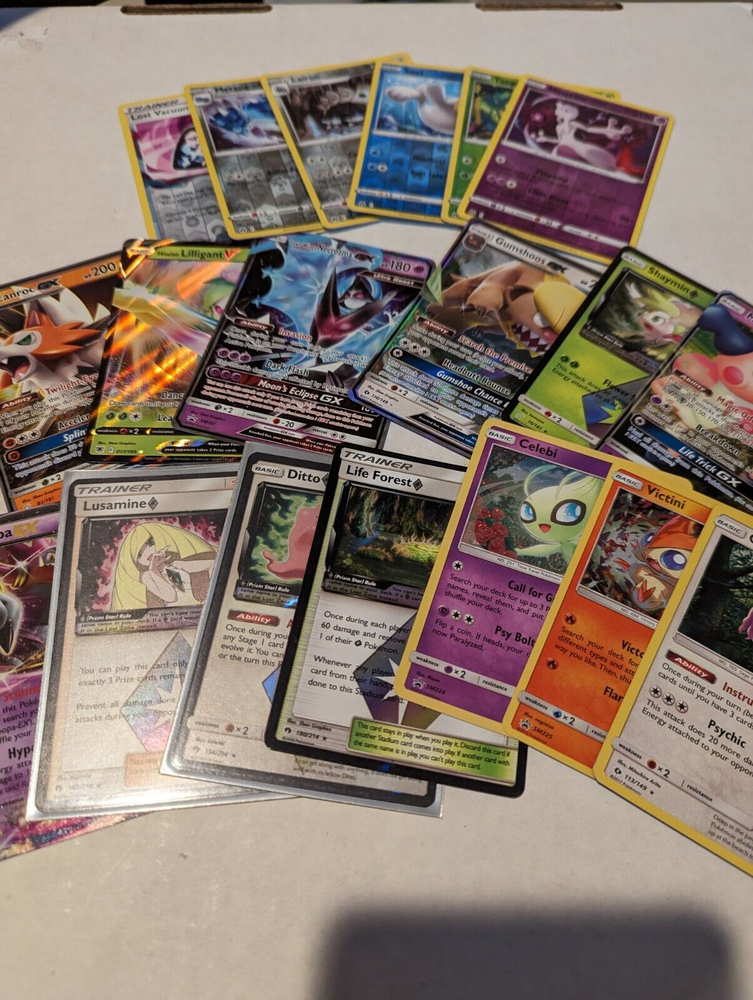 This Pokemon Card Bulk Lot includes 50+ cards with 3 rare Ultra Rare cards such as V/VMAX/EX/FA/ACE attributes. The lot features various attributes including Earth, Water, Fire, Psychic, and more. The cards come from various sets such as Fusion Strike, Sword & Shield, and Pokemon GO, with characters like Mewtwo, Gengar, and Charizard. The cards are in English and manufactured by Wizards of the Coast and Nintendo, suitable for ages 4 and above. With a mix of Regular, Holo, and Foil finishes, this bulk lot is perfect for collectors and players of the Pokemon TCG.