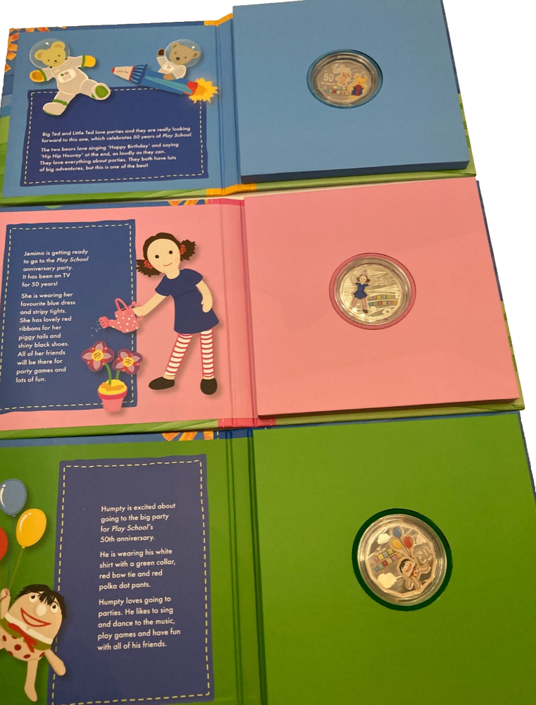50 Years Play School Three Coin Set RAM 2016 DESCRIPTION Official Royal Australian Mint commemorative three-coin set celebrating 50 Years of Play School. Presented in themed display packaging featuring Big Ted, Little Ted, Jemima and Humpty. Buyer feedback on this set: “Excellent quality, couldn’t ask for better condition or value.” DETAILS • Issuer: Royal Australian Mint (RAM) • Theme: 50 Years of Play School • Year: 2016 • Set Includes: Three commemorative coins • Characters Featured: Big Ted & Little Ted, Jemima, Humpty • Packaging: Original presentation folders and outer sleeve • Manufactured by the Royal Australian Mint under licence from the Australian Broadcasting Corporation • Made in Australia CONDITION • Very good pre-owned condition • Coins appear well preserved in original holders • Packaging shows light storage and handling wear • Complete with outer sleeve and internal folders • Refer to photos for exact condition SHIPPING • Carefully packed to protect packaging and coins