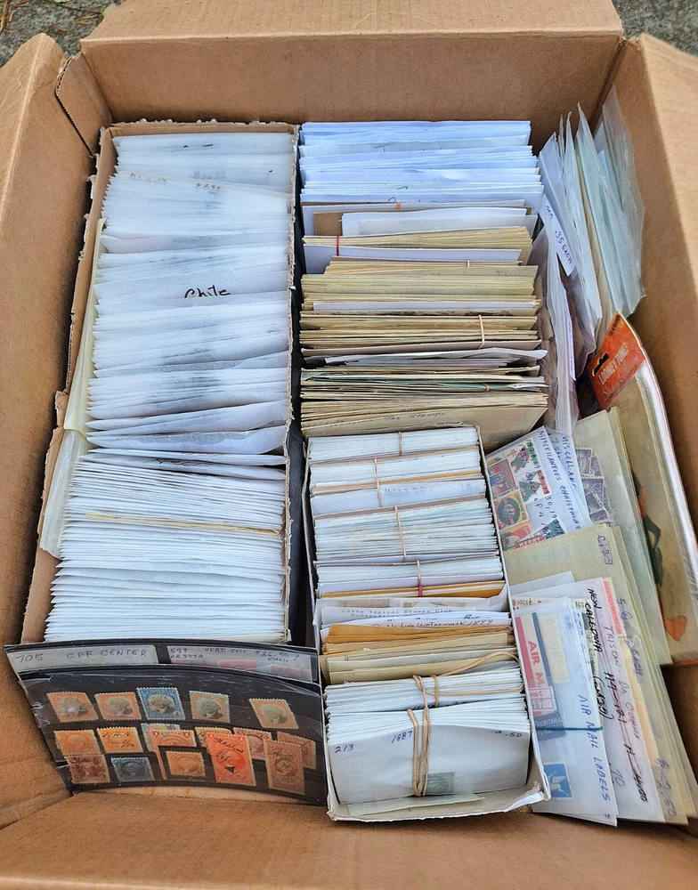 This collection has been put together over 40 years and includes 19th, 20th, and 21st Century stamps arranged in labeled envelopes, albums, dealer cards, and loose, as well as stamp paraphernalia, letters and covers, almost every single First Day Issue, stamp comics, and a multitude of album pages about 70% full in total for every country on Earth with a post office.