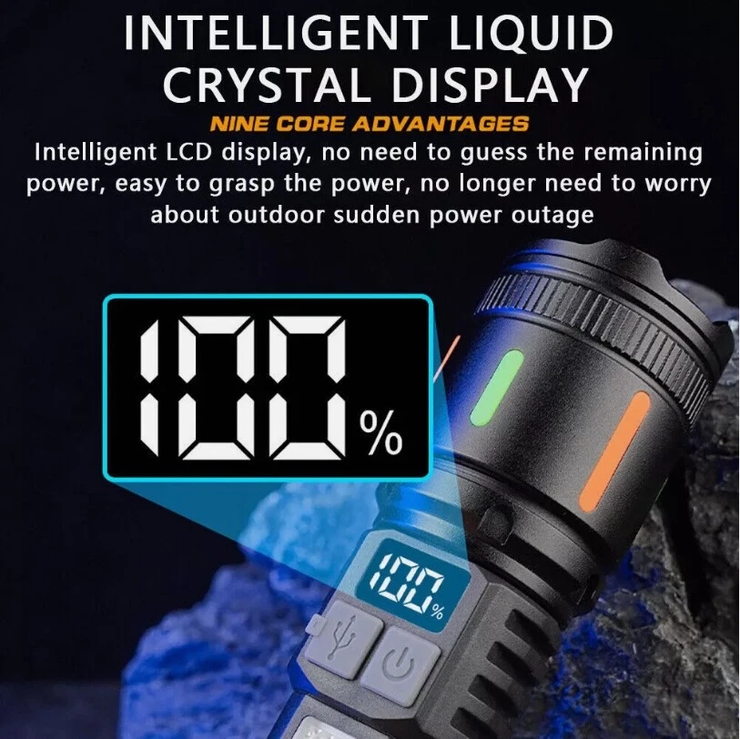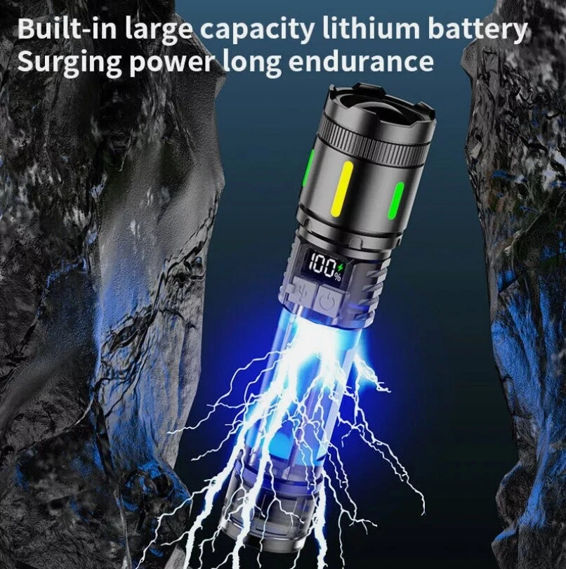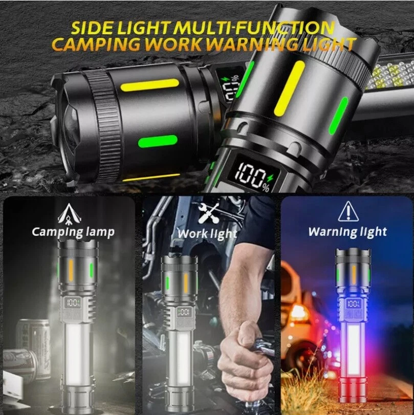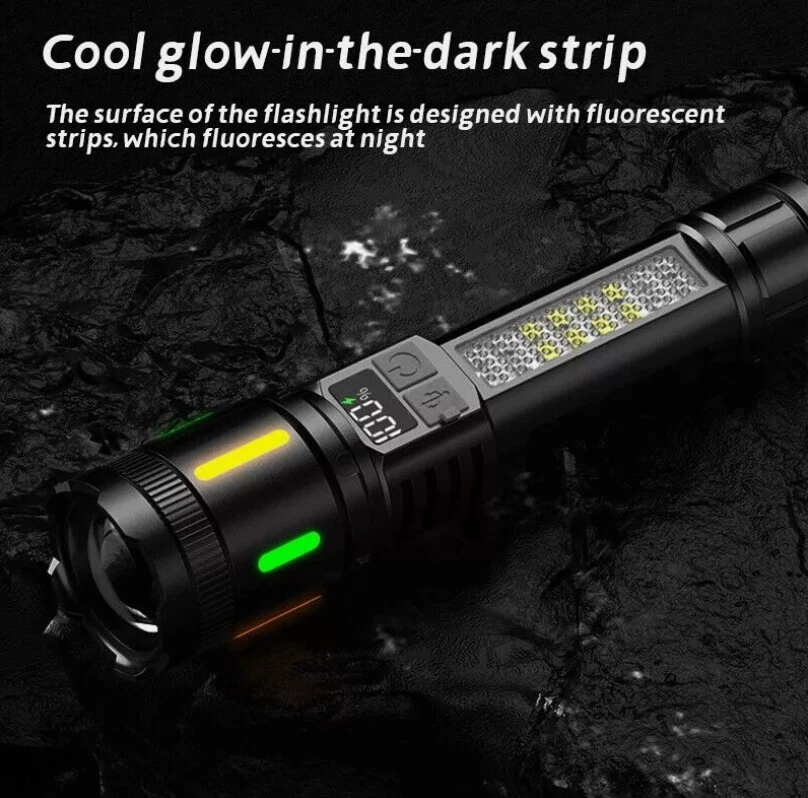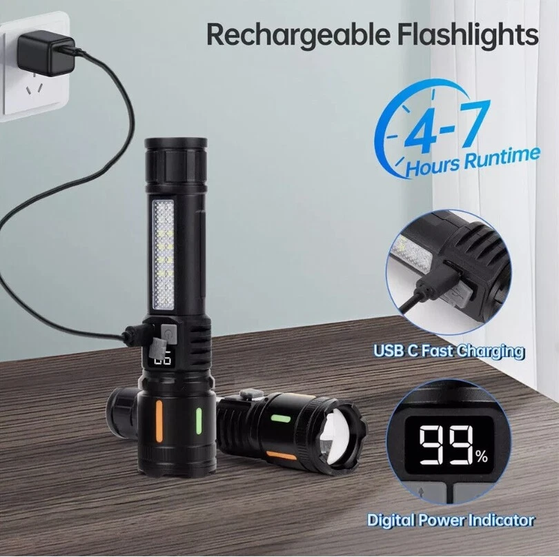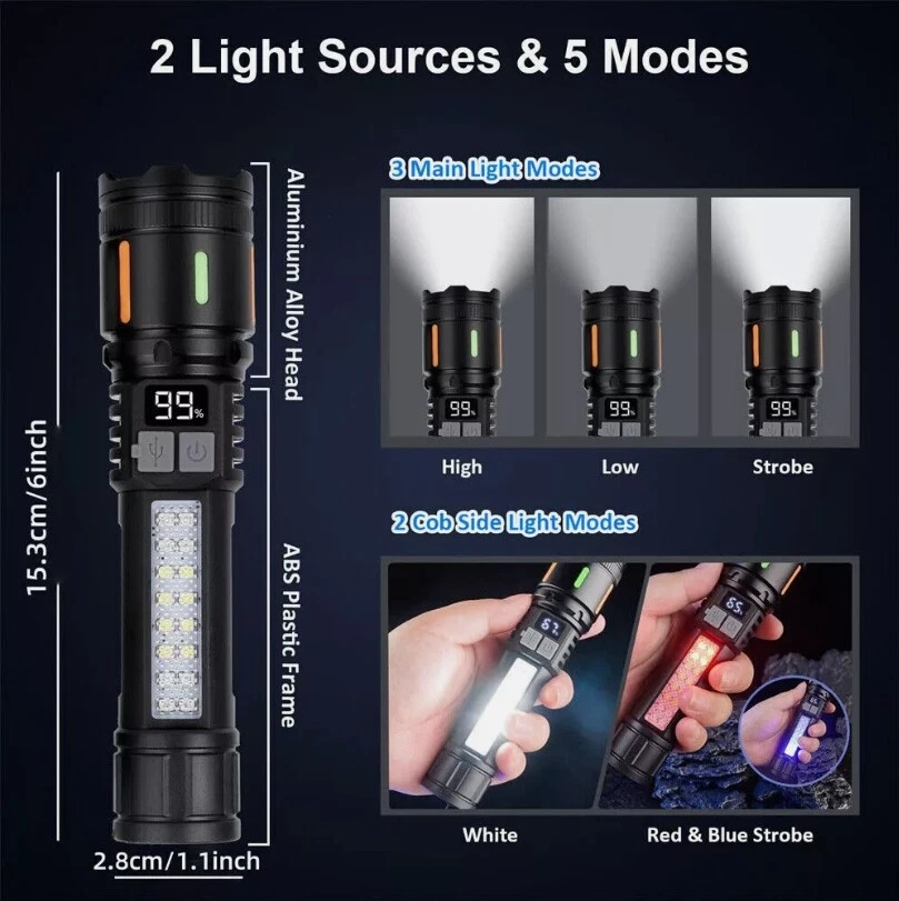 Description : Super Bright Rechargeable Flashlight: Equipped with upgraded efficient laser Chip LED chips, the rechargeable flashlight emits a stable and super bright lighting. Since the light penetration is stronger than other same-level lamp beads', its beam can pass through dust and fog well, especially suitable for foggy and rainy days with low visibility. 5 Light Modes & Zoomable Focus: There are 5 modes of the rechargeable flashlight: High / Low / Strobe for the main light, and White / Red&Blue Strobe for the COB side light. Equipped with zoomable head, the small rechargeable flashlight high lumens can emit a powerful focused lighting and an extensive extended lighting by adjusting the light head. Fast Charging & Power Indicator: Built-in a rechargeable lithium-ion battery and equipped with more energy-efficient chips, the rechargeable flashlight battery powered working time is up to 7 hours with the low mode. The USB C fast charging input achieves 30% reduction in charging time. It can be charged by power bank, USB plug, etc, with the USB C charging cable. You can clearly see the remaining power at the digital power indicator. IPX6 Waterproof: This flashlight head adopts the high grade black aluminium alloy, and the frame adopts the ABS plastic. The waterproof grade of this flash light reaches IPX6 Waterproof. This rechargeable flashlight is non-slip, shockproof, waterproof, rainproof, dustproof. It can work well in severe outdoor weather conditions, such as rain and snow. It is an ideal outdoor handheld flashlight for working, hiking, camping, repairing, hunting, and Sogidon fishing. Easy to Carry: Led flashlight is equipped with lanyard and pocket clip, which can be hung on your wrist or attach to your pocket , backpack shoulder strap, hat and belt. As its compact design, you carry this small handheld flashlight in your pocket or the car glove compartment. Specification : Product Type: Flashlight Color: Black Weight: 180g Waterproof: IPX6 Working Time: 4-7hrs Charging Time: 3.5-5hrs Material: Aluminum, Plastic Battery Capacity: 3000mAh Power Source: Battery Powered Charging Method: Type-C Charging Size: 15.3*3.5*2.8cm / 6.02*1.38*1.1inch Lighting Mode: 5 Modes(High / Low / Strobe for the main light; White / Red&Blue Strobe for the COB Side Light) Package Included: 1 x Flashlight 1 x USB Cable Note: Due to the different monitor and light effect, the actual color of the item might be slightly different from the color showed on the pictures. Thank you! Please allow 1-2cm measuring deviation due to manual measurement.