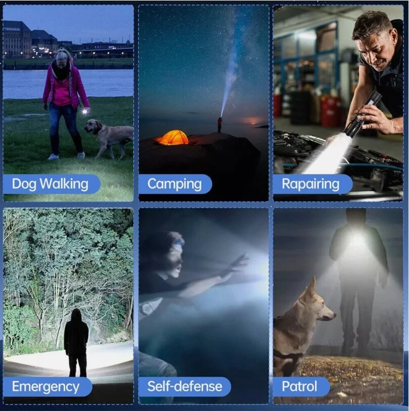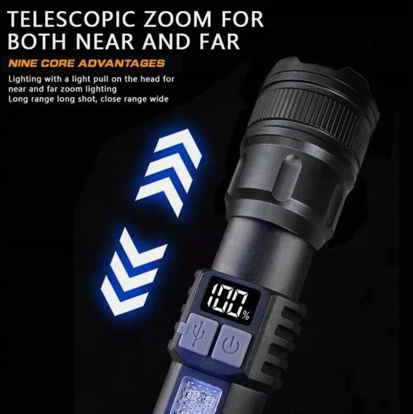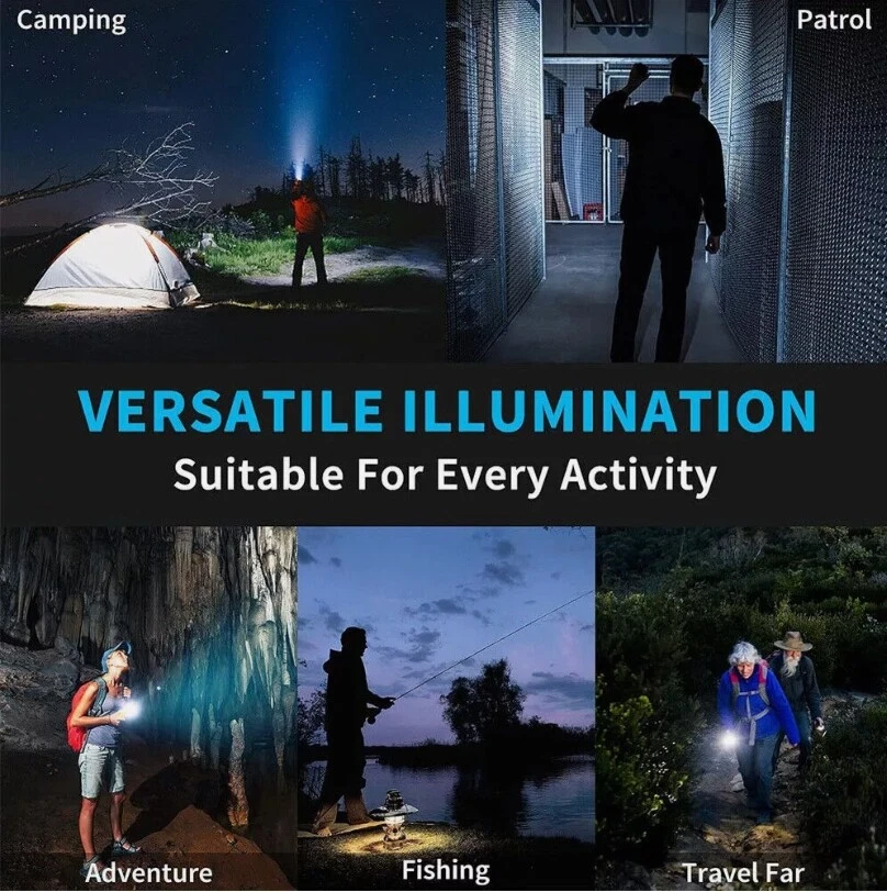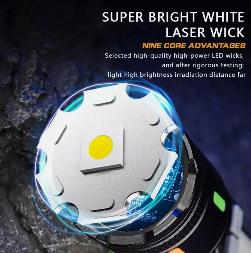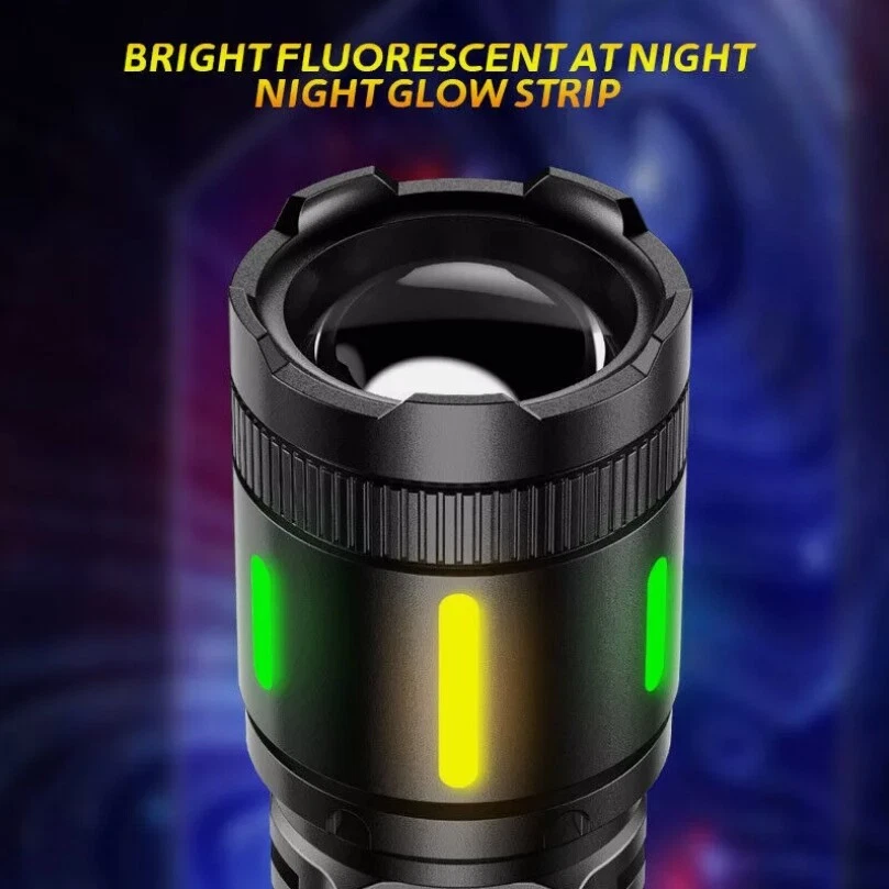 Description : Super Bright Rechargeable Flashlight: Equipped with upgraded efficient laser Chip LED chips, the rechargeable flashlight emits a stable and super bright lighting. Since the light penetration is stronger than other same-level lamp beads', its beam can pass through dust and fog well, especially suitable for foggy and rainy days with low visibility. 5 Light Modes & Zoomable Focus: There are 5 modes of the rechargeable flashlight: High / Low / Strobe for the main light, and White / Red&Blue Strobe for the COB side light. Equipped with zoomable head, the small rechargeable flashlight high lumens can emit a powerful focused lighting and an extensive extended lighting by adjusting the light head. Fast Charging & Power Indicator: Built-in a rechargeable lithium-ion battery and equipped with more energy-efficient chips, the rechargeable flashlight battery powered working time is up to 7 hours with the low mode. The USB C fast charging input achieves 30% reduction in charging time. It can be charged by power bank, USB plug, etc, with the USB C charging cable. You can clearly see the remaining power at the digital power indicator. IPX6 Waterproof: This flashlight head adopts the high grade black aluminium alloy, and the frame adopts the ABS plastic. The waterproof grade of this flash light reaches IPX6 Waterproof. This rechargeable flashlight is non-slip, shockproof, waterproof, rainproof, dustproof. It can work well in severe outdoor weather conditions, such as rain and snow. It is an ideal outdoor handheld flashlight for working, hiking, camping, repairing, hunting, and Sogidon fishing. Easy to Carry: Led flashlight is equipped with lanyard and pocket clip, which can be hung on your wrist or attach to your pocket , backpack shoulder strap, hat and belt. As its compact design, you carry this small handheld flashlight in your pocket or the car glove compartment. Specification : Product Type: Flashlight Color: Black Weight: 180g Waterproof: IPX6 Working Time: 4-7hrs Charging Time: 3.5-5hrs Material: Aluminum, Plastic Battery Capacity: 3000mAh Power Source: Battery Powered Charging Method: Type-C Charging Size: 15.3*3.5*2.8cm / 6.02*1.38*1.1inch Lighting Mode: 5 Modes(High / Low / Strobe for the main light; White / Red&Blue Strobe for the COB Side Light) Package Included: 1 x Flashlight 1 x USB Cable Note: Due to the different monitor and light effect, the actual color of the item might be slightly different from the color showed on the pictures. Thank you! Please allow 1-2cm measuring deviation due to manual measurement.