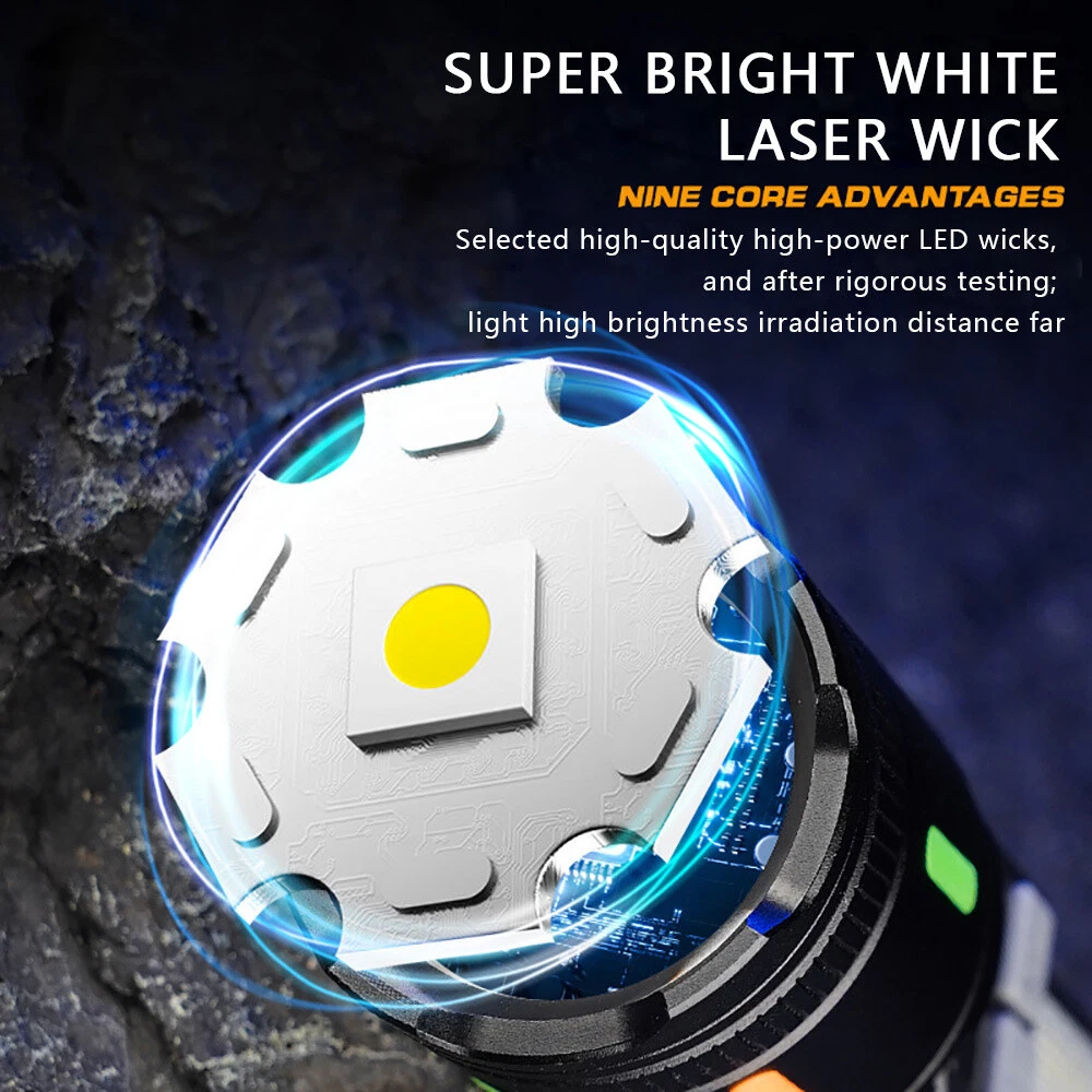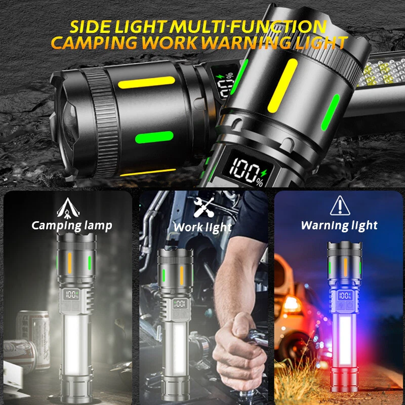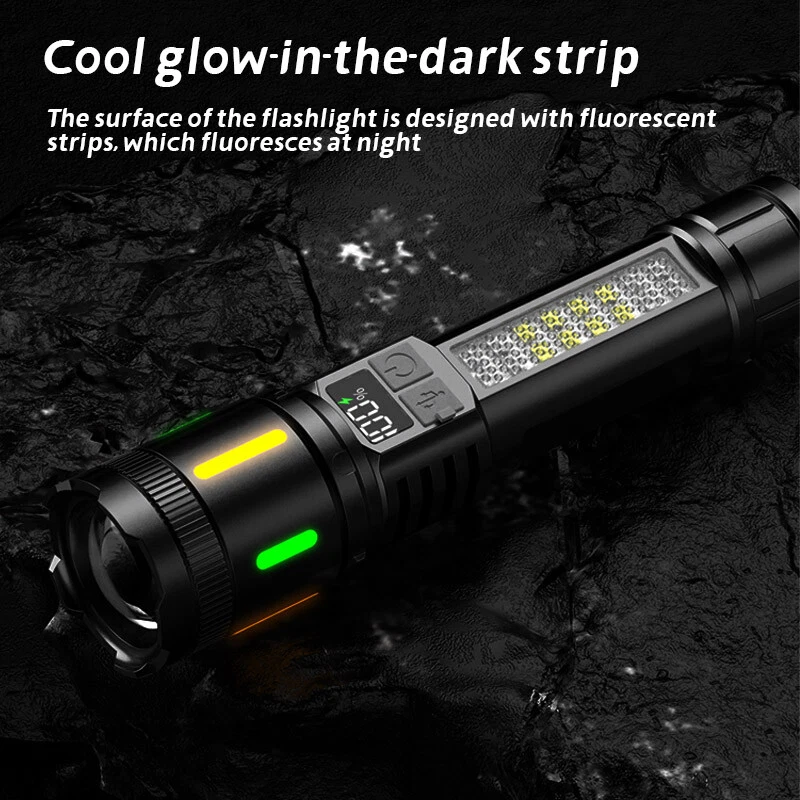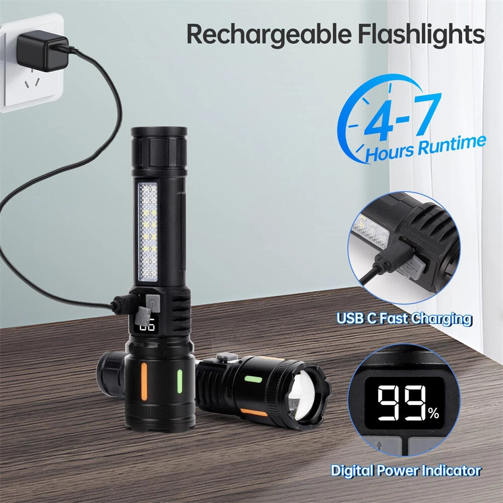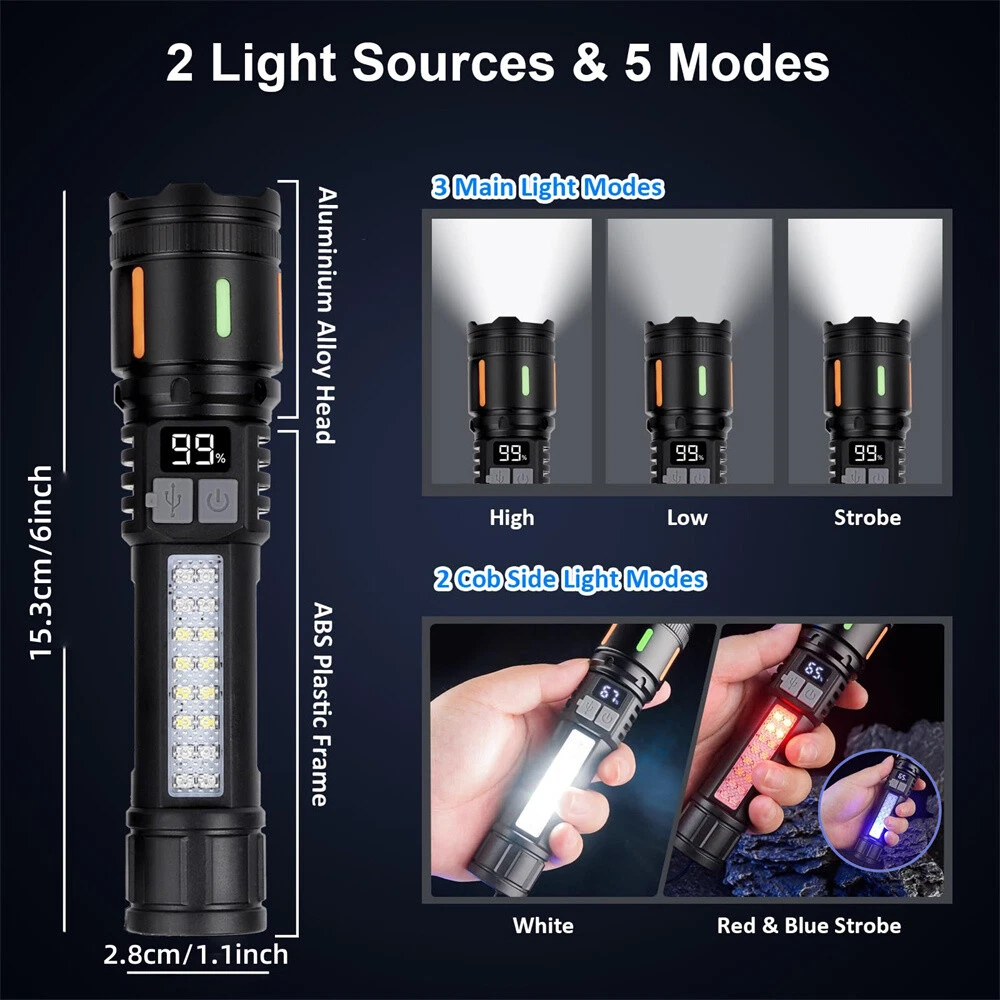 Product Description Description : Super Bright Rechargeable Flashlight: Equipped with upgraded efficient laser Chip LED chips, the rechargeable flashlight emits a stable and super bright lighting. Since the light penetration is stronger than other same-level lamp beads', its beam can pass through dust and fog well, especially suitable for foggy and rainy days with low visibility. 5 Light Modes & Zoomable Focus: There are 5 modes of the rechargeable flashlight: High / Low / Strobe for the main light, and White / Red&Blue Strobe for the COB side light. Equipped with zoomable head, the small rechargeable flashlight high lumens can emit a powerful focused lighting and an extensive extended lighting by adjusting the light head. Fast Charging & Power Indicator: Built-in a rechargeable lithium-ion battery and equipped with more energy-efficient chips, the rechargeable flashlight battery powered working time is up to 7 hours with the low mode. The USB C fast charging input achieves 30% reduction in charging time. It can be charged by power bank, USB plug, etc, with the USB C charging cable. You can clearly see the remaining power at the digital power indicator. IPX6 Waterproof: This flashlight head adopts the high grade black aluminium alloy, and the frame adopts the ABS plastic. The waterproof grade of this flash light reaches IPX6 Waterproof. This rechargeable flashlight is non-slip, shockproof, waterproof, rainproof, dustproof. It can work well in severe outdoor weather conditions, such as rain and snow. It is an ideal outdoor handheld flashlight for working, hiking, camping, repairing, hunting, and Sogidon fishing. Easy to Carry: Led flashlight is equipped with lanyard and pocket clip, which can be hung on your wrist or attach to your pocket , backpack shoulder strap, hat and belt. As its compact design, you carry this small handheld flashlight in your pocket or the car glove compartment. Specification : Product Type: Flashlight Color: Black Weight: 180g Waterproof: IPX6 Working Time: 4-7hrs Charging Time: 3.5-5hrs Material: Aluminum, Plastic Battery Capacity: 3000mAh Power Source: Battery Powered Charging Method: Type-C Charging Size: 15.3*3.5*2.8cm / 6.02*1.38*1.1inch Lighting Mode: 5 Modes(High / Low / Strobe for the main light; White / Red&Blue Strobe for the COB Side Light) Package Included: 1 x Flashlight 1 x USB Cable Note: Due to the different monitor and light effect, the actual color of the item might be slightly different from the color showed on the pictures. Thank you! Please allow 1-2cm measuring deviation due to manual measurement. Payment Shipping Returns Contact Us 1. This is the payment method we can accept: Paypal 2. You can checkout and pay immediately after the auction ends or you complete the purchases. If you need an eBay invoice sent to you by Email, please contact us before making payments. 3. Once the checkout is completed, you will not be able to include any additional purchases. We start to process and fulfill your order once payment is received. New purchases after the checkout will be processed separately. 4. Payments are expected within 4 days after the order is confirmed. Unpaid item (UPI) strike may be filed with eBay upon non-receipt of payment. 1. How much is the shipping & handling (S&H)? Our shipping and handling charges are clearly stated in the Shipping and Payments section of the item page, and we provide Free Shipping for most items. 2. For multiple purchases, the combine shipping discount will be automatically calculated when you check out and pay all of your purchases together. Items checked out separately may not be combined and the combine shipping discount will not be offered automatically. 3. Please make sure the correct Ship-To address is entered before checking out. Once the payment is completed, you may not be able to change the shipping address. We shall not be held responsible for any wrong or undeliverable addresses. 4. We usually ship within 1-2 business days of receiving cleared payment. 1. We put buyer's satisfaction at top priority. If you're not pleased with your purchases, we'll be happy to make an exchange or refund the item total price less Shipping and Handling (S&H) charges within 30 days of your purchases. 2. For any Exchange, Refund or Return, the item must be in its original condition, including the box, packaging, and all the accessories or gifts. 3. We'll provide prepaid return shipping label if the return is a result of our error. Postage reimbursement is offered only on standard mails, and it needs to be approved by our staff prior to returning. 4. Please allow up to 7 business days for returns to be processed. 5. Shipping and Handling (S&H) charges are not refundable. 1. Customer satisfaction is very important to us and our feedback rating reflects this satisfaction. If you have any question or concern, please contact us via eBay message. 2. We respond to all eBay messages as quickly as possible. Though your question will usually be answered very soon, please allow us up to one business day before you start thinking your message is neglected or the reply is avoided, because there would be time difference, non-working hours or public holidays that have prevented us from making an instant response. Payment 1. This is the payment method we can accept: Paypal 2. You can checkout and pay immediately after the auction ends or you complete the purchases. If you need an eBay invoice sent to you by Email, please contact us before making payments. 3. Once the checkout is completed, you will not be able to include any additional purchases. We start to process and fulfill your order once payment is received. New purchases after the checkout will be processed separately. 4. Payments are expected within 4 days after the order is confirmed. Unpaid item (UPI) strike may be filed with eBay upon non-receipt of payment. Shipping 1. How much is the shipping & handling (S&H)? Our shipping and handling charges are clearly stated in the Shippin