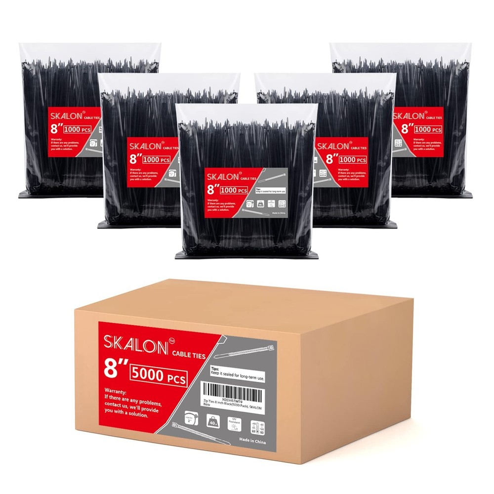 5000 Pack Black Zip Ties - Durable and Versatile for All Your Needs Ensure you never run out of zip ties in the middle of your project with this comprehensive 5000 pack. Perfect for a wide range of applications, these zip ties are designed to meet all your organizational needs. Package Includes: 5000 zip ties Dimensions: Length: 8" Width: 0.14" Max Diameter: 2" Tensile Strength: 40lbs Color: Black Versatile Use: Suitable for both indoor and outdoor applications, ideal for organizing electrical cables in the home, shed, garden, or garage. High Quality Material: Made from durable nylon66, these plastic ties can withstand temperatures from -40℉ to 185℉ and are both weather and UV resistant. Warranty: Enjoy peace of mind with a 1-year warranty. Receive a full refund if any quality issues arise within the warranty period.