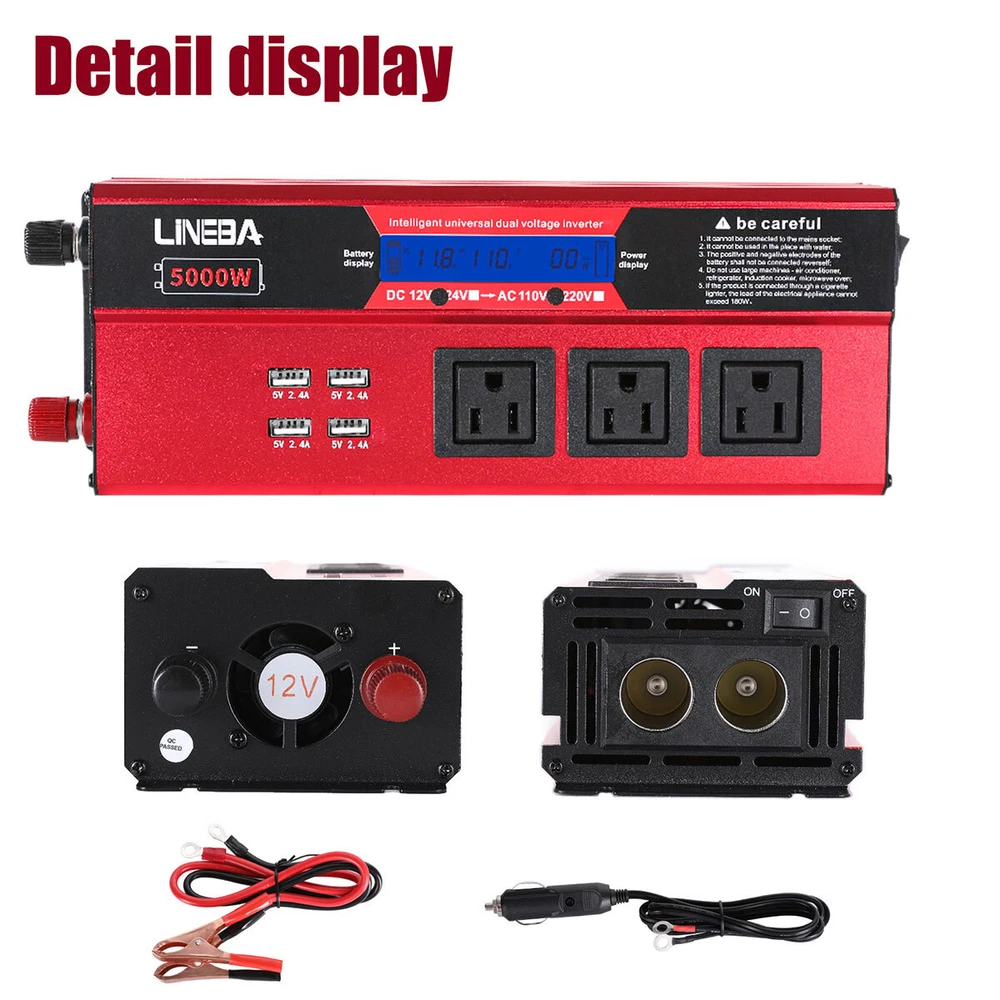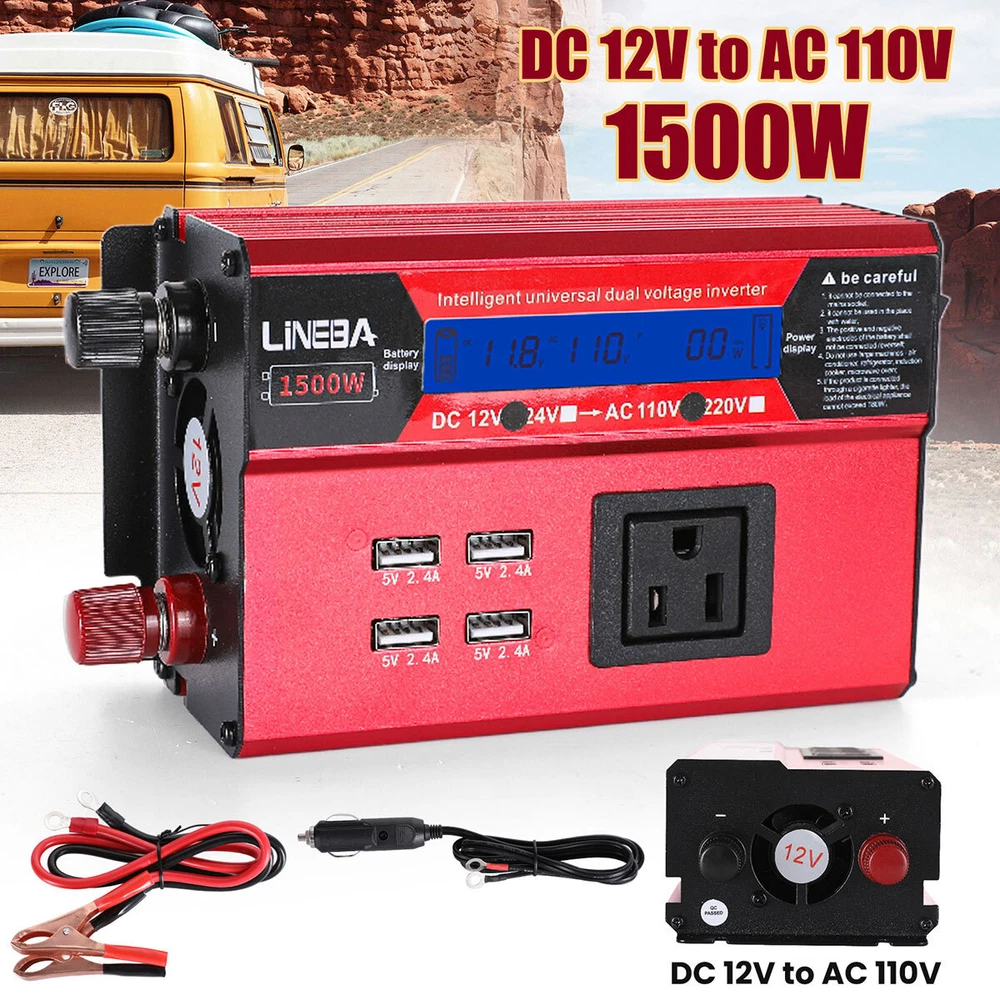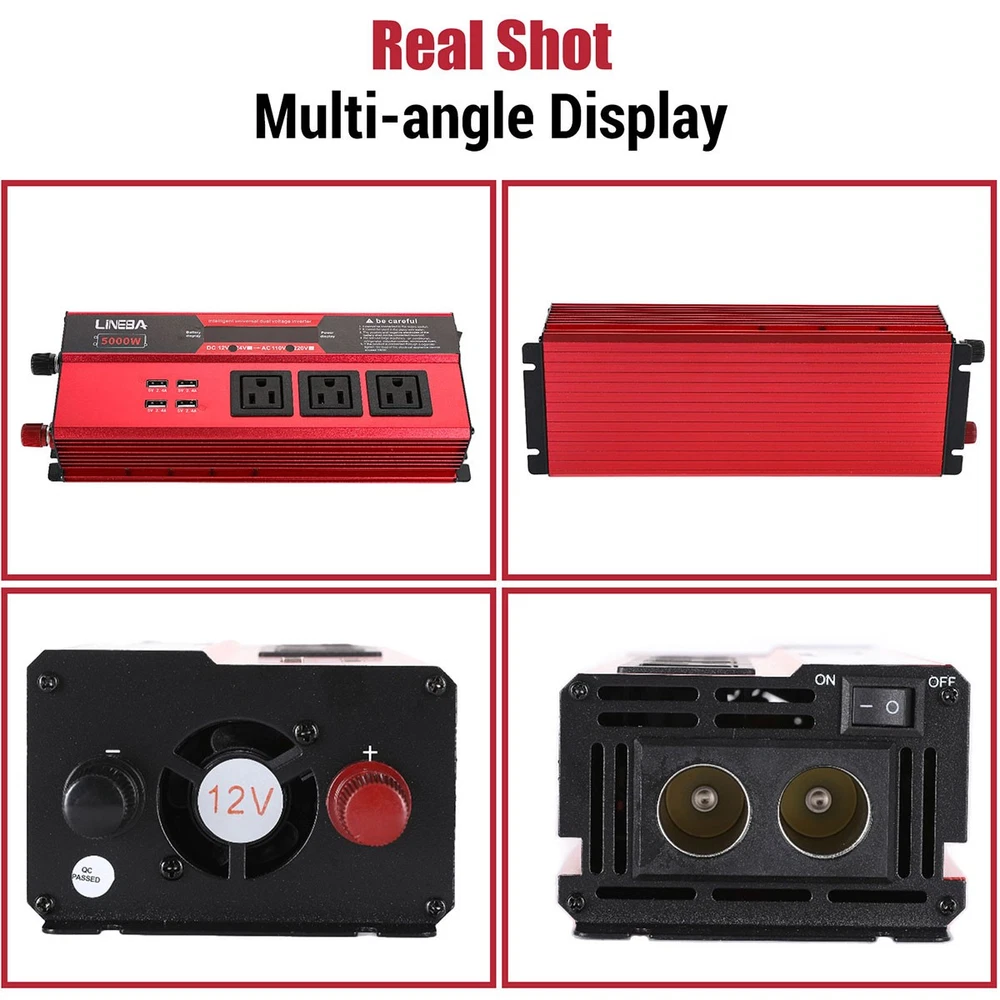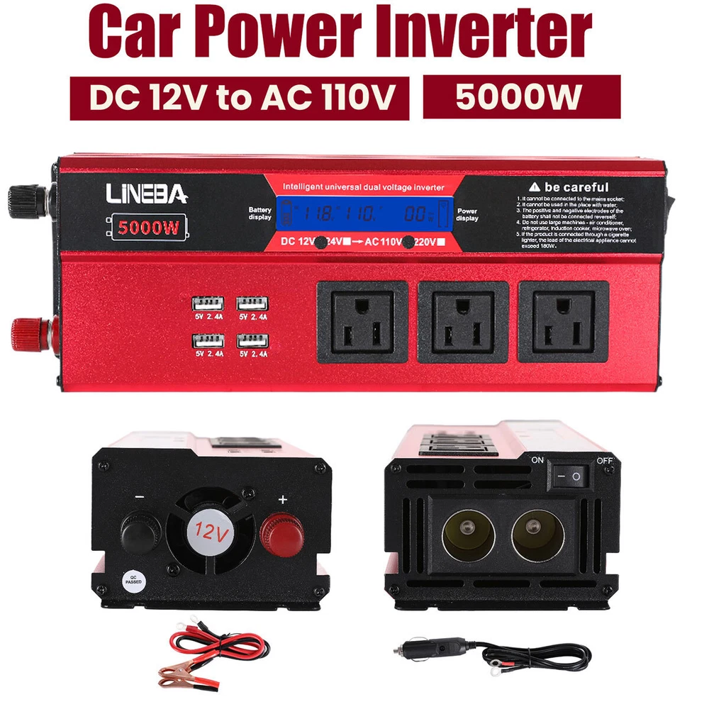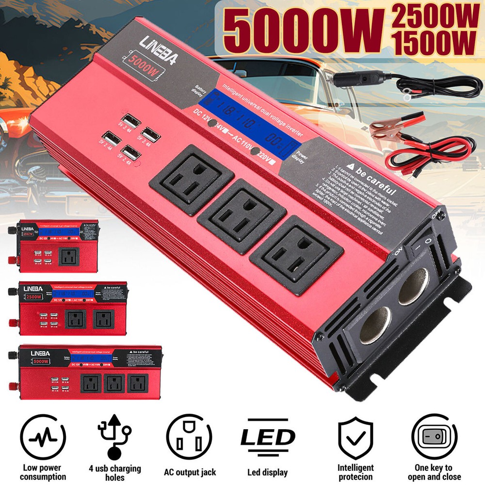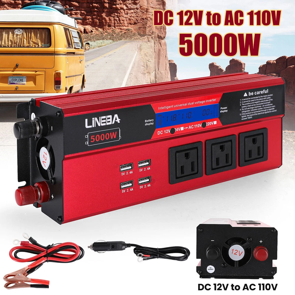 5000W Power Inverter Modified Sine Wave DC 12V to AC 110V Solar Converter 4 USB 5000W Power Inverter Modified Sine Wave DC 12V to AC 110V Solar Converter 4 USB 100% Brand New & Excellent quality ✈️ Free & fast shipping, with tracking number provided ANY PROBLEM please email us before leaving feedback Feature: * 5000W High-power Inverter: Provides 900W continuous modified sine wave power and 5000W peak power. The inverter can convert DC 12V battery power into AC 110V. * 2500W High-power Inverter: Provides 500W continuous modified sine wave power and 2500W peak power. The inverter can convert DC 12V battery power into AC 110V. * 1500W High-power Inverter: Provides 350W continuous modified sine wave power and 1500W peak power. The inverter can convert DC 12V battery power into AC 110V. * 4 USB Charging Ports: The inverter comes with two cigarette lighting holes, three universal socket, four 5V USB charging ports, which can be used to charge multiple machines, manual switch control, very convenient. * Intelligent LED Display: Displays input and output voltages, can monitor battery capacity and load capacity in real time, and easily understands the battery full, normal or empty status. * Built-in Cooling Fan: The inverter has a built-in cooling fan with low noise, comes with a pair of battery cables, is easy to use, and has overvoltage, overload, overcurrent, overheating, and short circuit protection. * Widely Used: Can be used for charging lamps, fans, printers, computers, TVs, DVD players, household appliances, heaters, rice cookers, juicers, hand drills, etc. It is a must-have for self-driving tours, vacation trips, outdoor activities, emergency kits, etc. Specifications: 5000W【3 AC Outlet & 4 USB】 Color: Red Material: Aluminum Alloy Rated Power: 900W Peak Power: 5000W Input voltage: 12V Output voltage: 110V±5% Output frequency: 50Hz Output waveform: Modified sine wave No-load loss: <0.2A Conversion efficiency: >95% Low voltage alarm: 10V±0.2V Low voltage shutdown: 9.5V±0.2V High voltage shutdown: 15.5V±0.2V USB: 5V/2.4A Display: LCD color screen Charging port: 4 USB ports Over-temperature protection: 55°C-75°C Working temperature: 0°C-40°C Product size:280*102*65mm/11.0*4*2.55inch 2500W【2 AC Outlet & 4 USB】 Color: Red Material: Aluminum Alloy Rated Power: 500W Peak Power: 2500W Input voltage: 12V Output voltage: 110V±5% Output frequency: 50Hz Output waveform: Modified sine wave No-load loss: <0.2A Conversion efficiency: >95% Low voltage alarm: 10V±0.2V Low voltage shutdown: 9.5V±0.2V High voltage shutdown: 15.5V±0.2V USB: 5V/2.4A Display: LCD color screen Charging port: 4 USB ports Over-temperature protection: 55°C-75°C Working temperature: 0°C-40°C Product size:235*102*65mm/9.2*4*2.55inch 1500W【1 AC Outlet & 4 USB】 Color: Red Material: Aluminum Alloy Rated Power: 350W Peak Power: 1500W Input voltage: 12V Output voltage: 110V±5% Output frequency: 50Hz Output waveform: Modified sine wave No-load loss: <0.2A Conversion efficiency: >95% Low voltage alarm: 10V±0.2V Low voltage shutdown: 9.5V±0.2V High voltage shutdown: 15.5V±0.2V USB: 5V/2.4A Display: LCD color screen Charging port: 4 USB ports Over-temperature protection: 55°C-75°C Working temperature: 0°C-40°C Product size:185*102*65mm/7.28*4*2.55inch Package include: 1 x Vehicle Inverter 1 x Manual 2 x Clip Wire 1 x Cigarette Lighter Head 1 x Packing Box Payment Shipment Return Feedback Contact us Payment * We Accept Payment via PAYPAL ONLY . * Payment Must be Made within 4 Days of Auction Closing. * Non-Payment may Result in a UPI (Unpaid Item) being Put on Your Account. eBay will Automatically Close Your Account if You Accumulate 4 UPI's total. * Please List Your Special Requests ( Color, Size, Packages, etc. ) in the PAYPAL NOTES SECTION when you make payment. Shipment * Shipping will be handled in 24 business hours after payment got. Ship to PayPal Address only , please confirm it before paying. * Please leave your phone number in the address in case there is an address problem. Return * Returns and Exchange accepted within 60 Days. * Refund will be given as Money Back. * Free Return shipping. * Before you return the defective item,please email us for the RMA, and we will reply you in 24 hours in working days. If you do not get reply please check if your mail box has refused our reply or not, then send to us again, thanks! Feedback If you are satisfied with the transaction please remember to leave us a positive feedback (5-Star) will be much appreciated. Please DO remember to contact us before leaving the neutral (3 stars) , negative feedback (1-2 stars) or opening a case/dispute if any problem caused by the item . Normally your email would get replied within 24 hours on working day and your issue would be followed up carefully until we've reached a consensus! We will try our best to solve the problem and leave you a happy shopping mood here. Thank you! We are not only selling good items, but also selling with excellent after-sale service and a strong sense of responsibility. We will always try our best to find you a satisfactory solution if any problem takes place! Contact us Email muchbuy-outlet at Paypal registered email or ebay message. On Aug 9, 2025 at 19:06:19 PDT, seller added the following information: