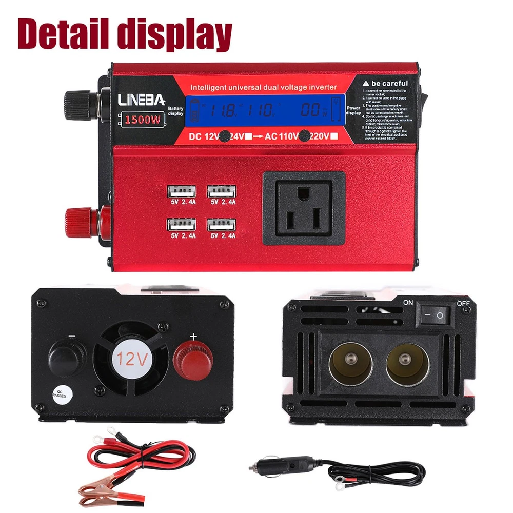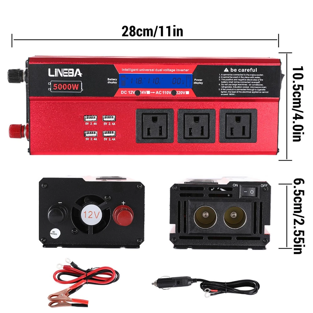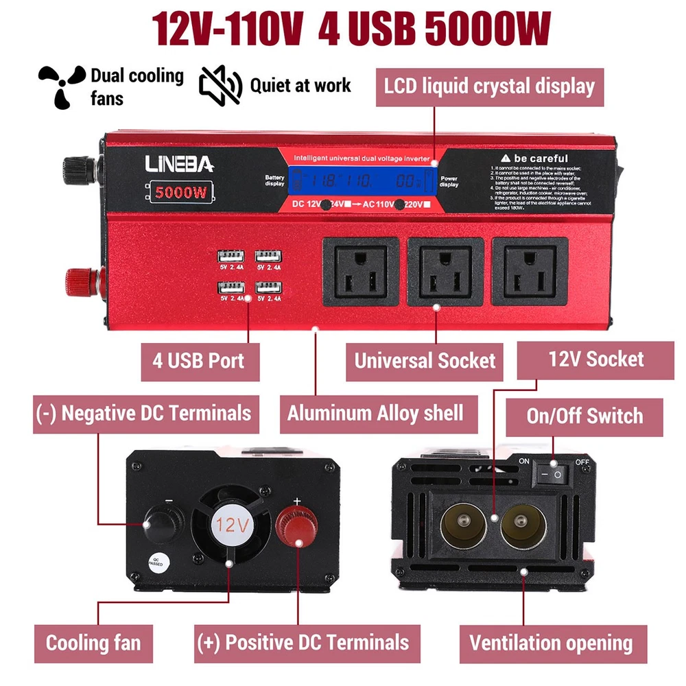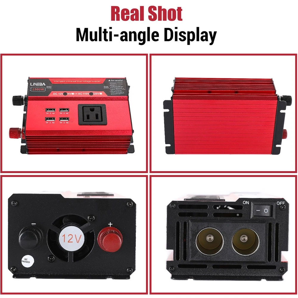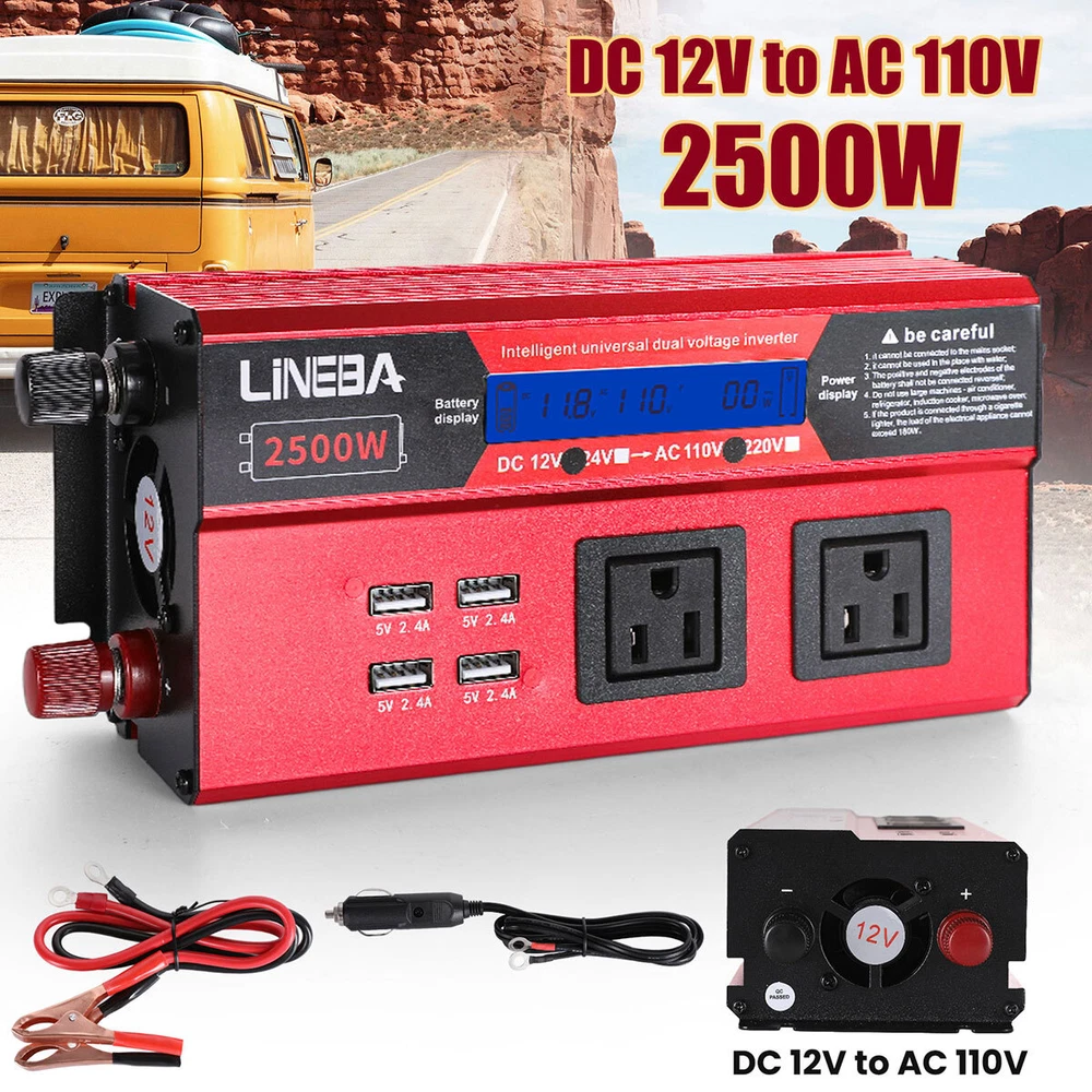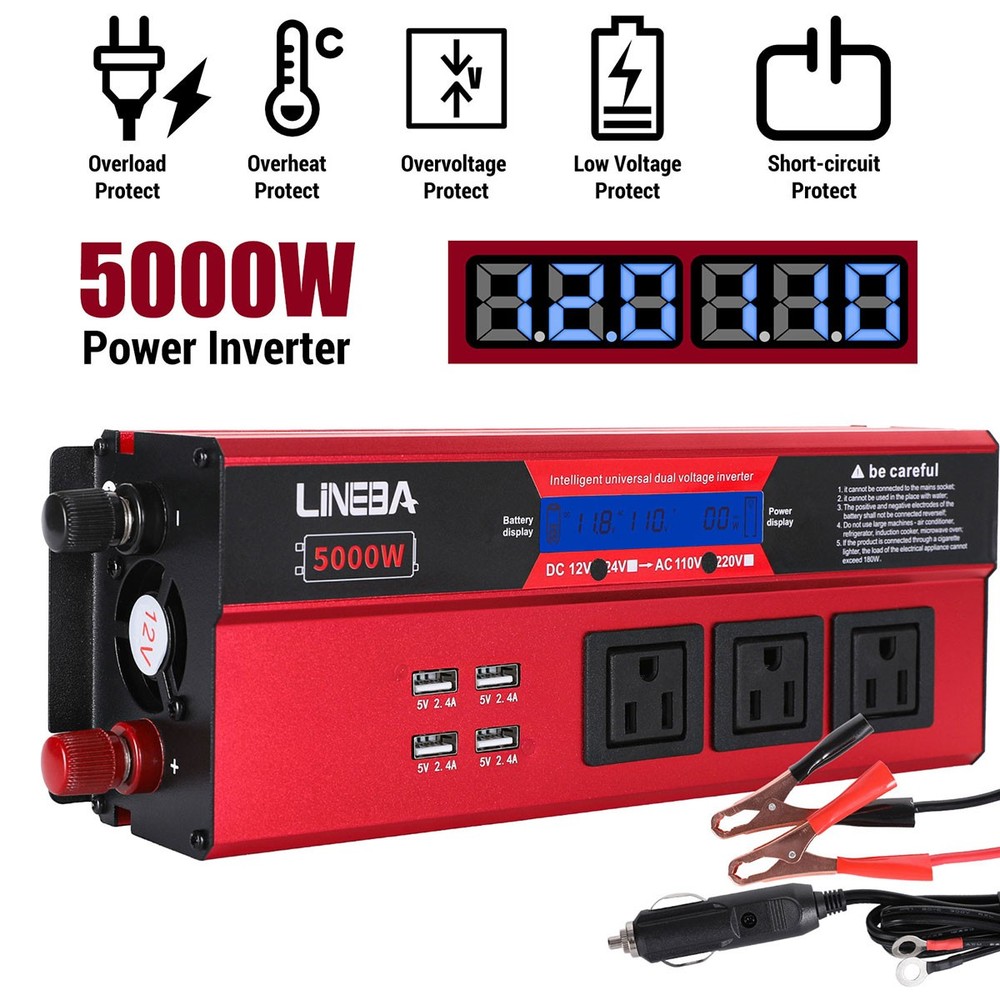 5000W Power Inverter Modified Sine Wave DC 12V to AC 110V Solar Converter 4 USB 5000W Power Inverter Modified Sine Wave DC 12V to AC 110V Solar Converter 4 USB 100% Brand New & Excellent quality ✈️ Free & fast shipping, with tracking number provided ANY PROBLEM please email us before leaving feedback Feature: * 5000W High-power Inverter: Provides 900W continuous modified sine wave power and 5000W peak power. The inverter can convert DC 12V battery power into AC 110V. * 2500W High-power Inverter: Provides 500W continuous modified sine wave power and 2500W peak power. The inverter can convert DC 12V battery power into AC 110V. * 1500W High-power Inverter: Provides 350W continuous modified sine wave power and 1500W peak power. The inverter can convert DC 12V battery power into AC 110V. * 4 USB Charging Ports: The inverter comes with two cigarette lighting holes, three universal socket, four 5V USB charging ports, which can be used to charge multiple machines, manual switch control, very convenient. * Intelligent LED Display: Displays input and output voltages, can monitor battery capacity and load capacity in real time, and easily understands the battery full, normal or empty status. * Built-in Cooling Fan: The inverter has a built-in cooling fan with low noise, comes with a pair of battery cables, is easy to use, and has overvoltage, overload, overcurrent, overheating, and short circuit protection. * Widely Used: Can be used for charging lamps, fans, printers, computers, TVs, DVD players, household appliances, heaters, rice cookers, juicers, hand drills, etc. It is a must-have for self-driving tours, vacation trips, outdoor activities, emergency kits, etc. Specifications: 5000W【3 AC Outlet & 4 USB】 Color: Red Material: Aluminum Alloy Rated Power: 900W Peak Power: 5000W Input voltage: 12V Output voltage: 110V±5% Output frequency: 50Hz Output waveform: Modified sine wave No-load loss: <0.2A Conversion efficiency: >95% Low voltage alarm: 10V±0.2V Low voltage shutdown: 9.5V±0.2V High voltage shutdown: 15.5V±0.2V USB: 5V/2.4A Display: LCD color screen Charging port: 4 USB ports Over-temperature protection: 55°C-75°C Working temperature: 0°C-40°C Product size:280*102*65mm/11.0*4*2.55inch 2500W【2 AC Outlet & 4 USB】 Color: Red Material: Aluminum Alloy Rated Power: 500W Peak Power: 2500W Input voltage: 12V Output voltage: 110V±5% Output frequency: 50Hz Output waveform: Modified sine wave No-load loss: <0.2A Conversion efficiency: >95% Low voltage alarm: 10V±0.2V Low voltage shutdown: 9.5V±0.2V High voltage shutdown: 15.5V±0.2V USB: 5V/2.4A Display: LCD color screen Charging port: 4 USB ports Over-temperature protection: 55°C-75°C Working temperature: 0°C-40°C Product size:235*102*65mm/9.2*4*2.55inch 1500W【1 AC Outlet & 4 USB】 Color: Red Material: Aluminum Alloy Rated Power: 350W Peak Power: 1500W Input voltage: 12V Output voltage: 110V±5% Output frequency: 50Hz Output waveform: Modified sine wave No-load loss: <0.2A Conversion efficiency: >95% Low voltage alarm: 10V±0.2V Low voltage shutdown: 9.5V±0.2V High voltage shutdown: 15.5V±0.2V USB: 5V/2.4A Display: LCD color screen Charging port: 4 USB ports Over-temperature protection: 55°C-75°C Working temperature: 0°C-40°C Product size:185*102*65mm/7.28*4*2.55inch Package include: 1 x Vehicle Inverter 1 x Manual 2 x Clip Wire 1 x Cigarette Lighter Head 1 x Packing Box Payment Shipment Return Feedback Contact us Payment * We Accept Payment via PAYPAL ONLY . * Payment Must be Made within 4 Days of Auction Closing. * Non-Payment may Result in a UPI (Unpaid Item) being Put on Your Account. eBay will Automatically Close Your Account if You Accumulate 4 UPI's total. * Please List Your Special Requests ( Color, Size, Packages, etc. ) in the PAYPAL NOTES SECTION when you make payment. Shipment * Shipping will be handled in 24 business hours after payment got. Ship to PayPal Address only , please confirm it before paying. * Please leave your phone number in the address in case there is an address problem. Return * Returns and Exchange accepted within 60 Days. * Refund will be given as Money Back. * Free Return shipping. * Before you return the defective item,please email us for the RMA, and we will reply you in 24 hours in working days. If you do not get reply please check if your mail box has refused our reply or not, then send to us again, thanks! Feedback If you are satisfied with the transaction please remember to leave us a positive feedback (5-Star) will be much appreciated. Please DO remember to contact us before leaving the neutral (3 stars) , negative feedback (1-2 stars) or opening a case/dispute if any problem caused by the item . Normally your email would get replied within 24 hours on working day and your issue would be followed up carefully until we've reached a consensus! We will try our best to solve the problem and leave you a happy shopping mood here. Thank you! We are not only selling good items, but also selling with excellent after-sale service and a strong sense of responsibility. We will always try our best to find you a satisfactory solution if any problem takes place! Contact us Email muchbuy-outlet at Paypal registered email or ebay message. On Aug 9, 2025 at 19:06:19 PDT, seller added the following information: